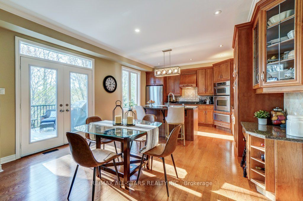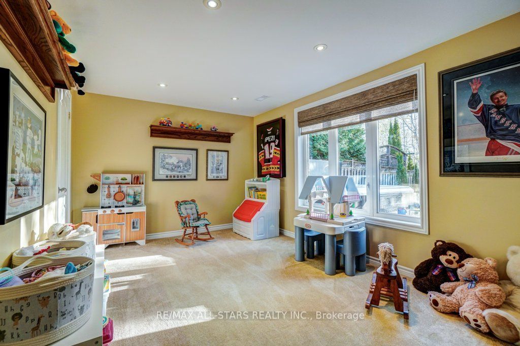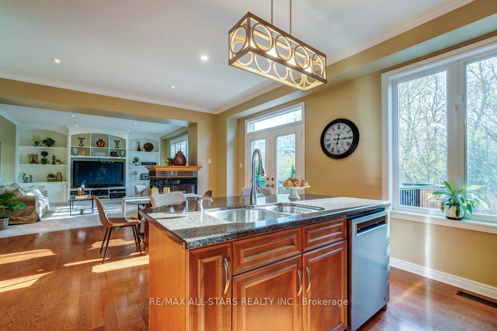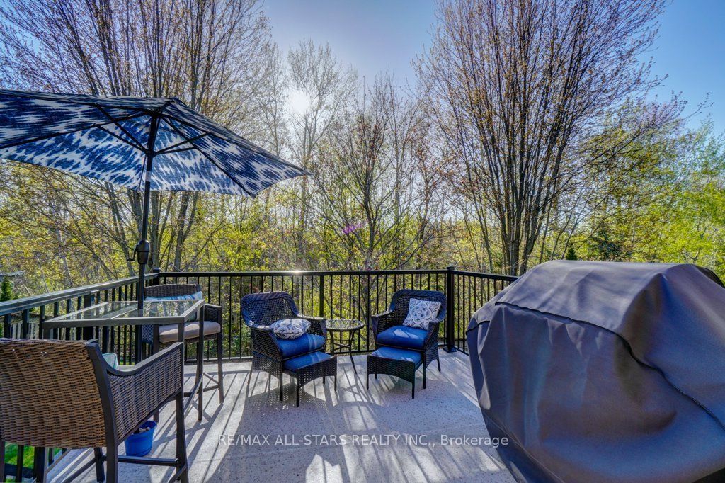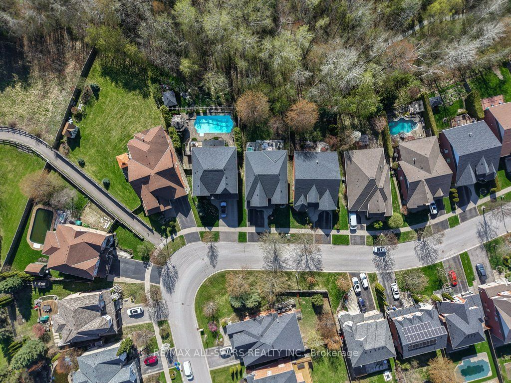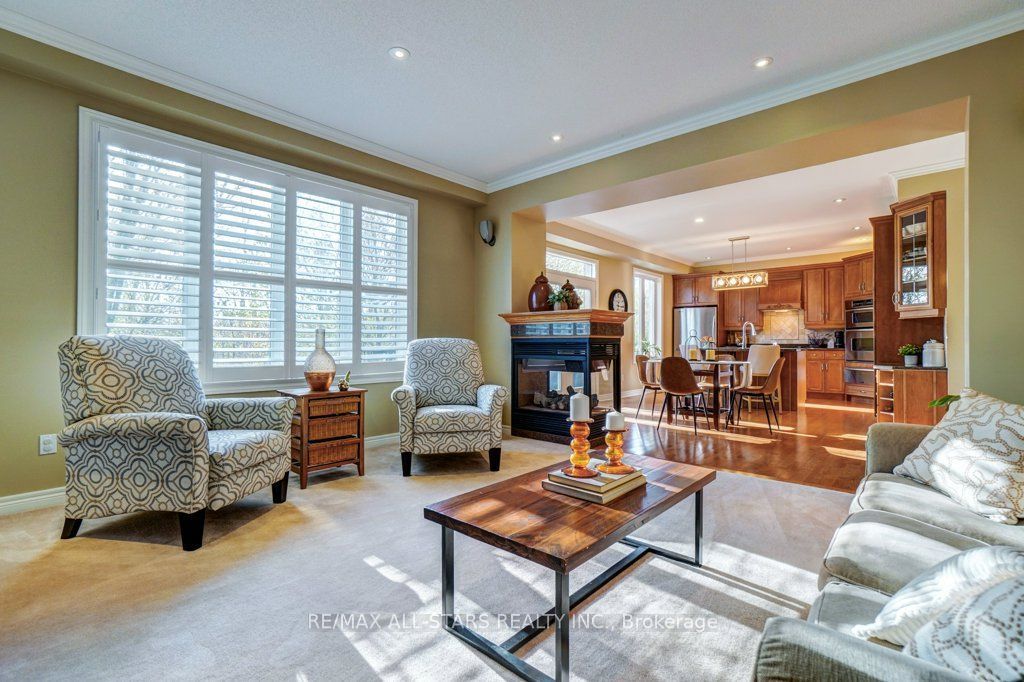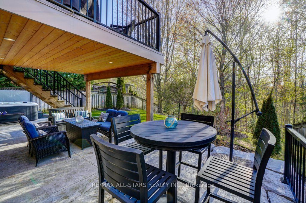 Set in one of uxbridge's most coveted golf course communities, this exceptional 3-car garage executive home blends luxury, lifestyle, and an unbeatable location. It backs onto lush green space & forest, with direct access to scenic trails and within walking distance to shops, schools, and town amenities. Upon entry, the main floor impresses with 9' ceilings and crown mouldings throughout with a dramatic 2-storey foyer open to the upper level. The living room features large bow windows and california shutters; the formal dining room is accented with a coffered ceiling & pillar columns. The open concept gourmet kitchen offers custom cabinetry, granite counters, a tumbled marble backsplash, s/s appliances with counter cooktop, built-in oven, microwave & warming drawer, hardwood floors, and a 3-sided gas fireplace connecting to the family room featuring custom built-ins. Double garden doors with a retractable screen leads to a large deck with forest views. Upstairs, the primary suite includes double entry doors, a walk-in custom closet, & a 5-pc ensuite with a jacuzzi tub. Two bedrooms share a jack & jill 4-pc bath, while the fourth offers its own ensuite, bay windows with a vaulted ceiling & built-in desk area. The bright, walkout basement includes oversized windows, a kitchenette with custom cabinetry, an eating area, dishwasher, sink, and fridge; plus a rec room and play area perfect for in-laws and extended family. The playroom features a large above-grade window and could easily be converted into an additional bedroom (by adding one wall) offering excellent potential for a full in-law suite conversion. Walk out to a covered patio and professionally landscaped backyard with a sprinkler system, hot tub, deck with lighting, and mature gardens. Additional features include: nest thermostat + doorbell, privacy fencing with gate access, 2018 furnace & ac, 2017 shingles, 200 amp service, water softener(owned) & a professionally landscaped front yard with sprinkler system.