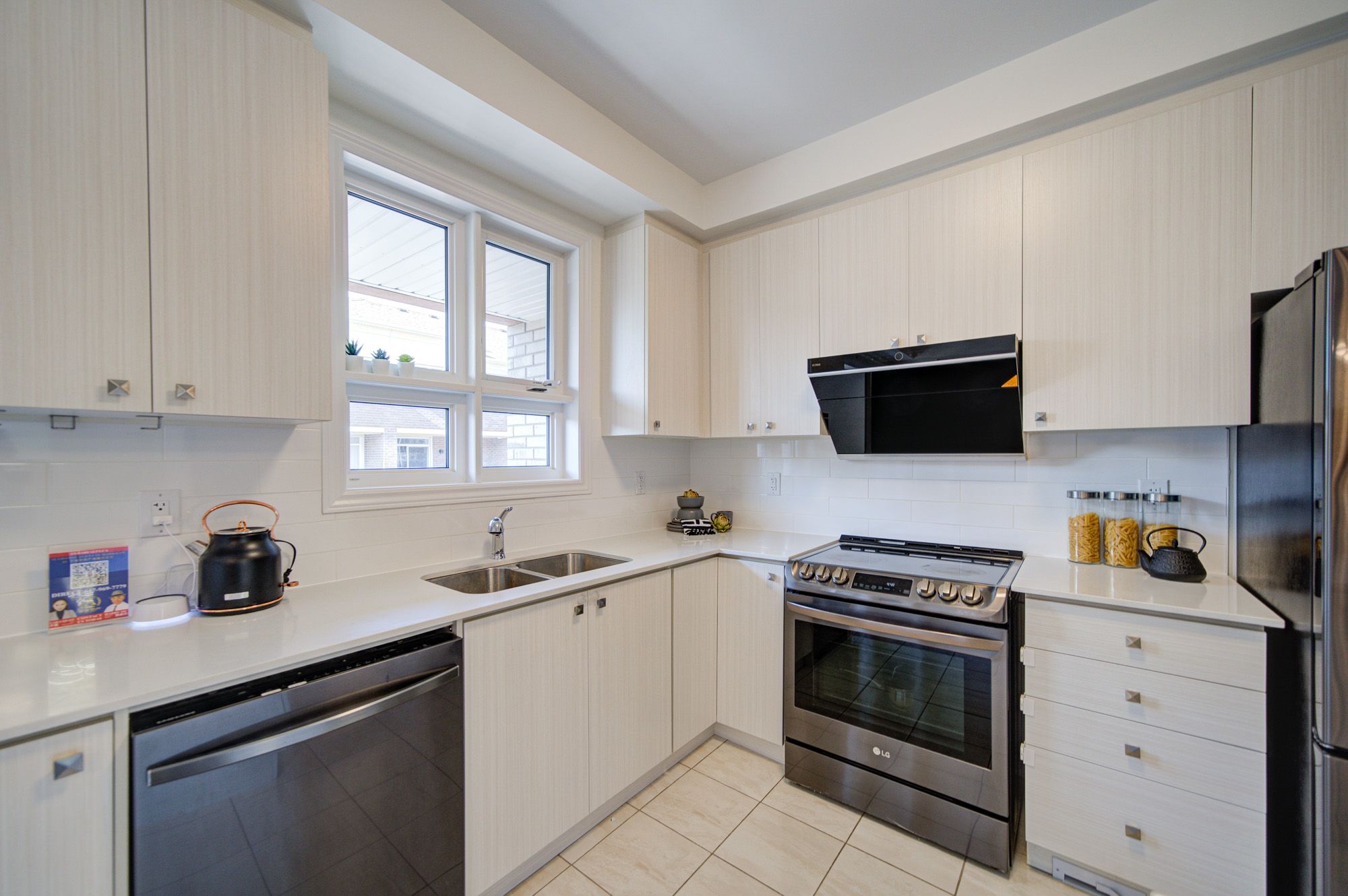 • Modern kitchen with quartz countertops and stainless steel appliances.