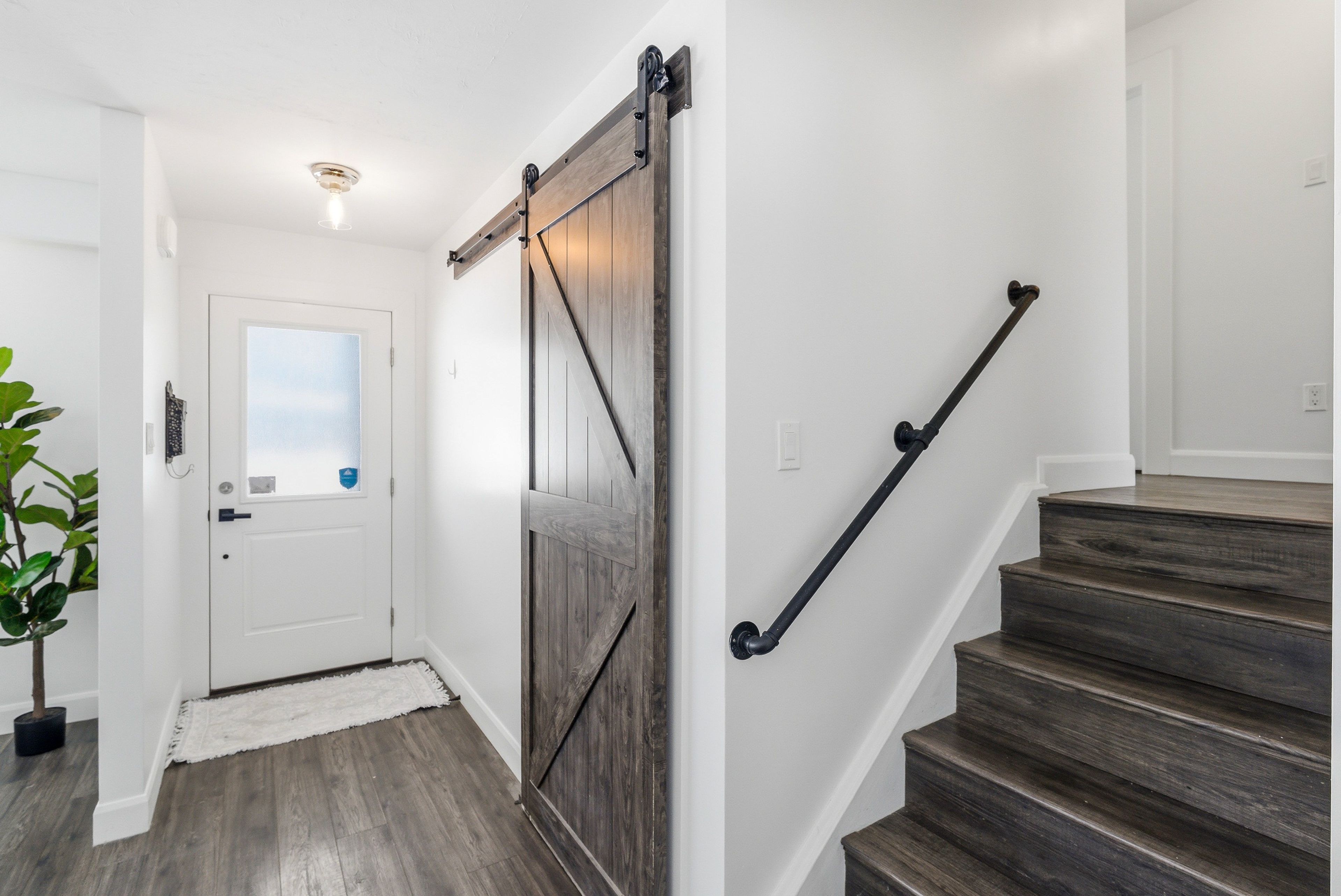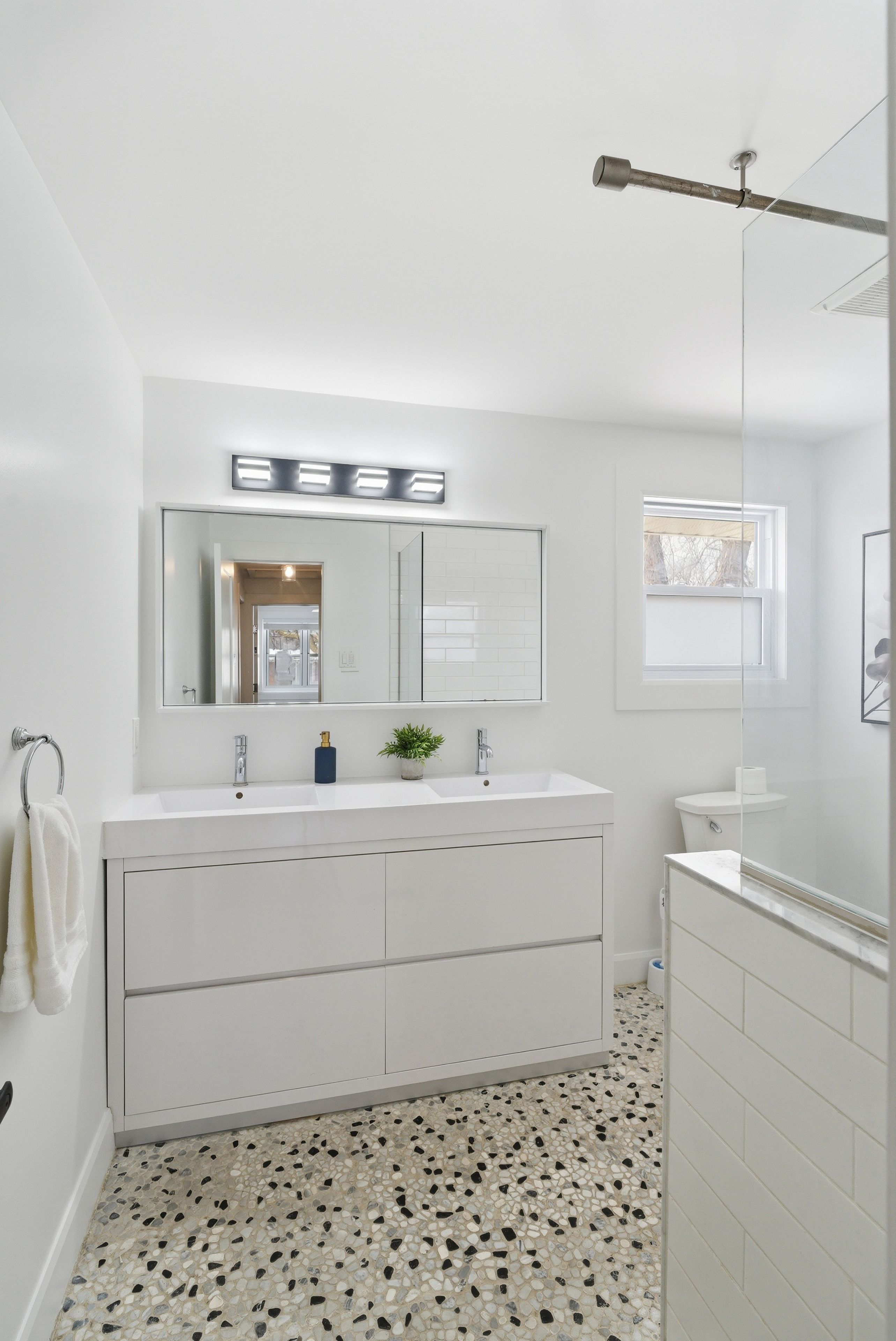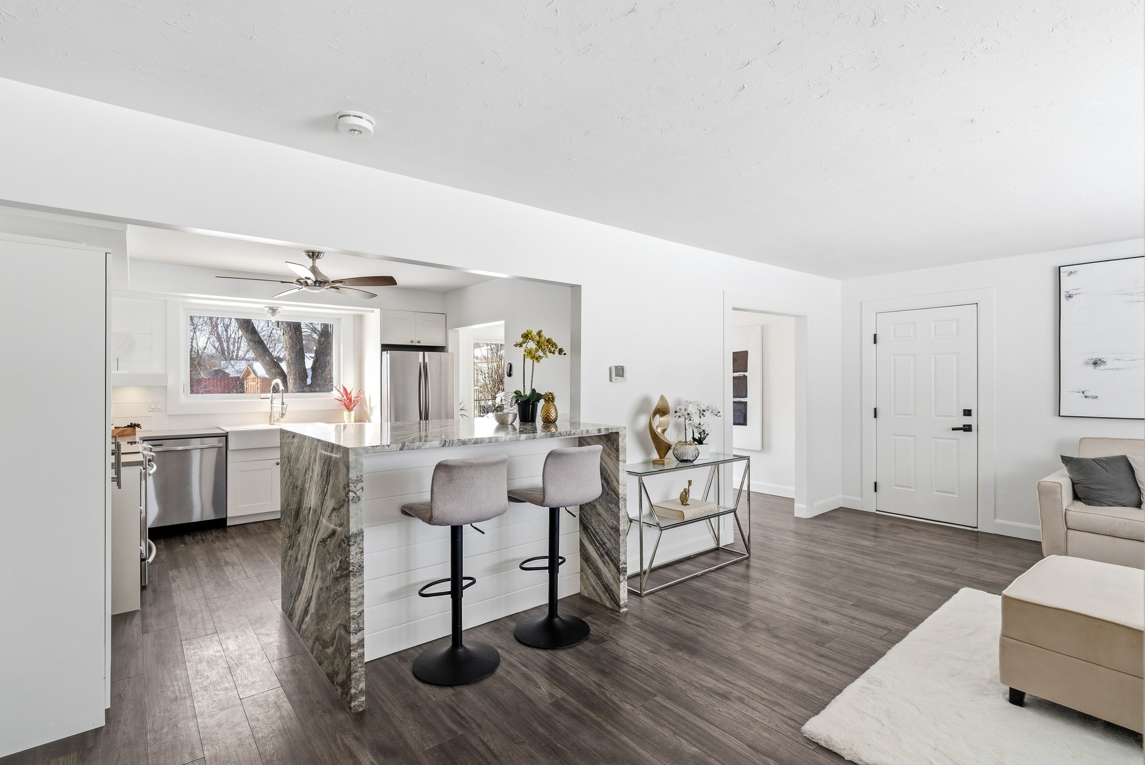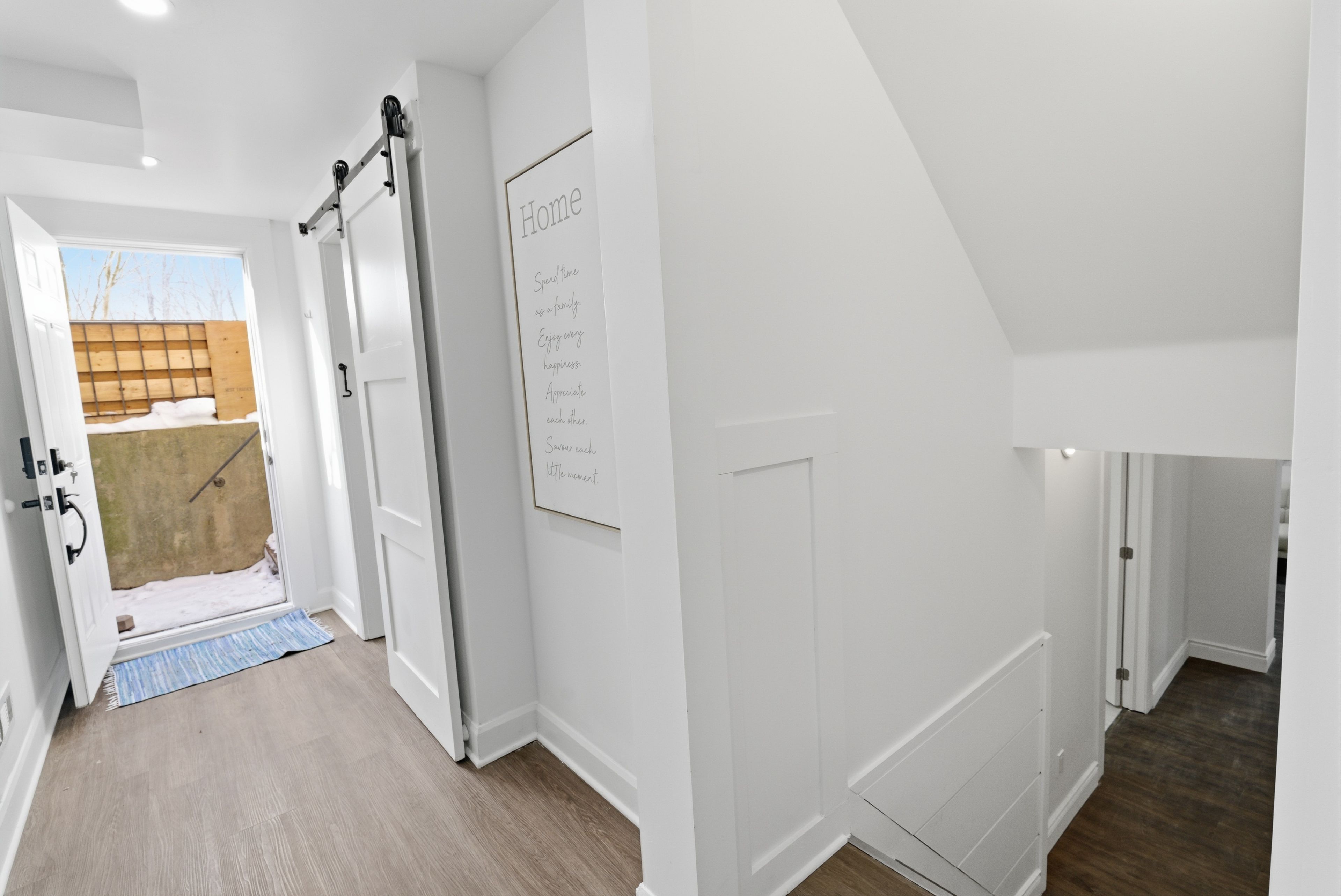 • Upper level features three bedrooms and a modern kitchen with granite.