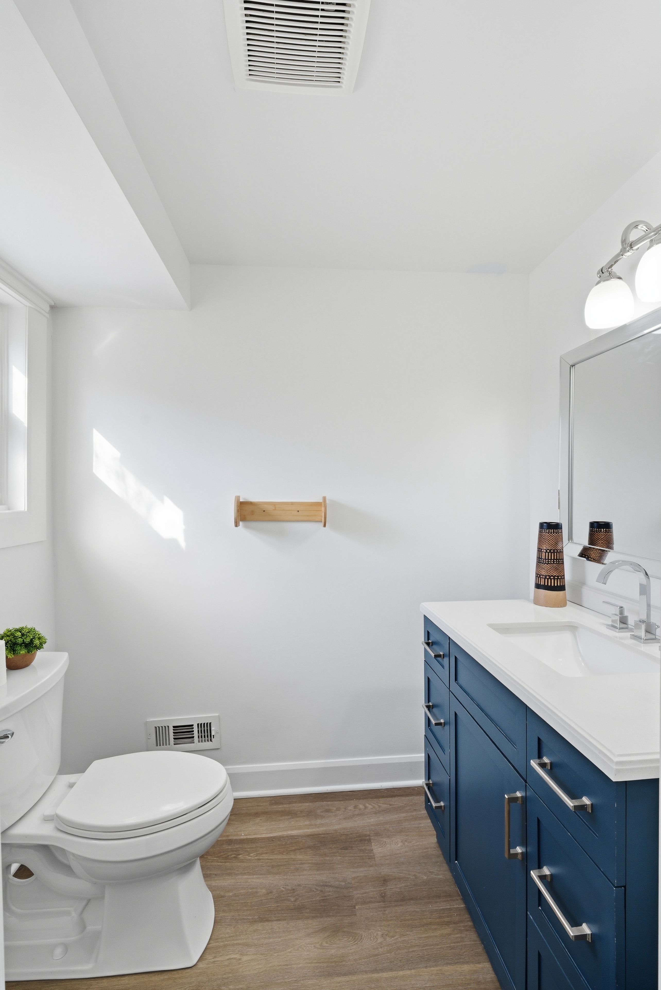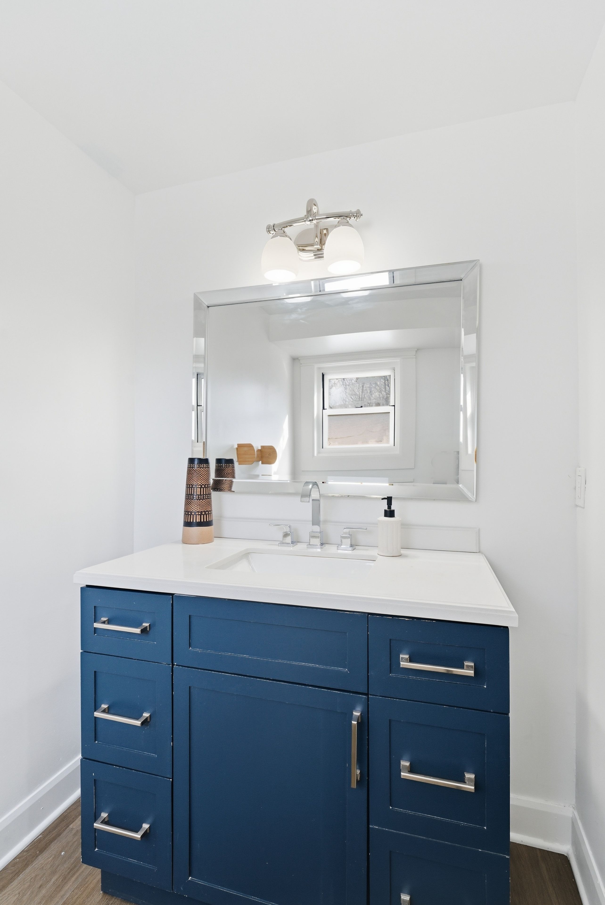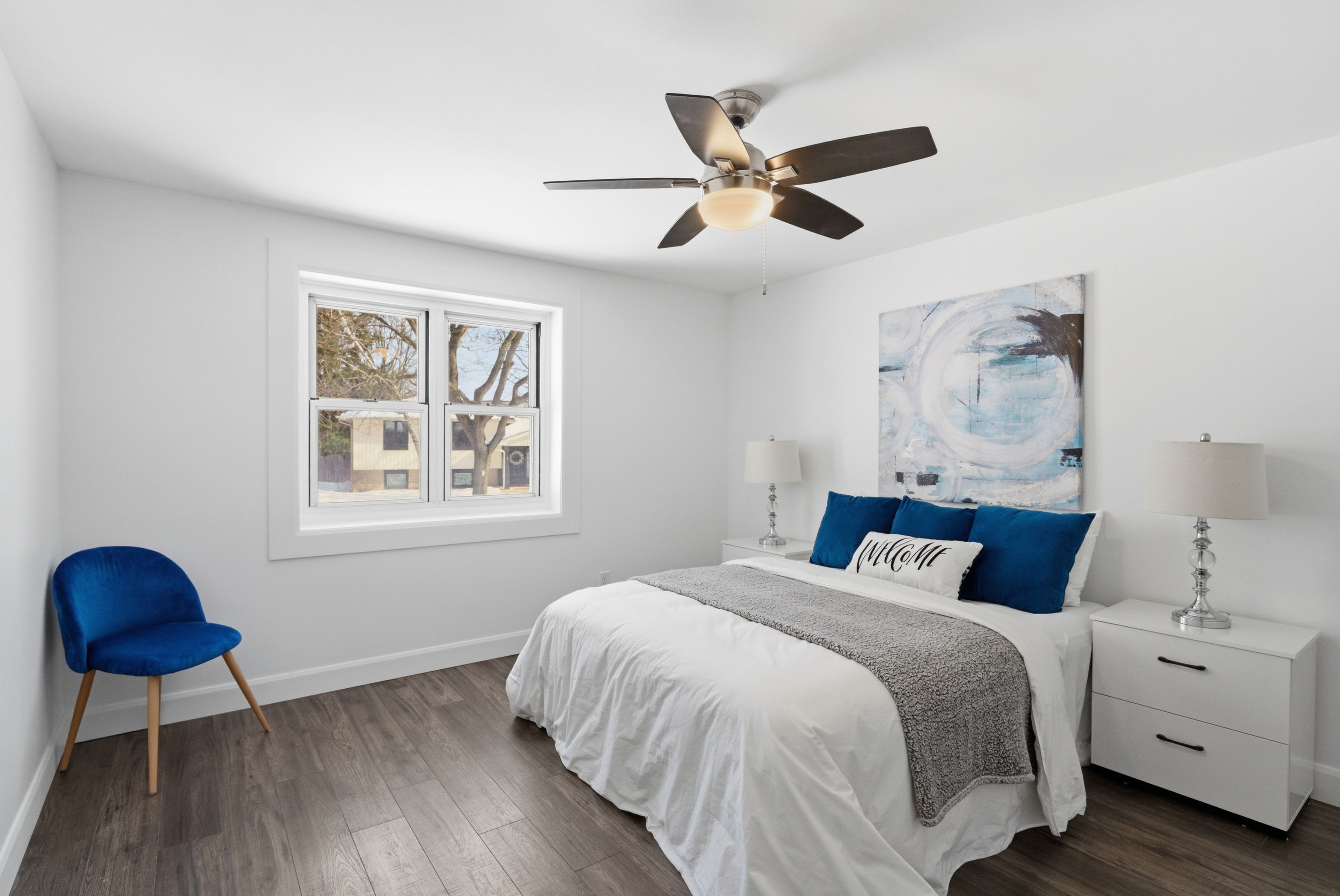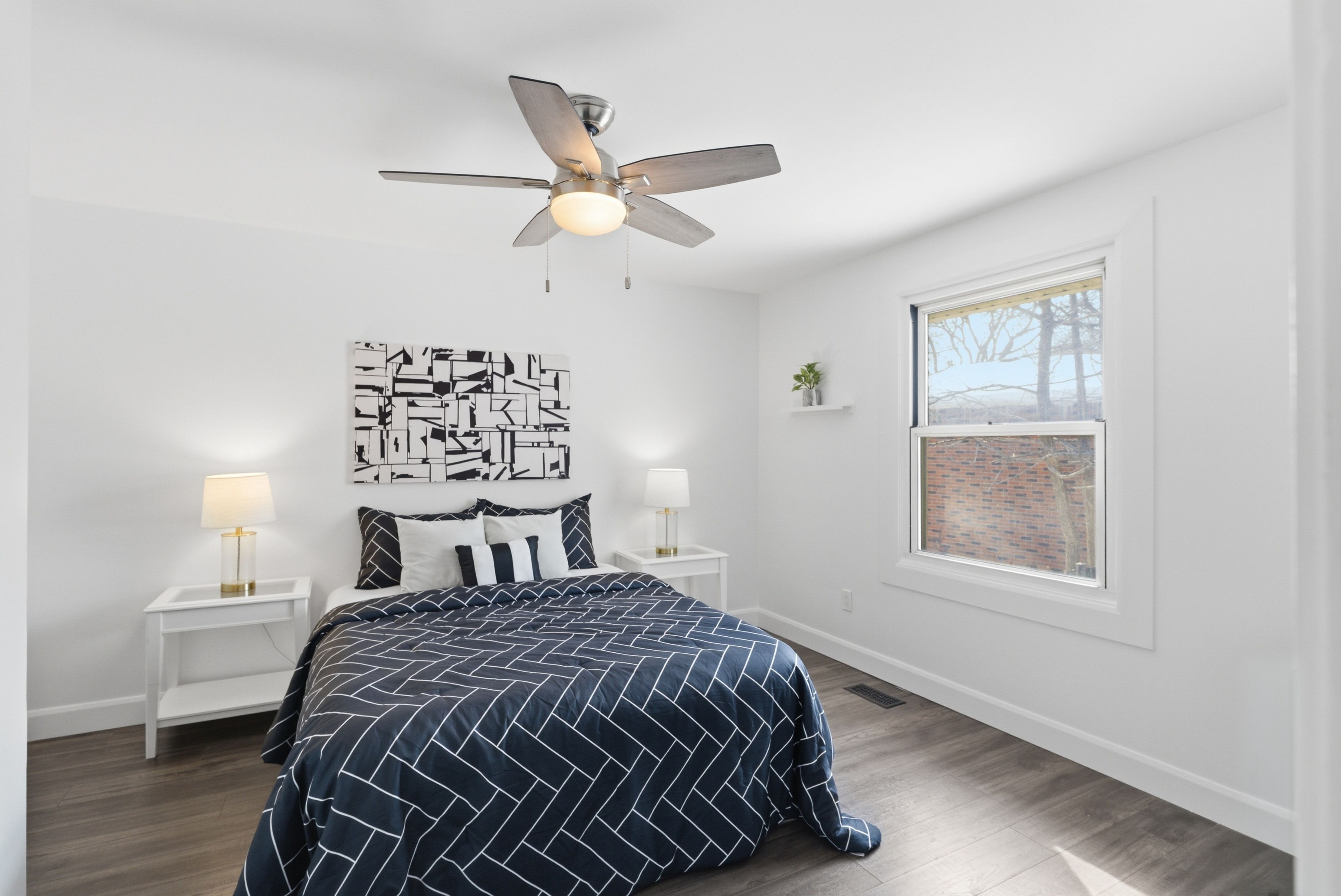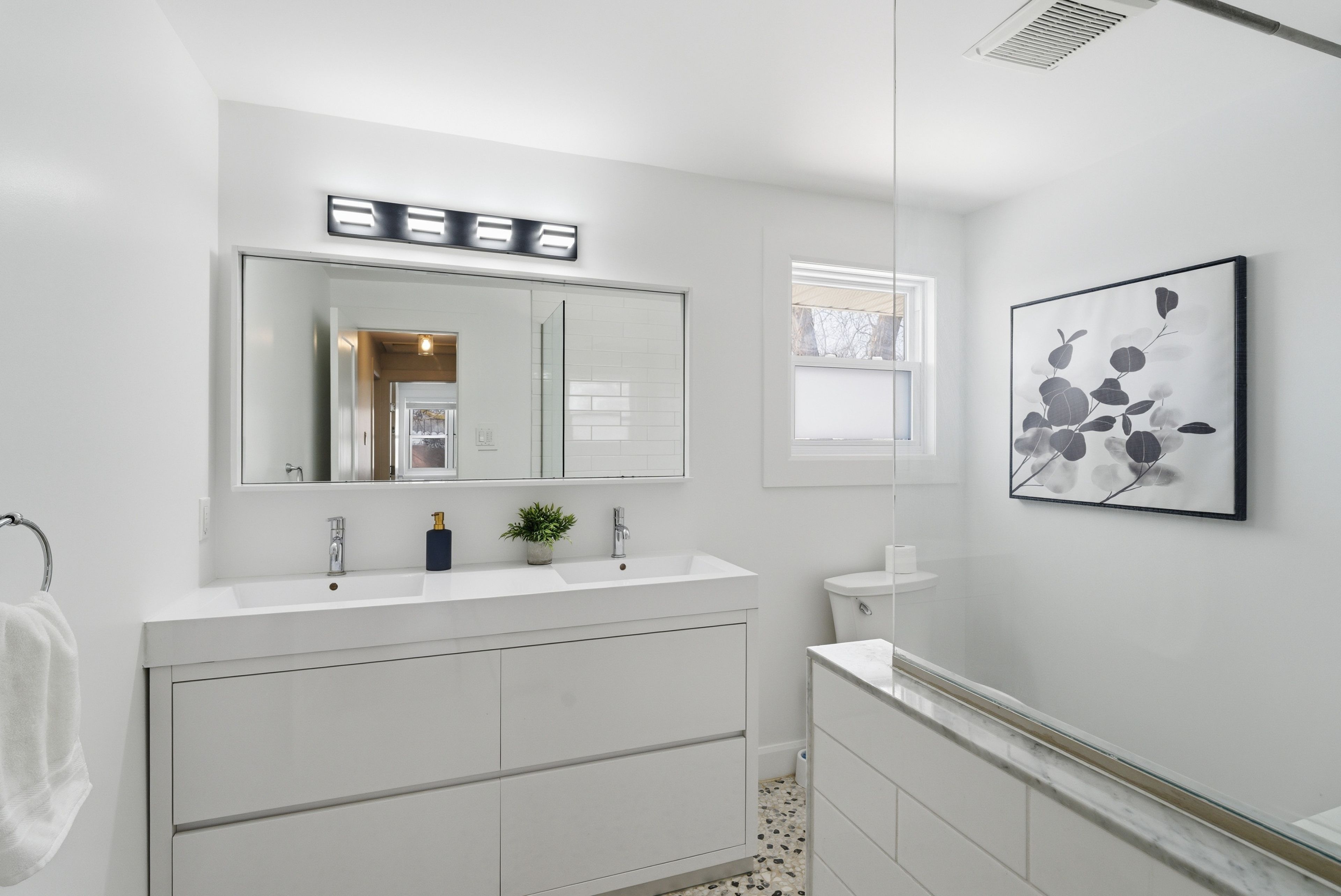 • Upper level features three bedrooms and a modern kitchen with granite.