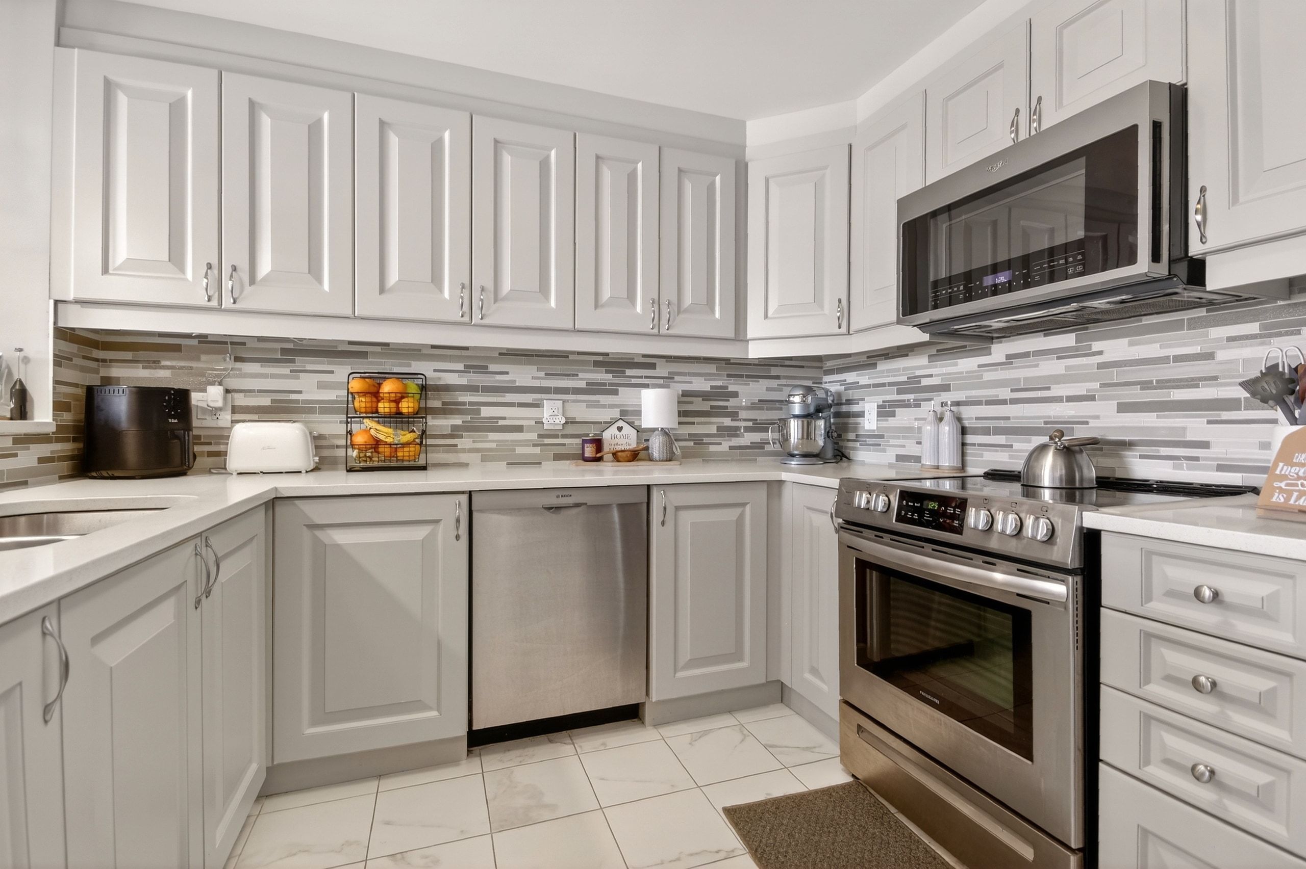 • Chef-inspired kitchen features quartz countertops and custom tile backsplash.