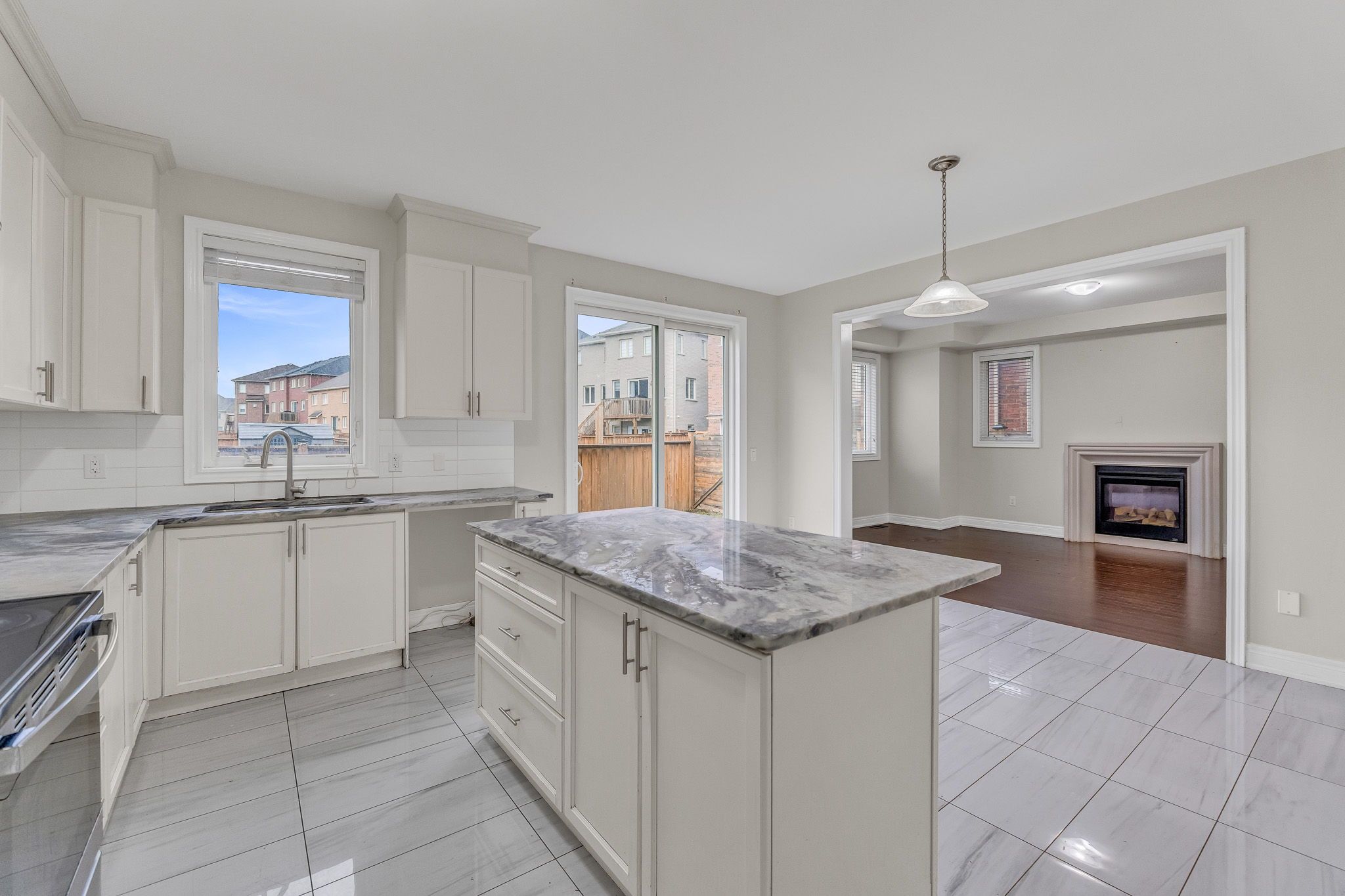 • Bright kitchen with granite counters and a large eat-in area.