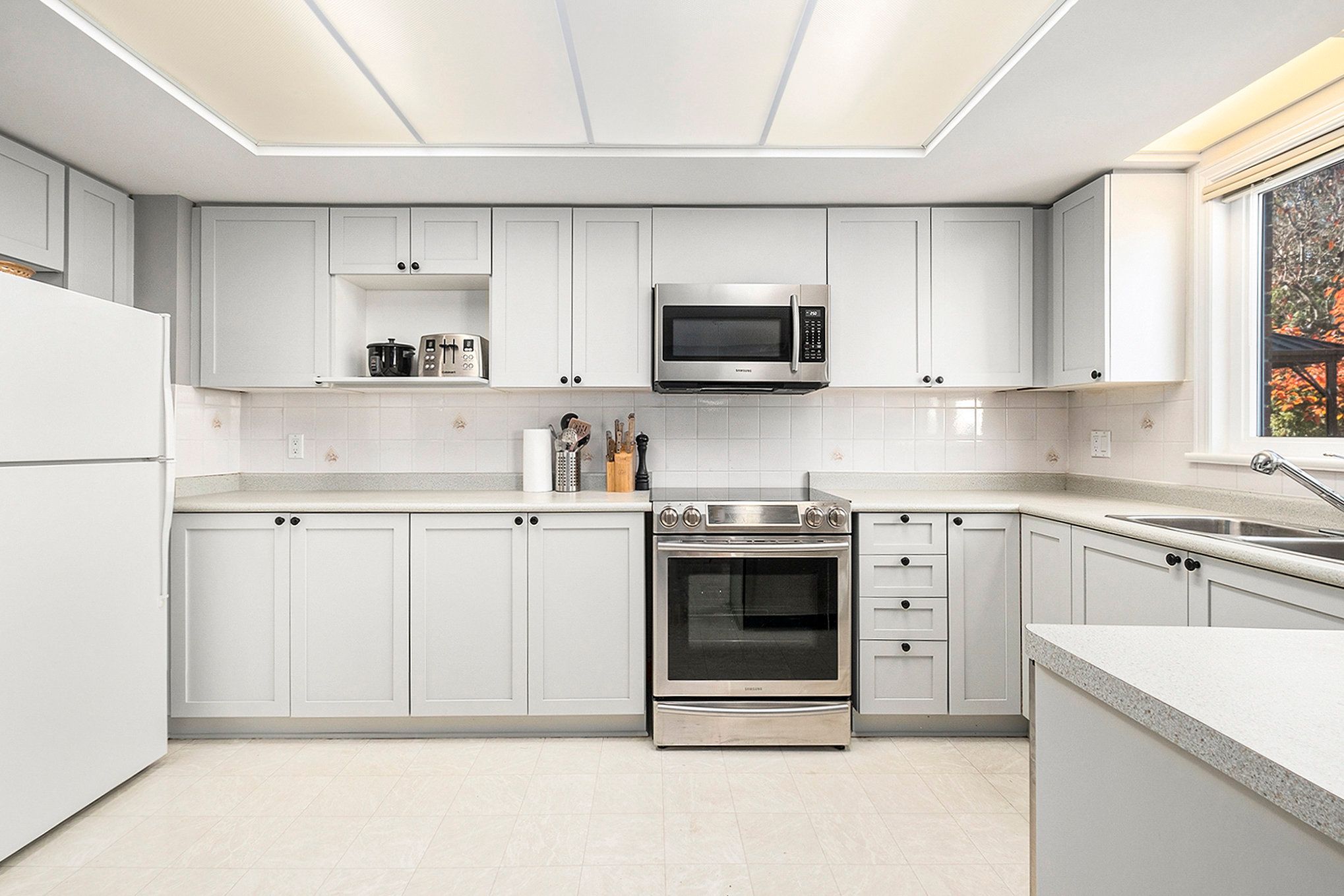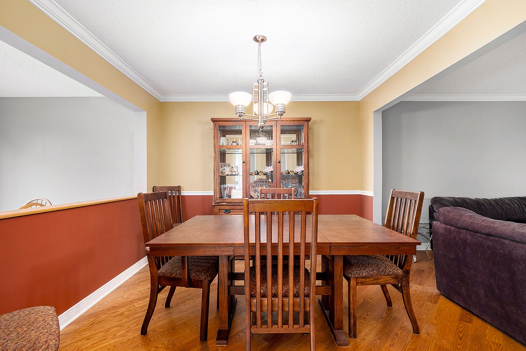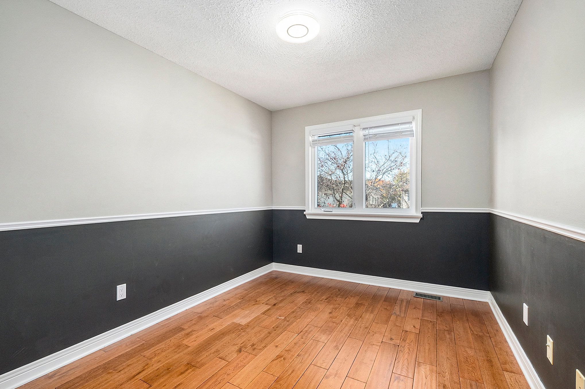 • Bright living room with charming cut-out window and elegant crown moulding.