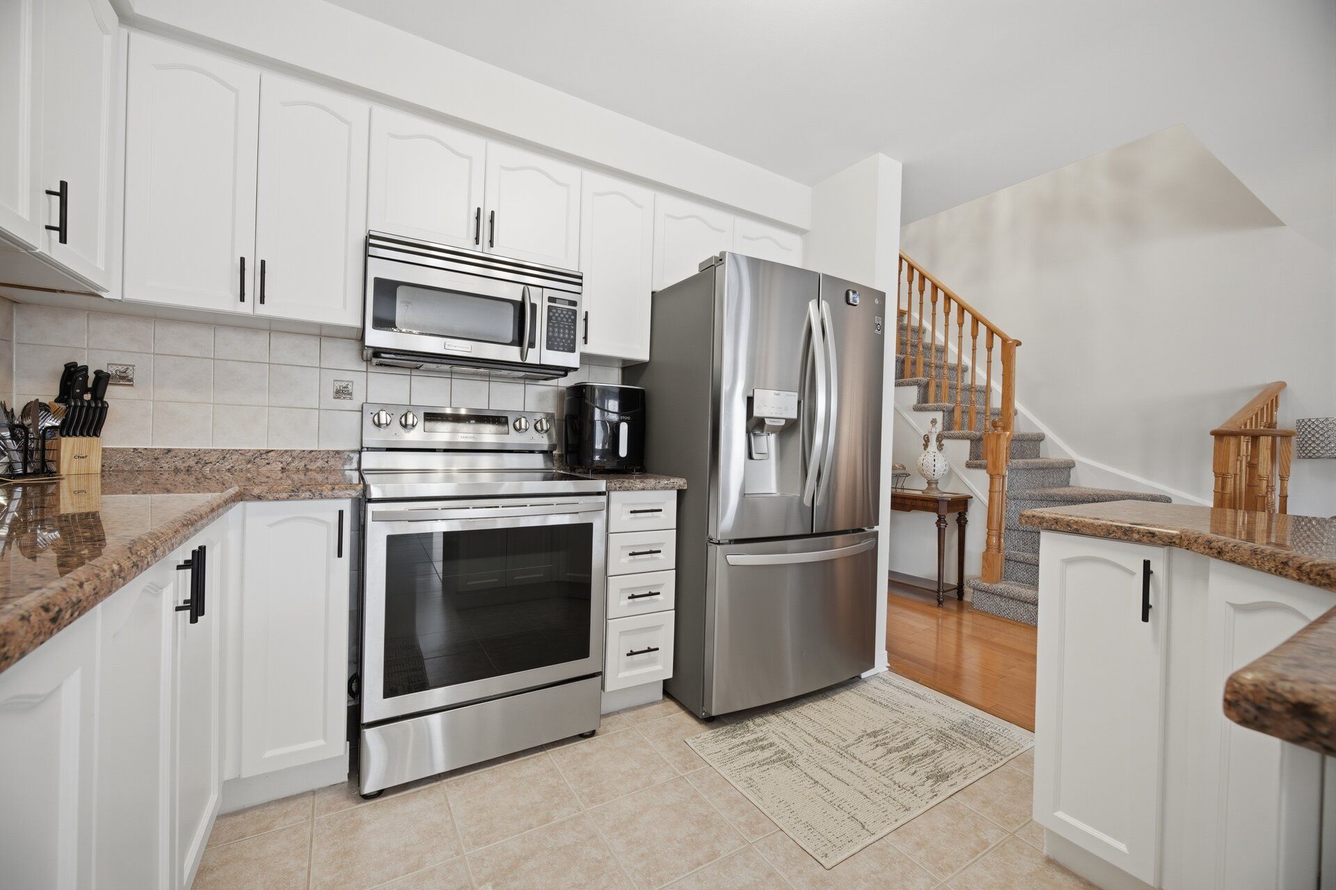 • Modern kitchen equipped with stainless steel appliances, including a new fridge.