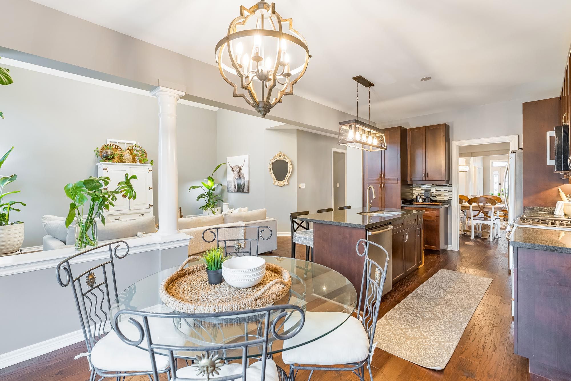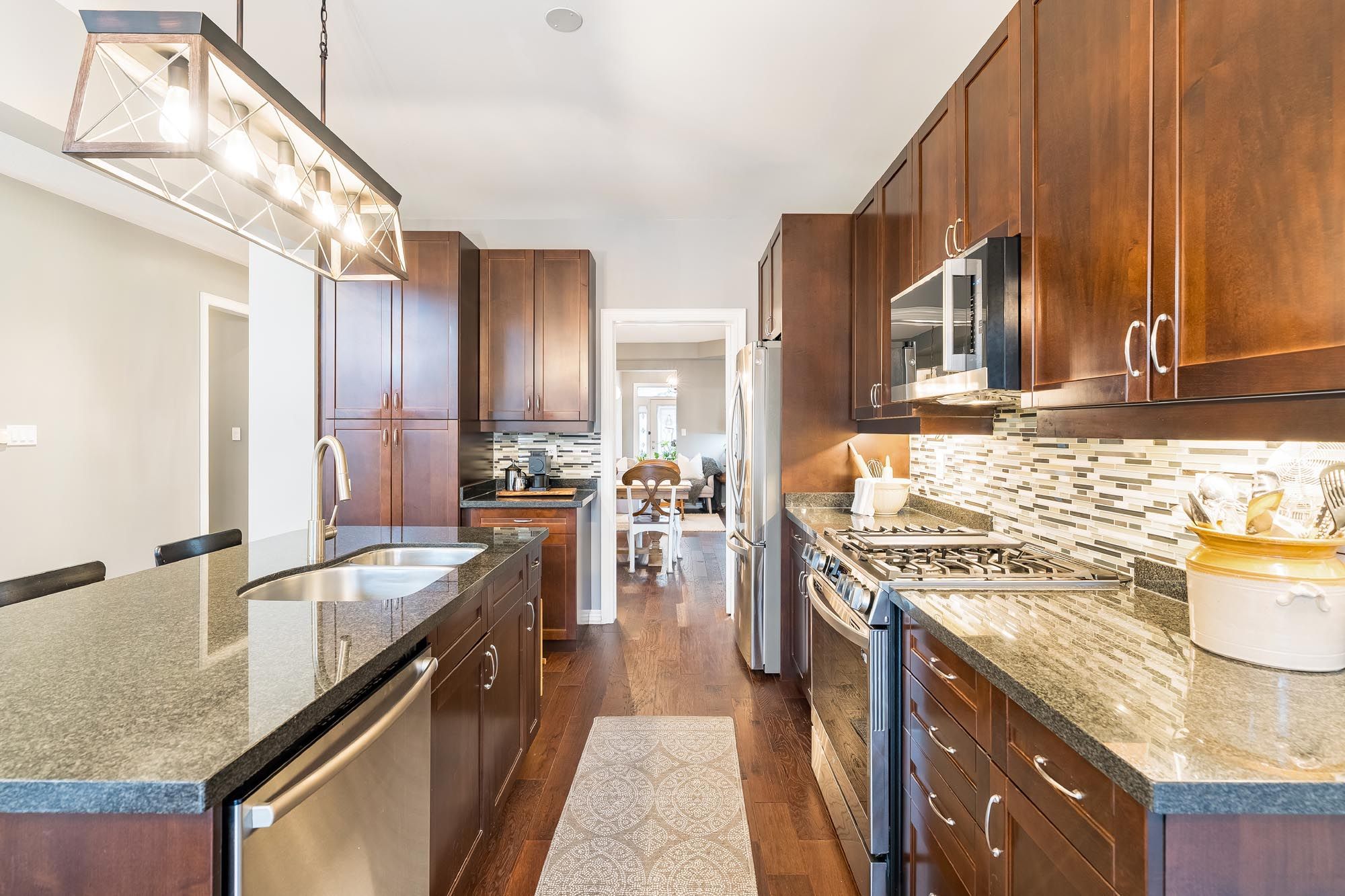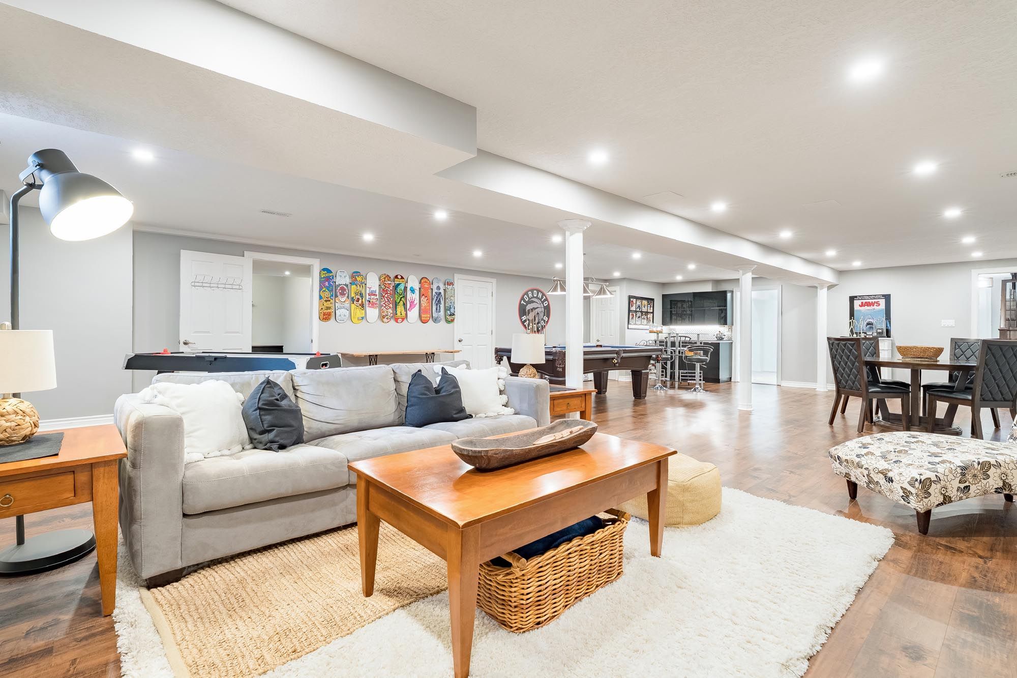 Top 5 reasons you will love this home: 1) well-appointed modern bungalow offering a flexible 3+2 bedroom layout, featuring hardwood flooring, 9' ceilings, and an open-concept design, with a separate oversized family room showcasing a vaulted 15' ceiling and gas fireplace for added space and comfort, with california shutters throughout the home 2) fully finished basement designed for entertaining and extended living, complete with a spacious recreation area featuring a pool table with overhead lighting and an air hockey table, a wet bar, two additional bedrooms, a private exercise area, and a renovated bathroom (2024) 3) thoughtfully updated with key improvements including a new roof (2023), garage door (2020), and newer appliances including fridge, gas stove, washer, and dryer all in 2024, along with an updated laundry room (2024) 4) private, landscaped backyard retreat featuring a two-tier deck with lighting, a hot tub area, a natural gas firepit, mature landscaping, and an inground sprinkler system, creating an ideal setting for both entertaining and everyday enjoyment 5) situated on a premium lot on a quiet court with an interlock driveway and no sidewalk, offering added parking and privacy, all while being conveniently located close to schools, parks, shopping, and easy access to highway 400. 2,182 above grade sq. Ft. Plus a finished basement. 4,036 sq. Ft. Of finished living space.