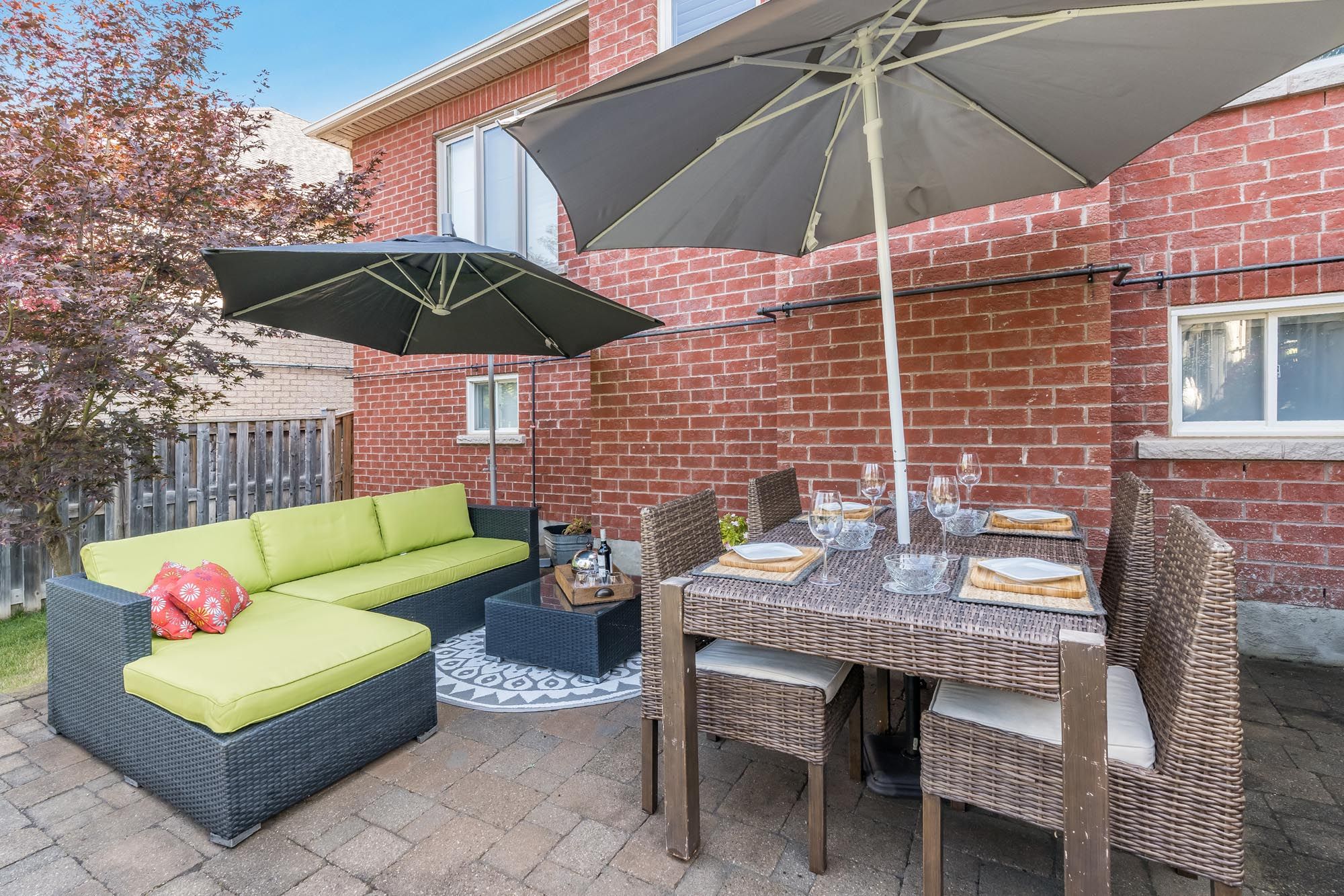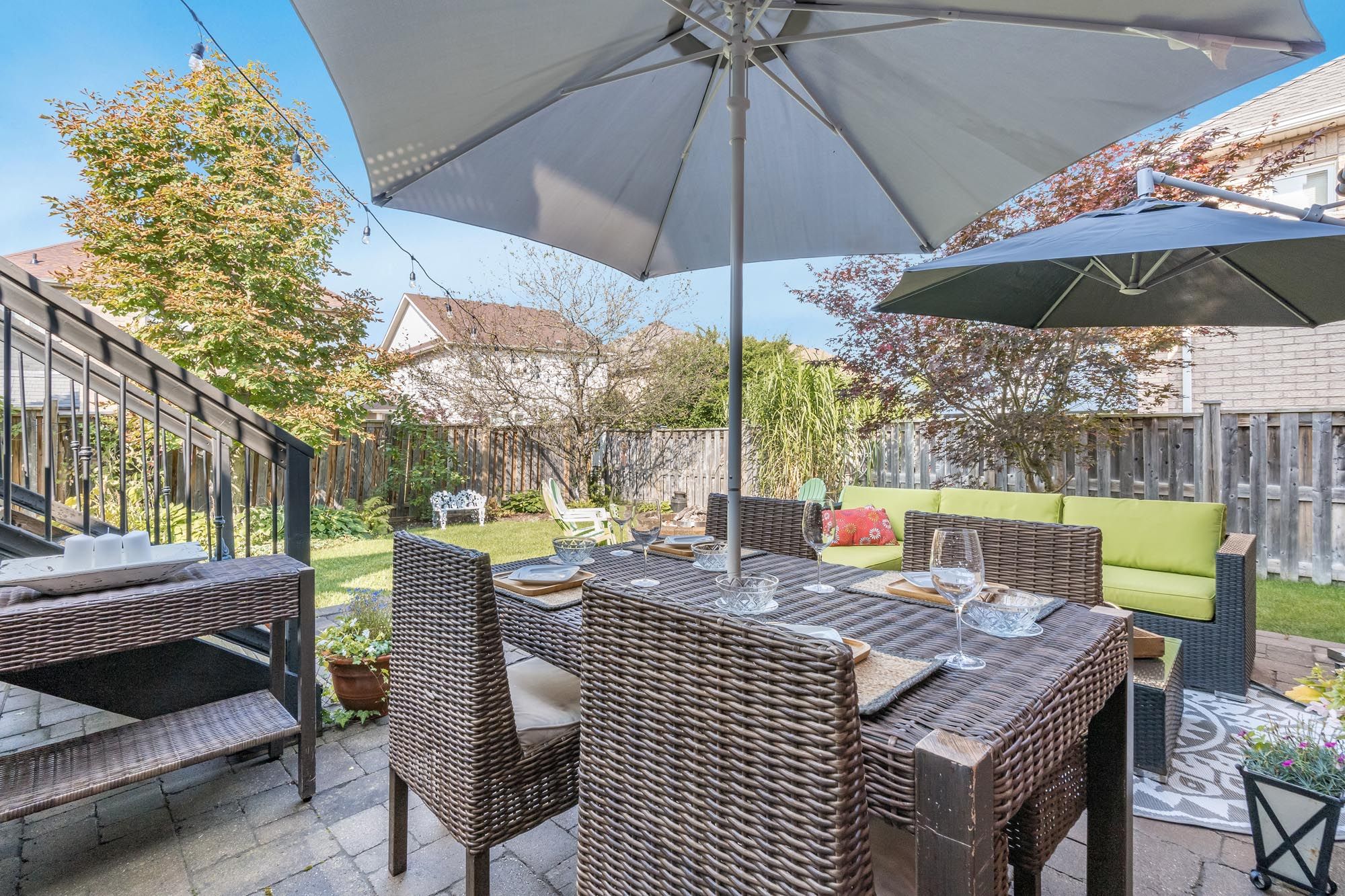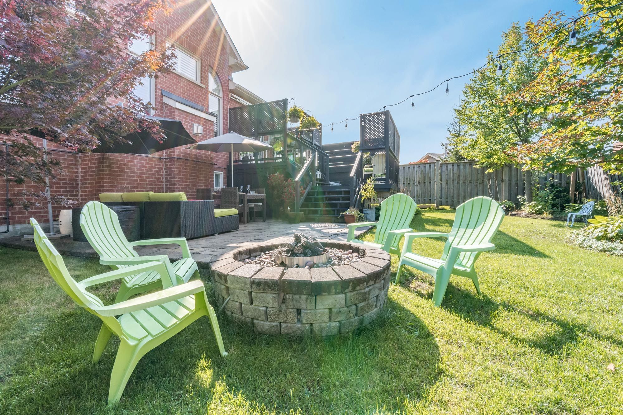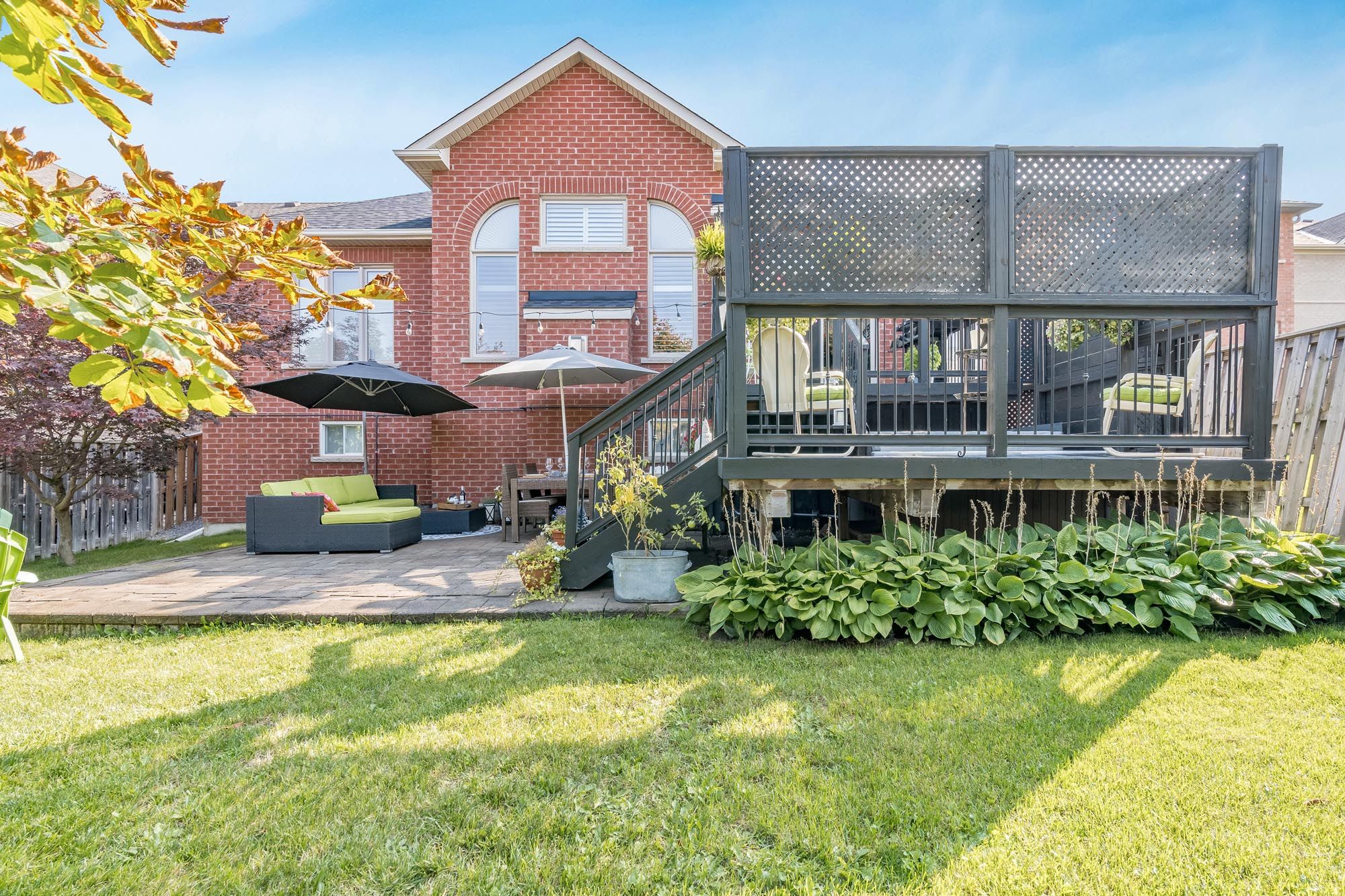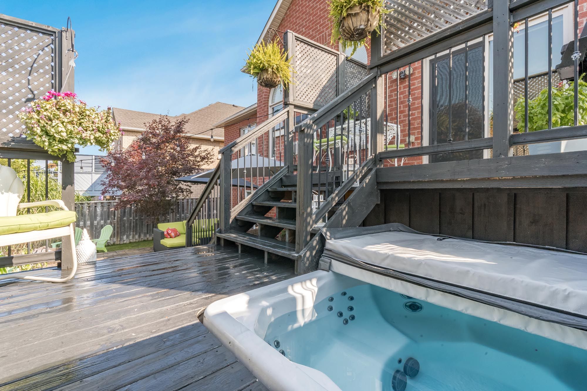 • Private backyard with two-tier deck, hot tub, and landscaped retreat.