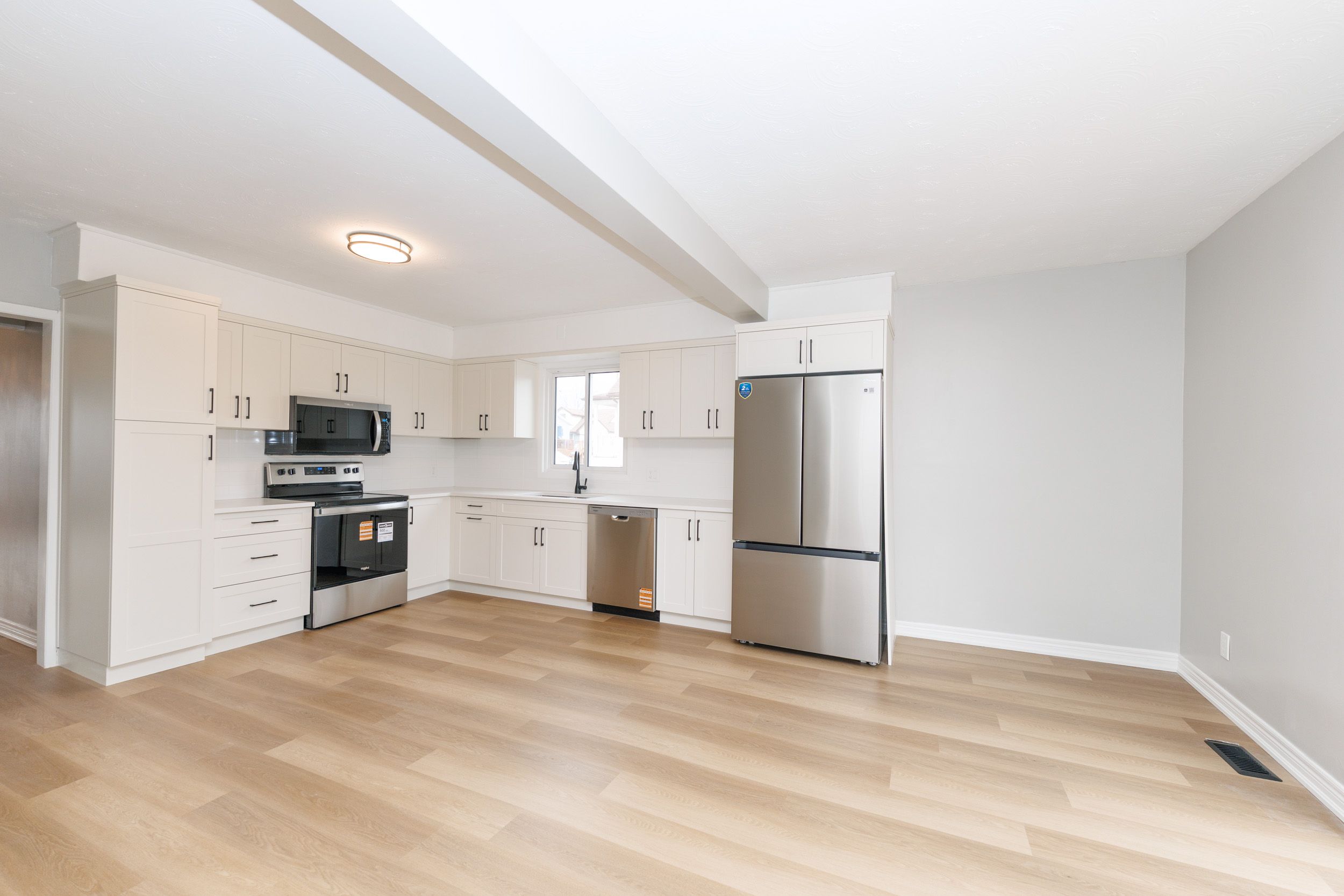 • Large eat-in kitchen with quartz counters and stainless steel appliances.