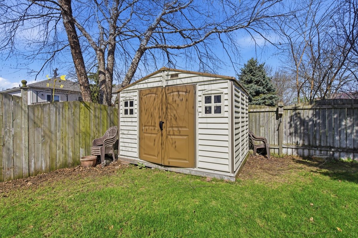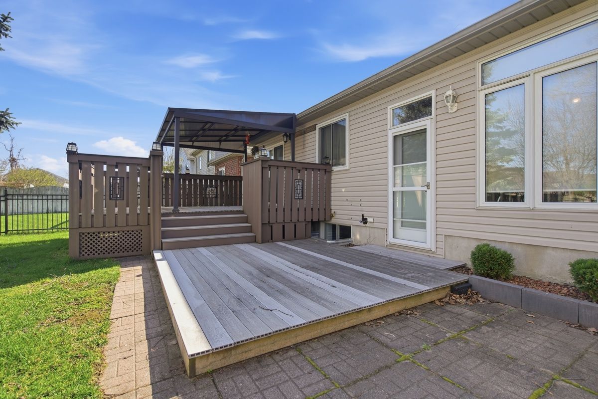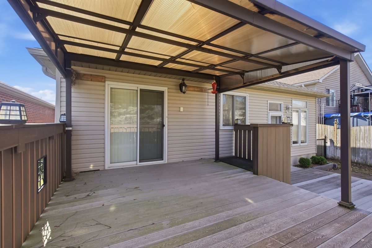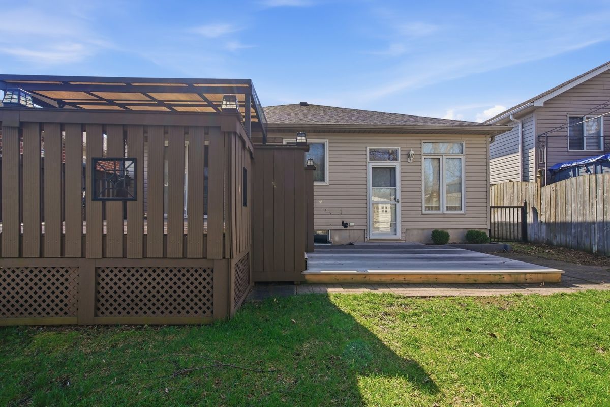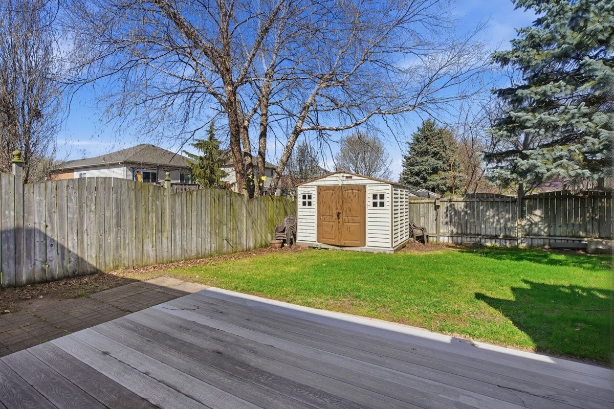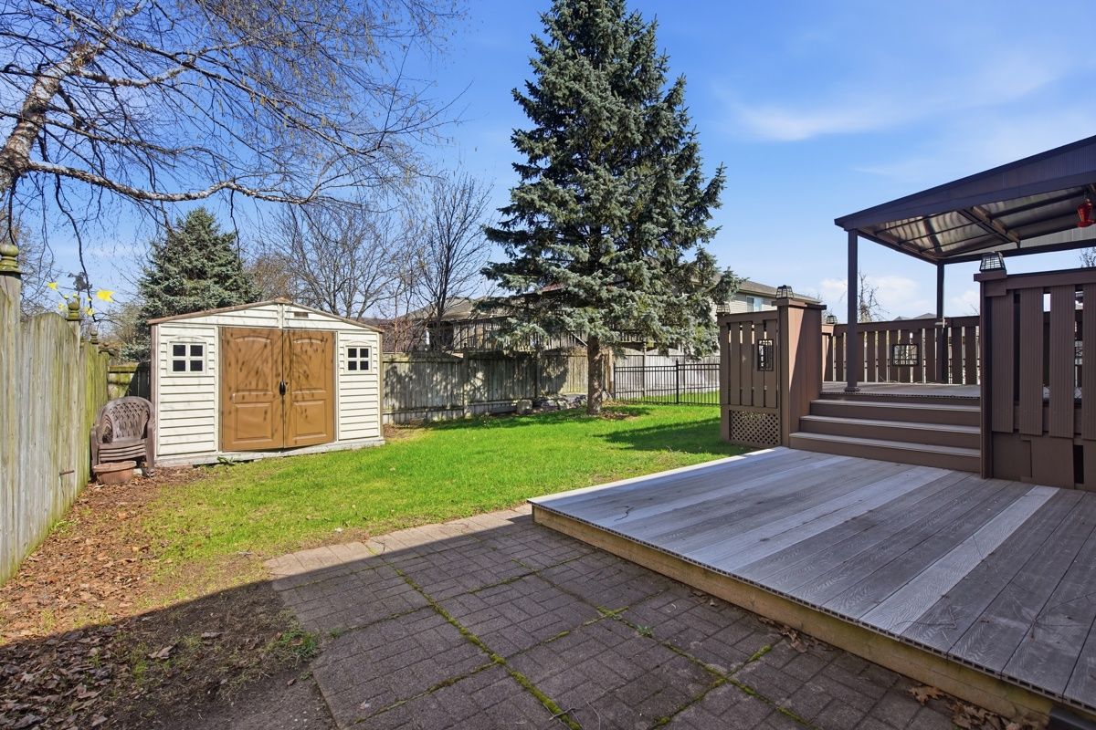 • Fully fenced backyard with a two-tier deck and outdoor features.