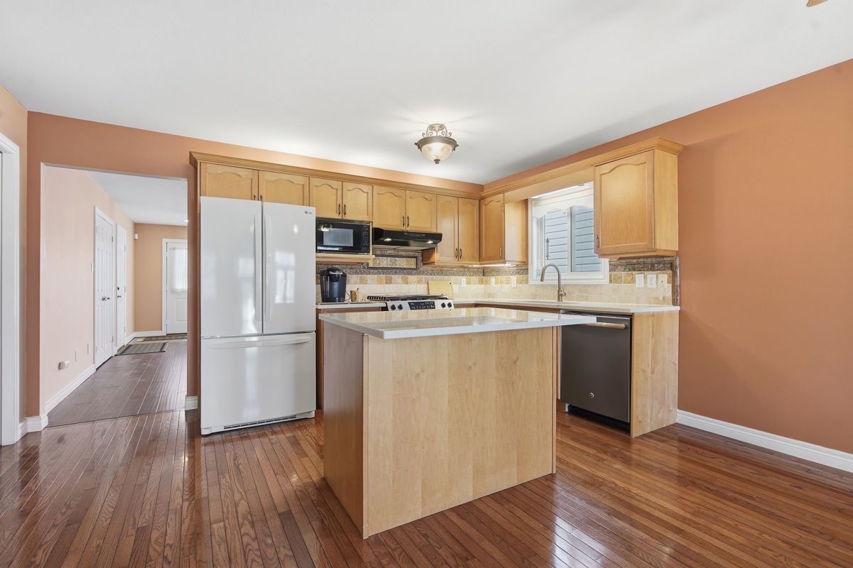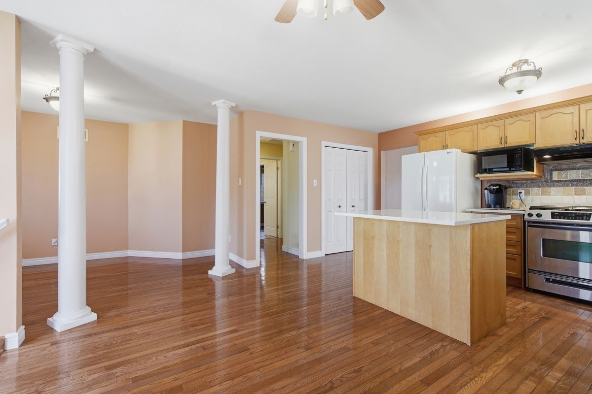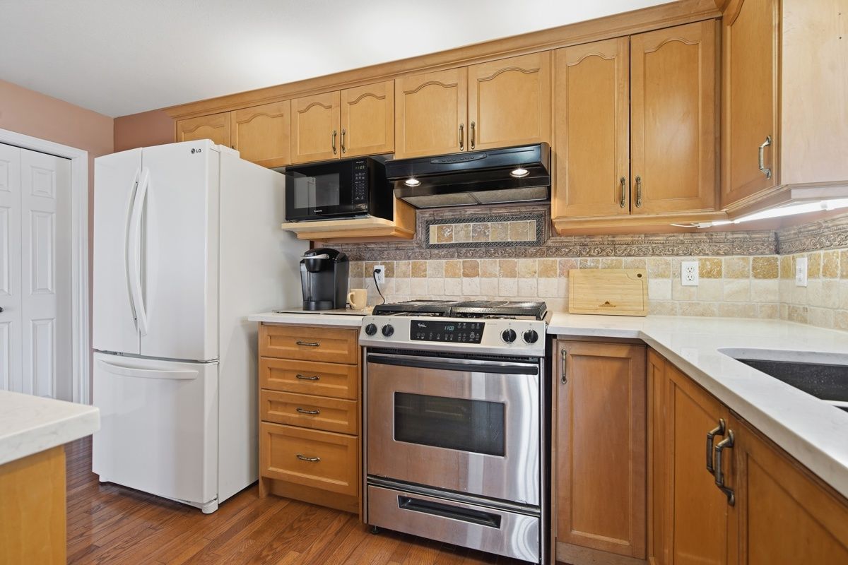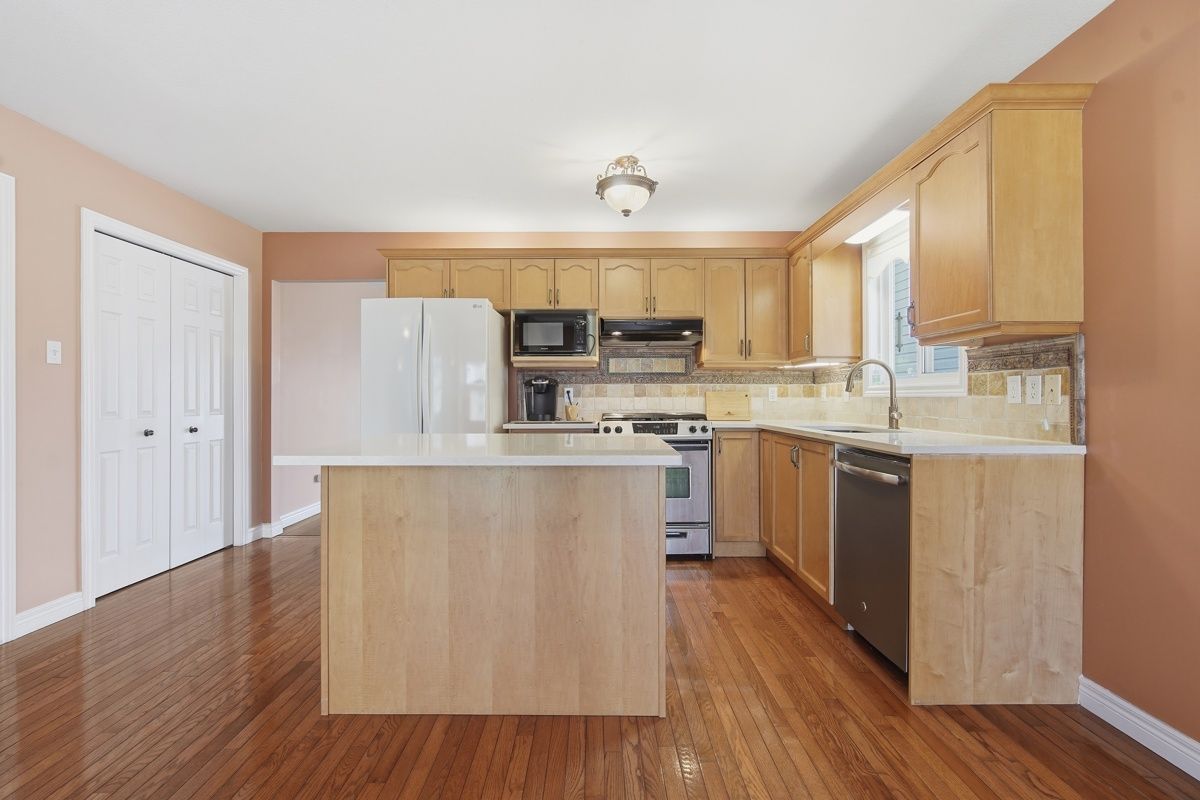 • Large eat-in kitchen with quartz countertops and island for cooking.