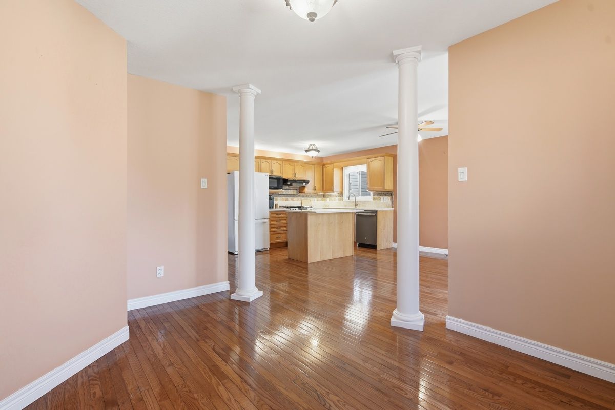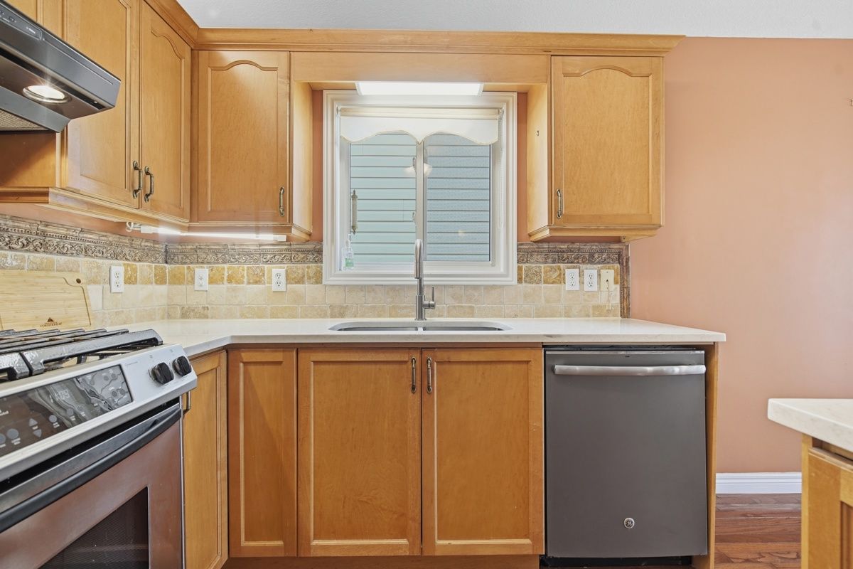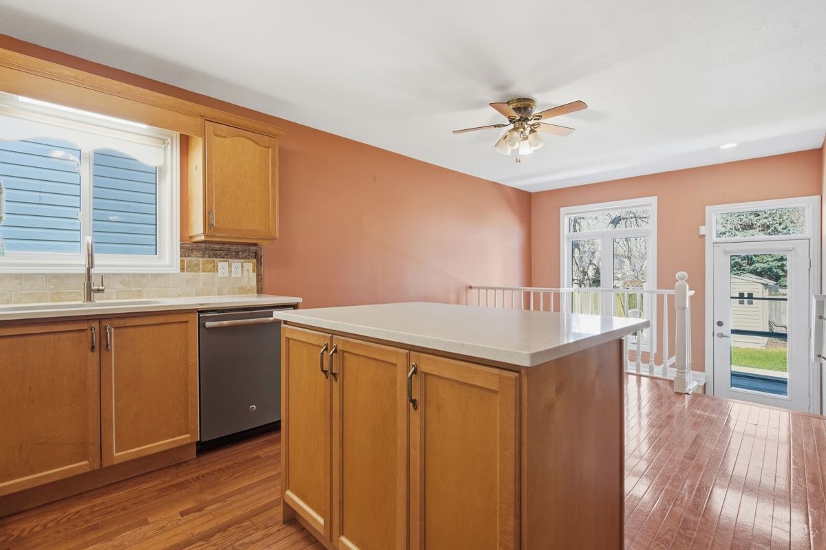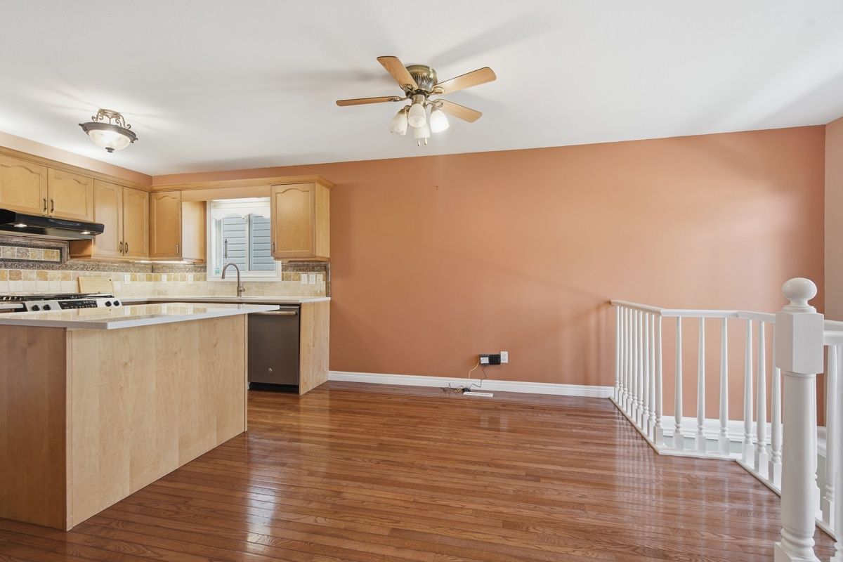 • Large eat-in kitchen with quartz countertops and island for cooking.
