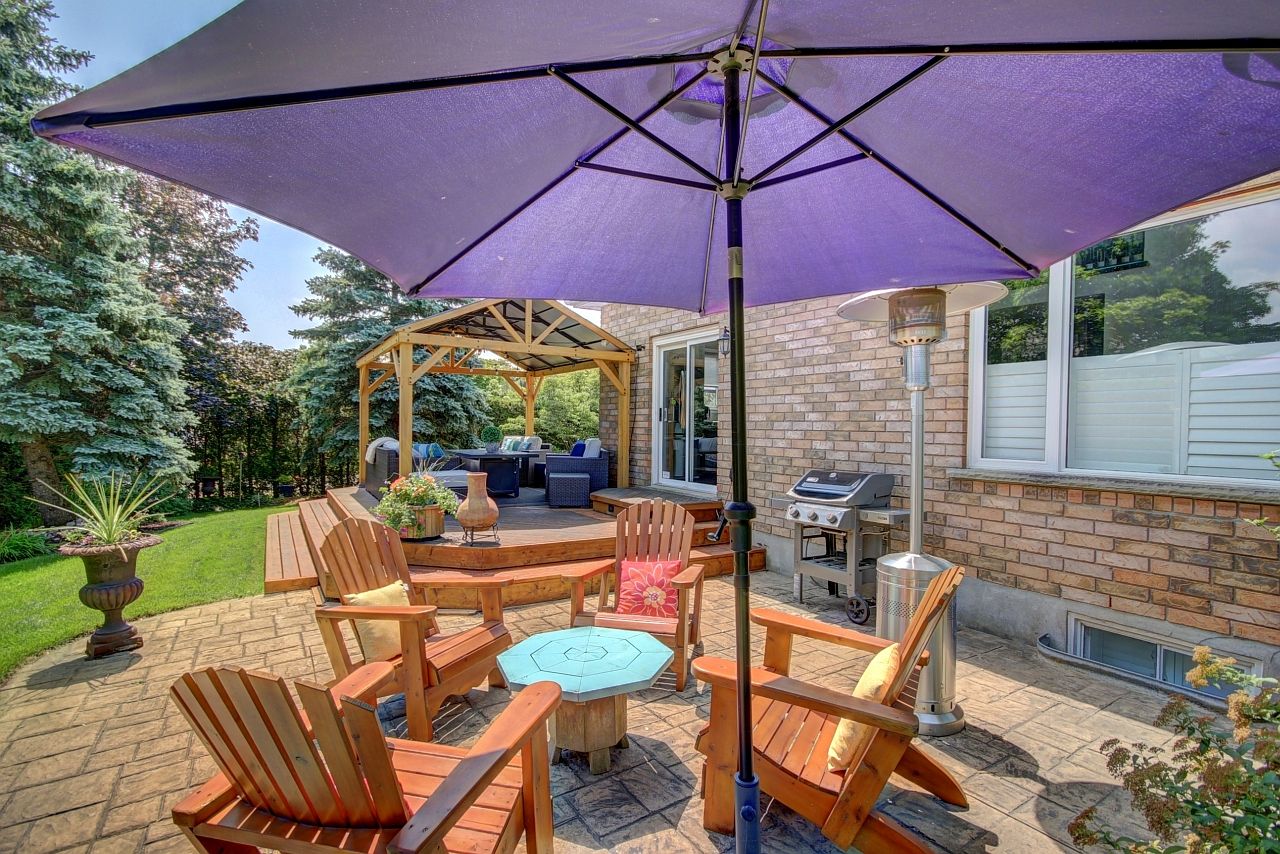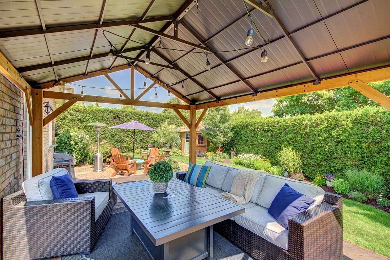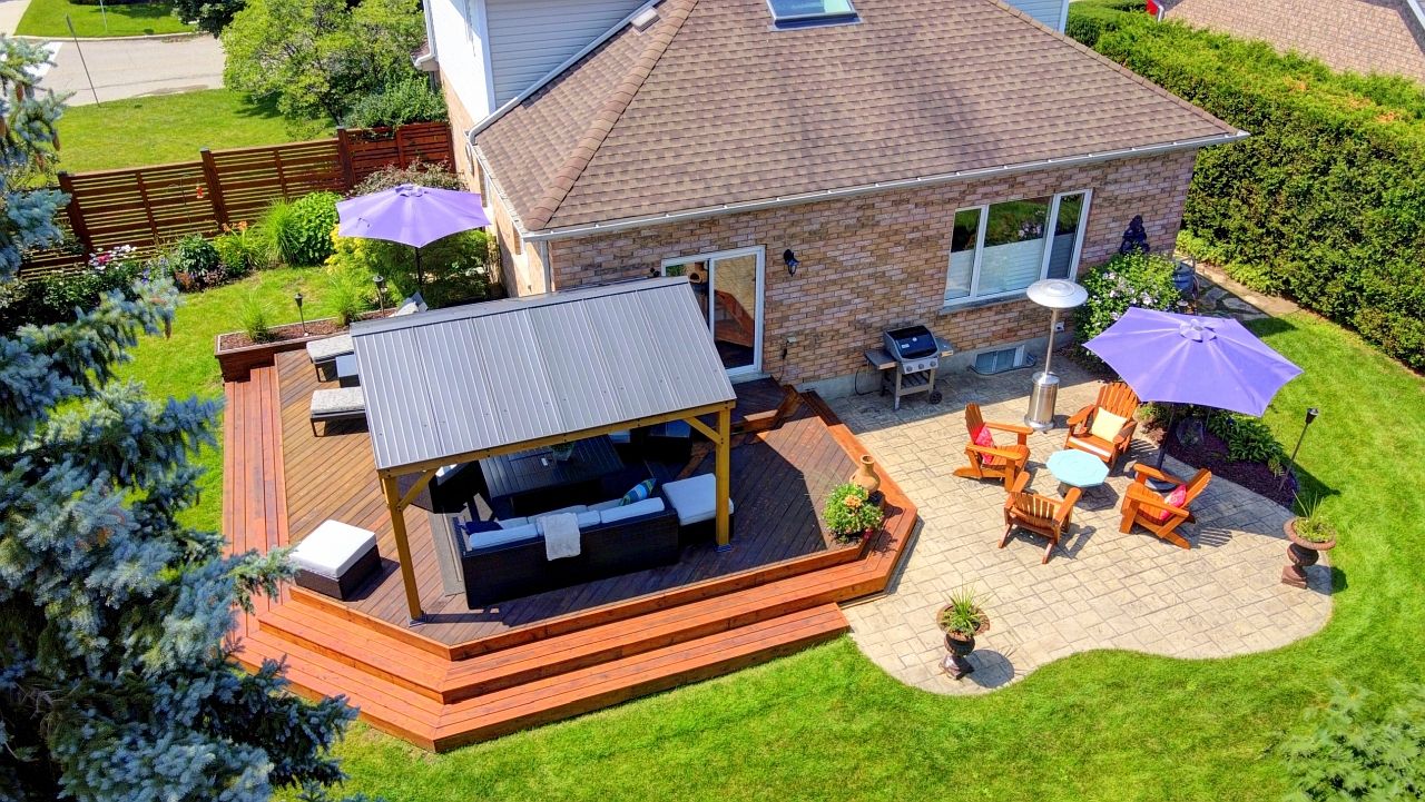 • Private landscaped backyard with a deck and gazebo for relaxation.