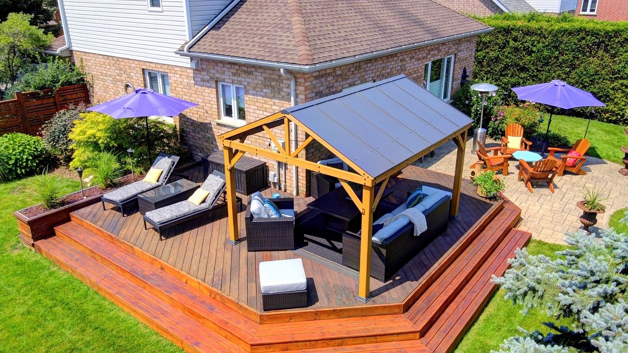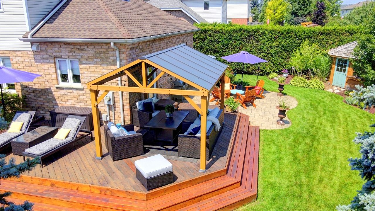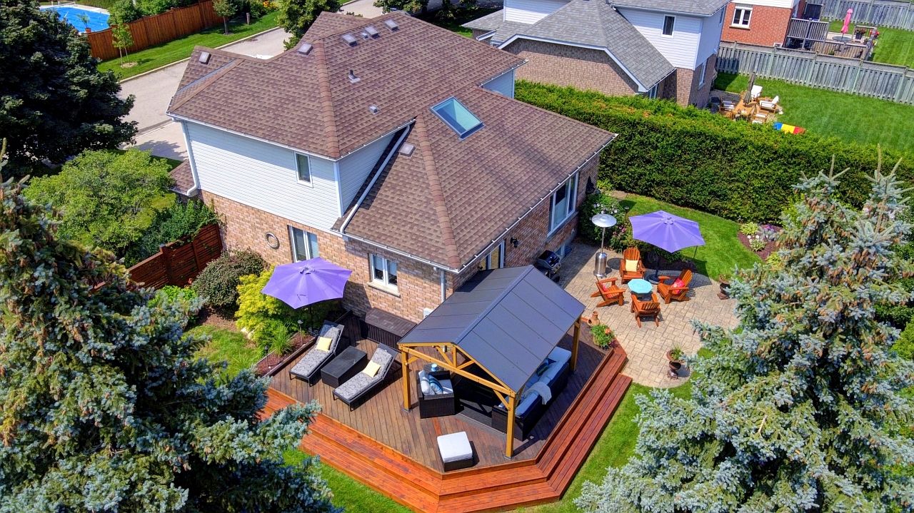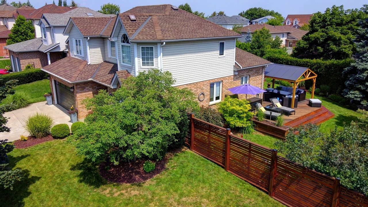• Private landscaped backyard with a deck and gazebo for relaxation.