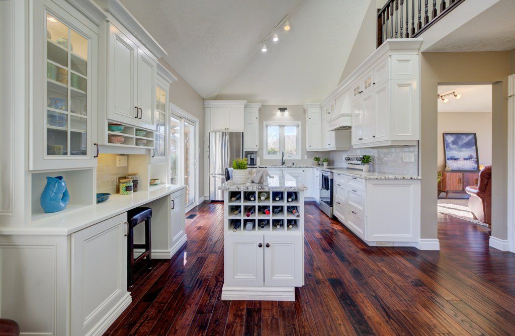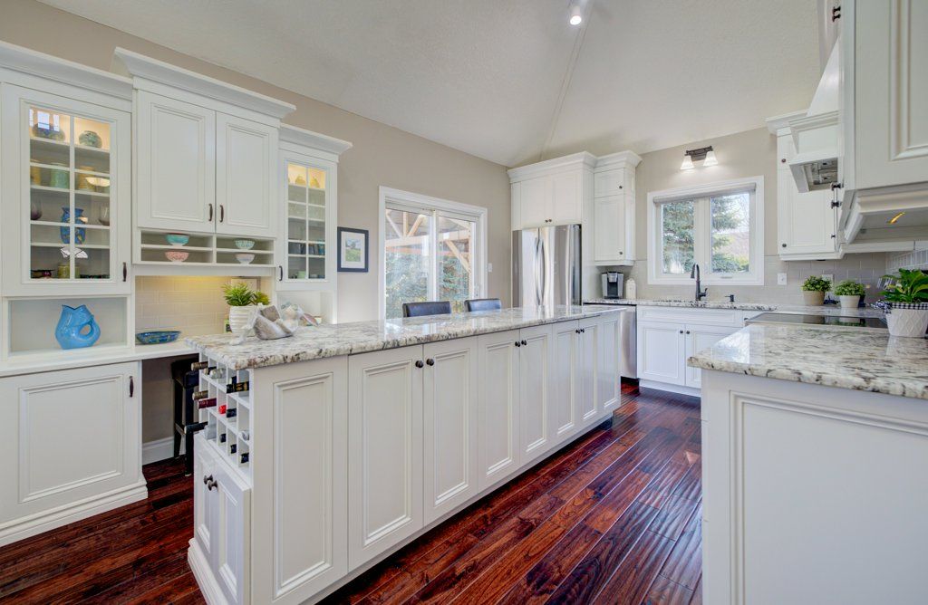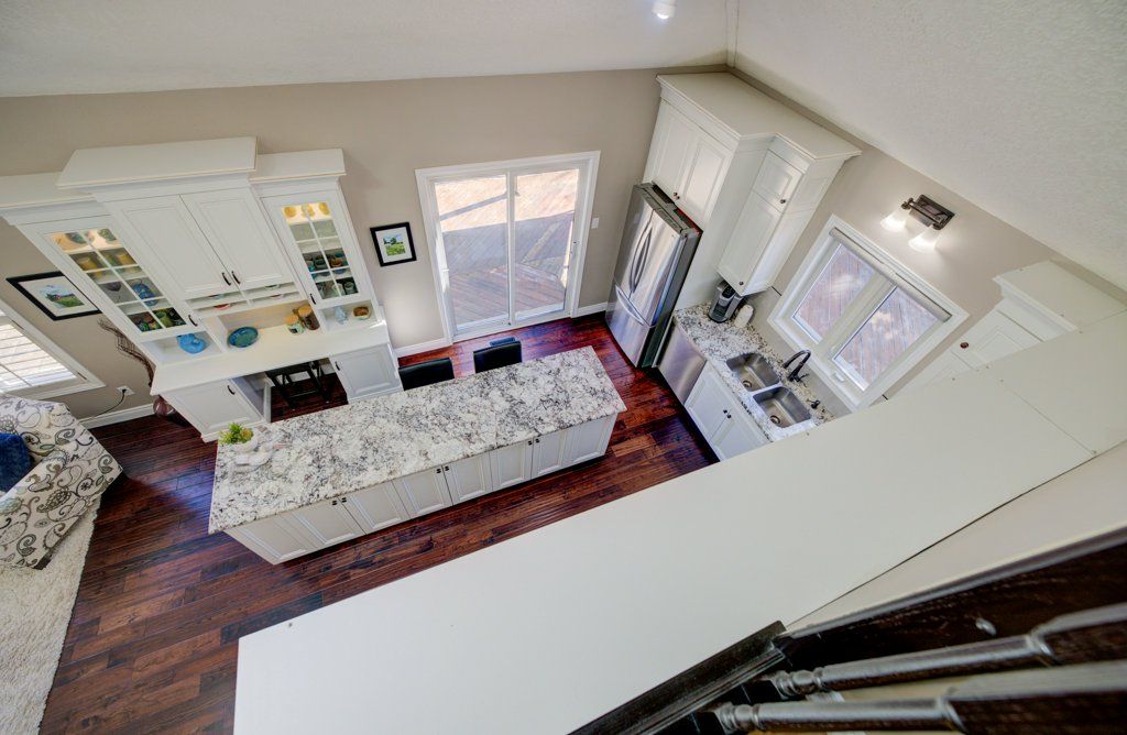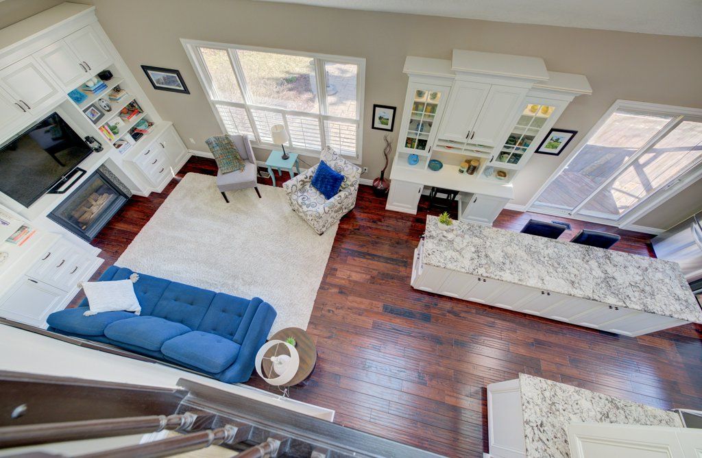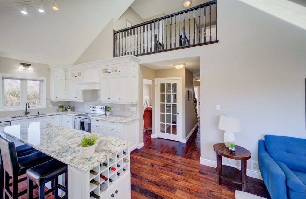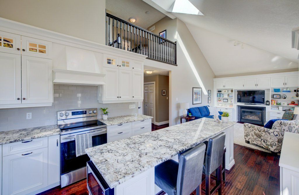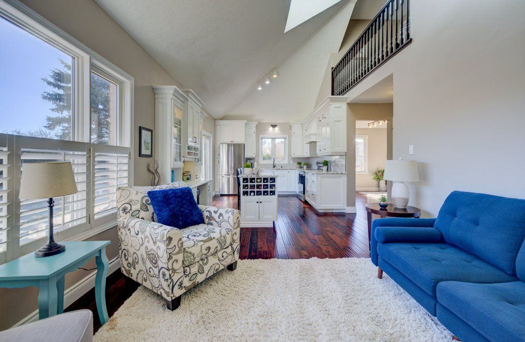 • Bright open-concept main floor with vaulted ceilings and natural light.
