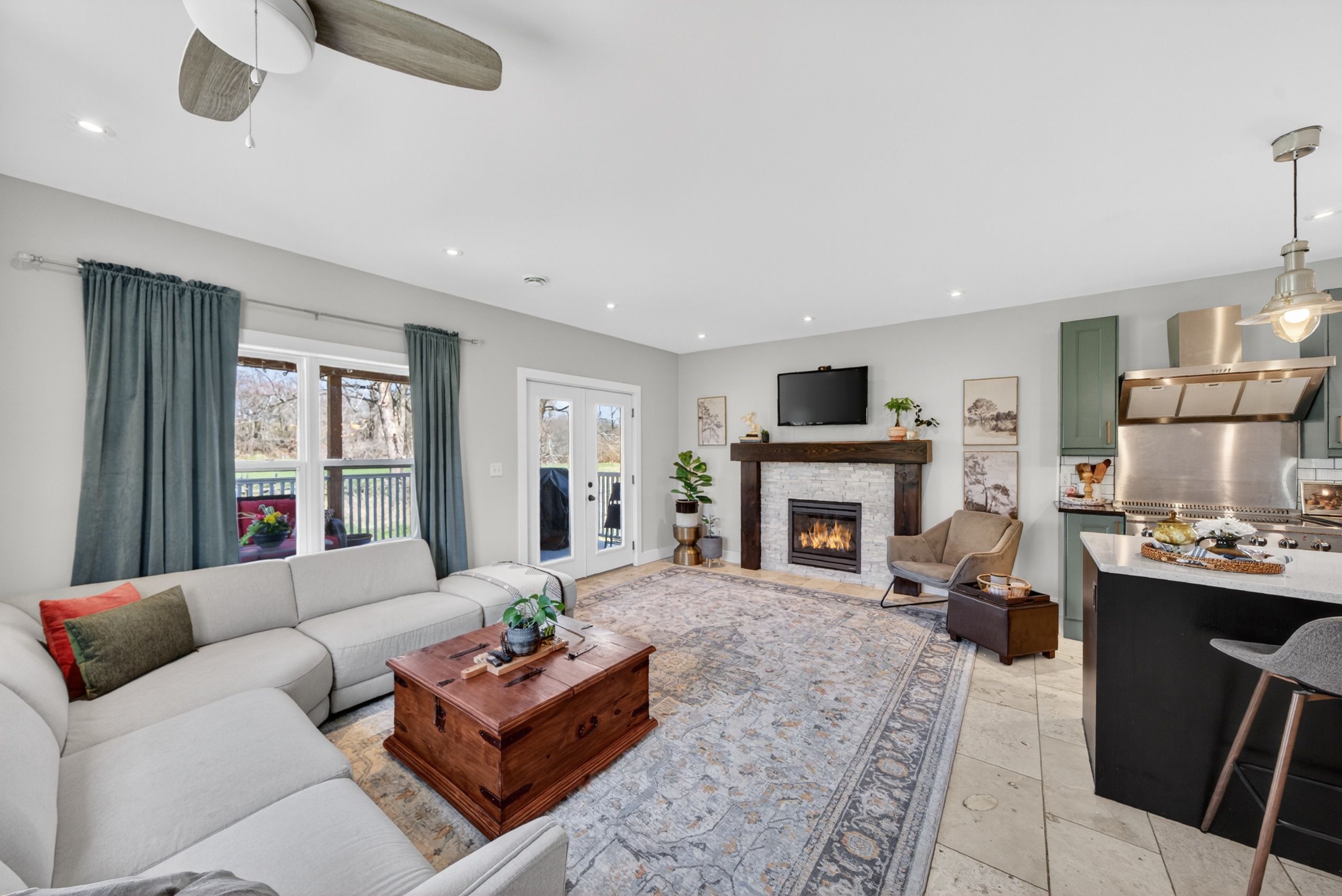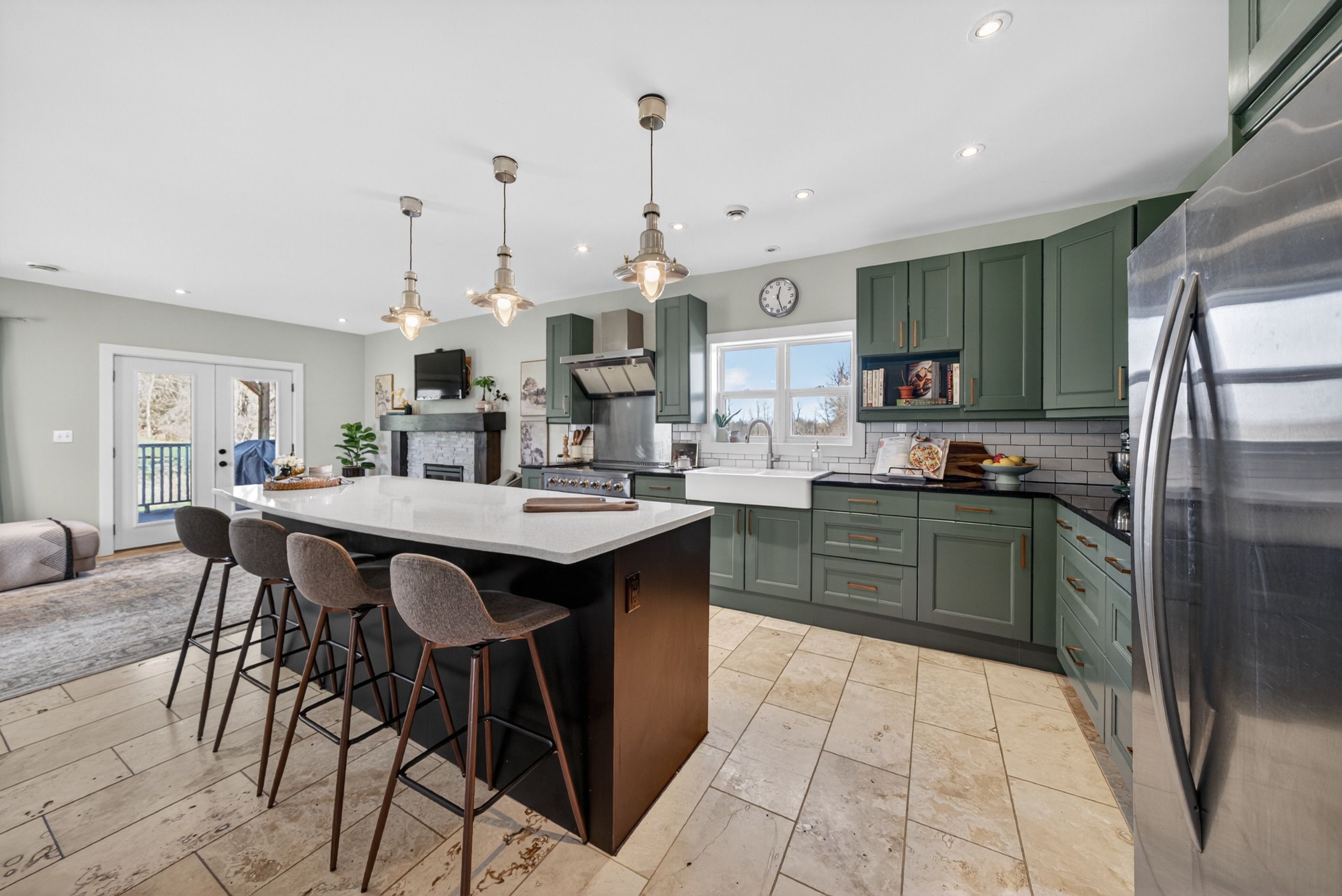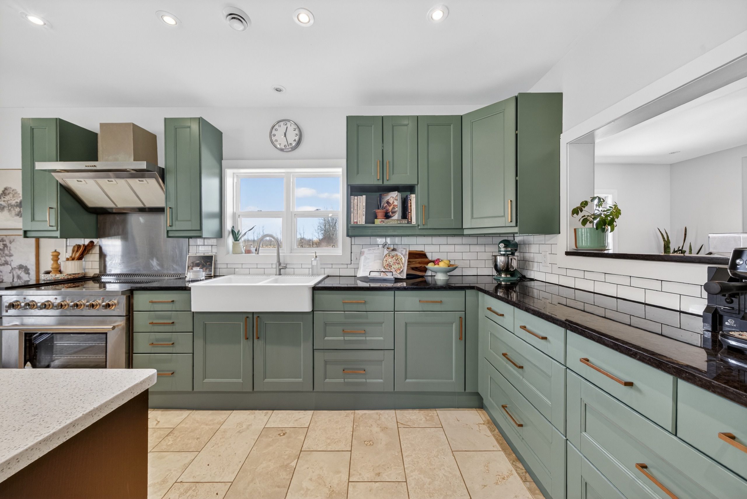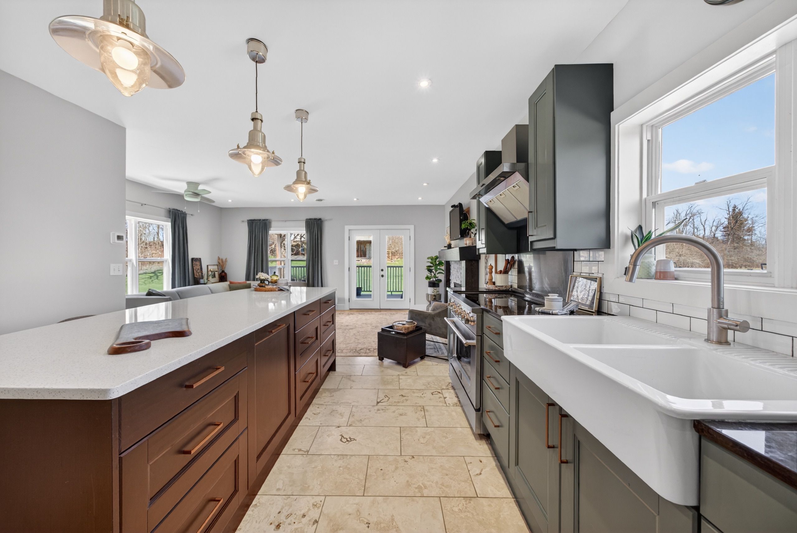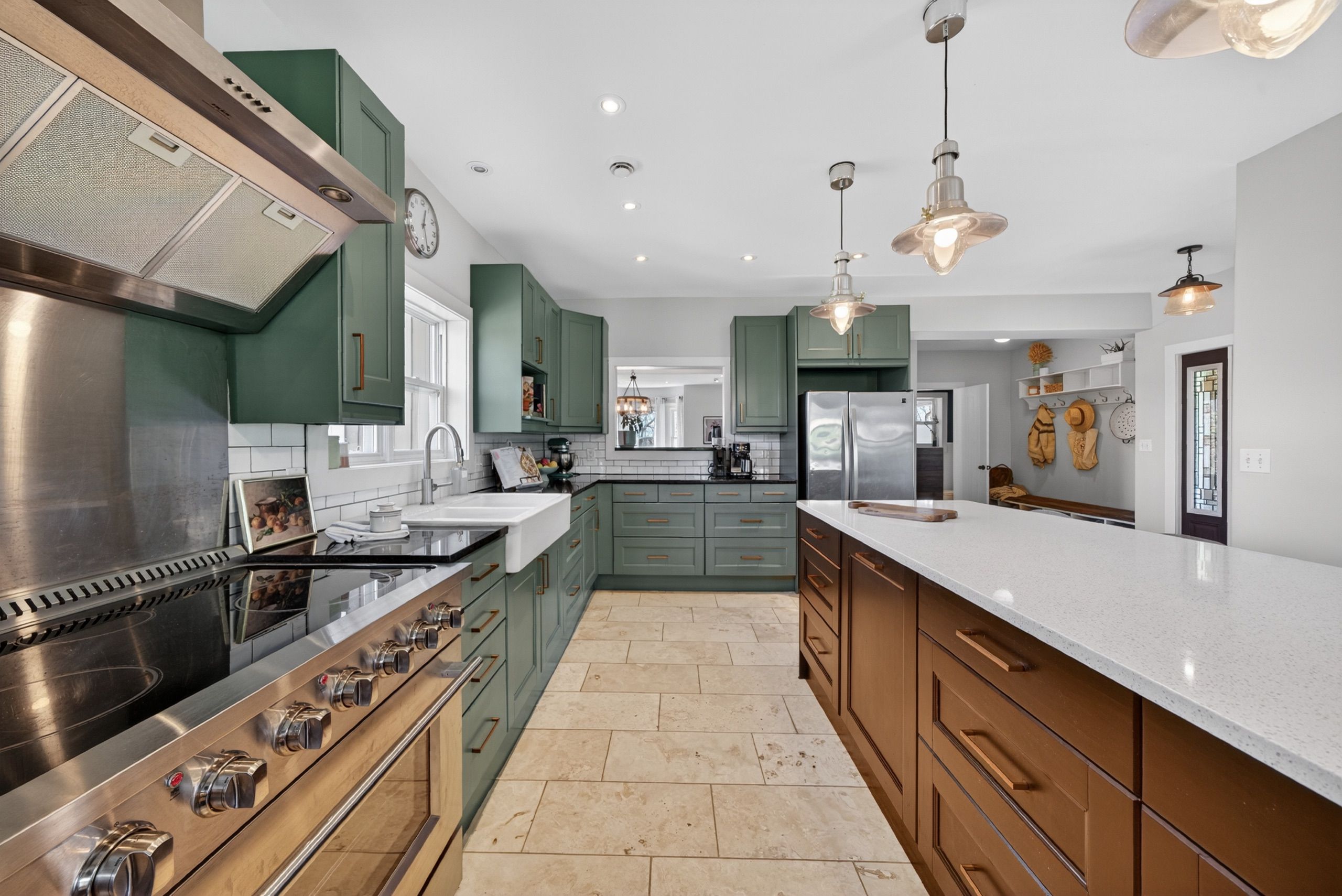• Spacious country kitchen with custom cabinetry and heated stone floors.