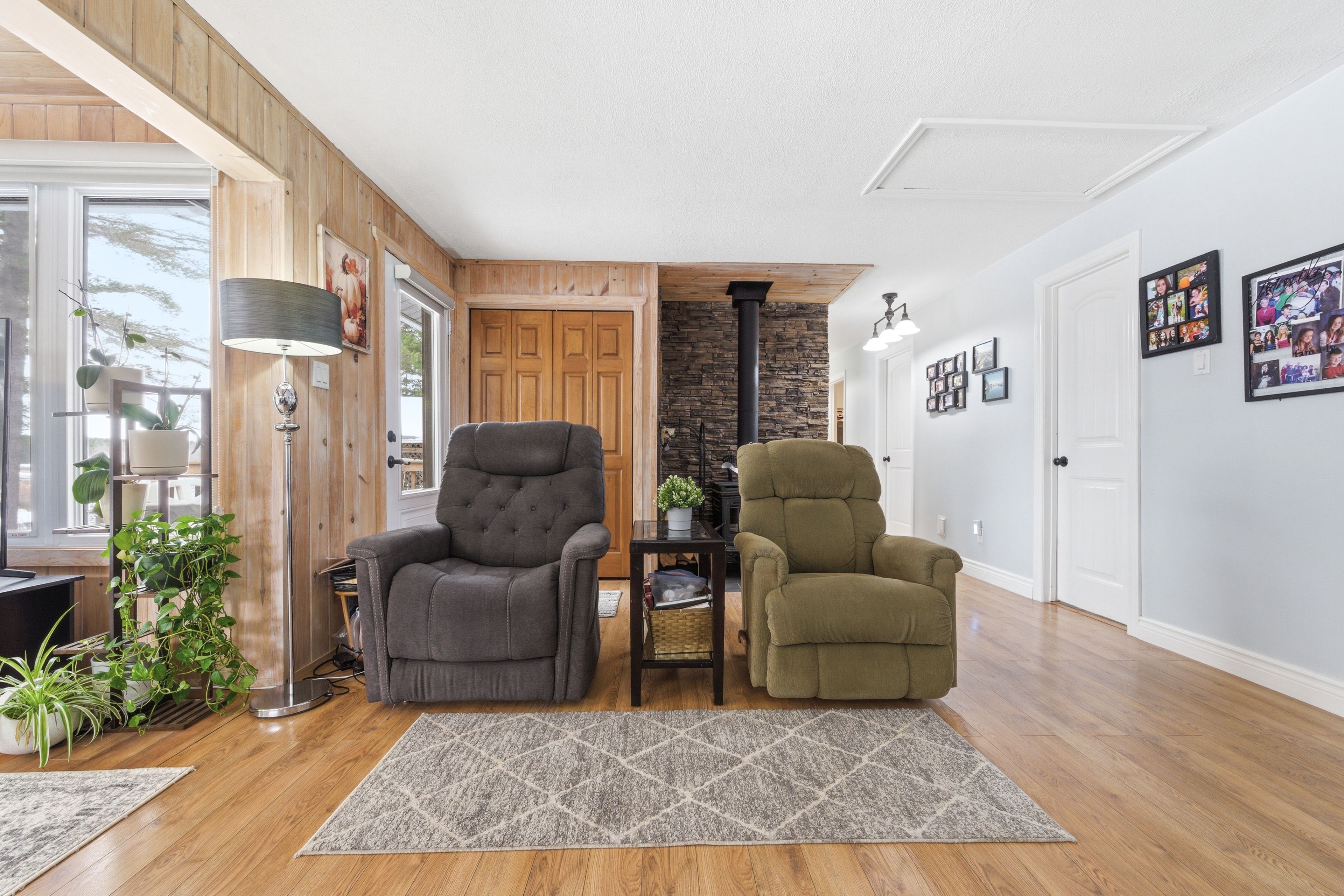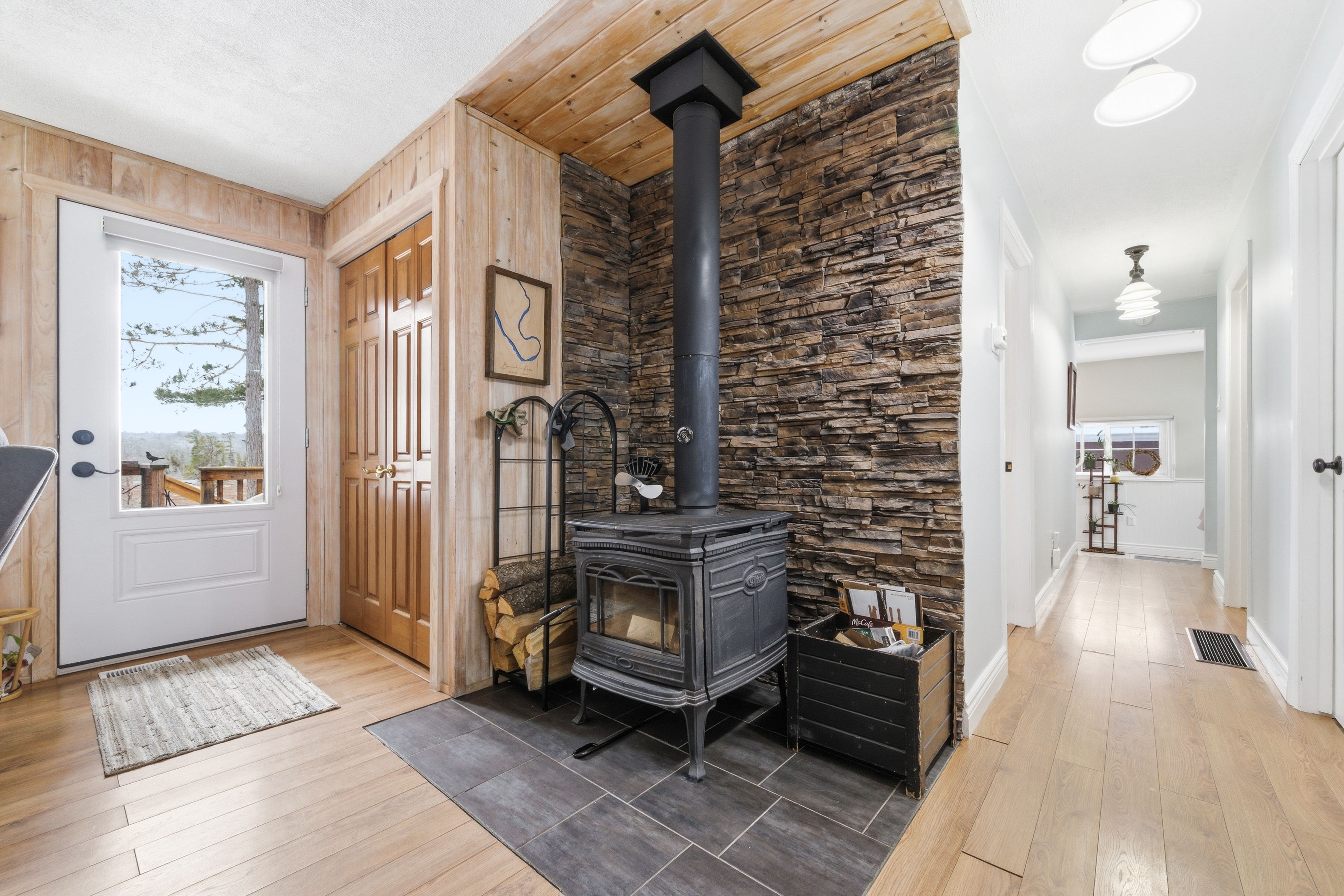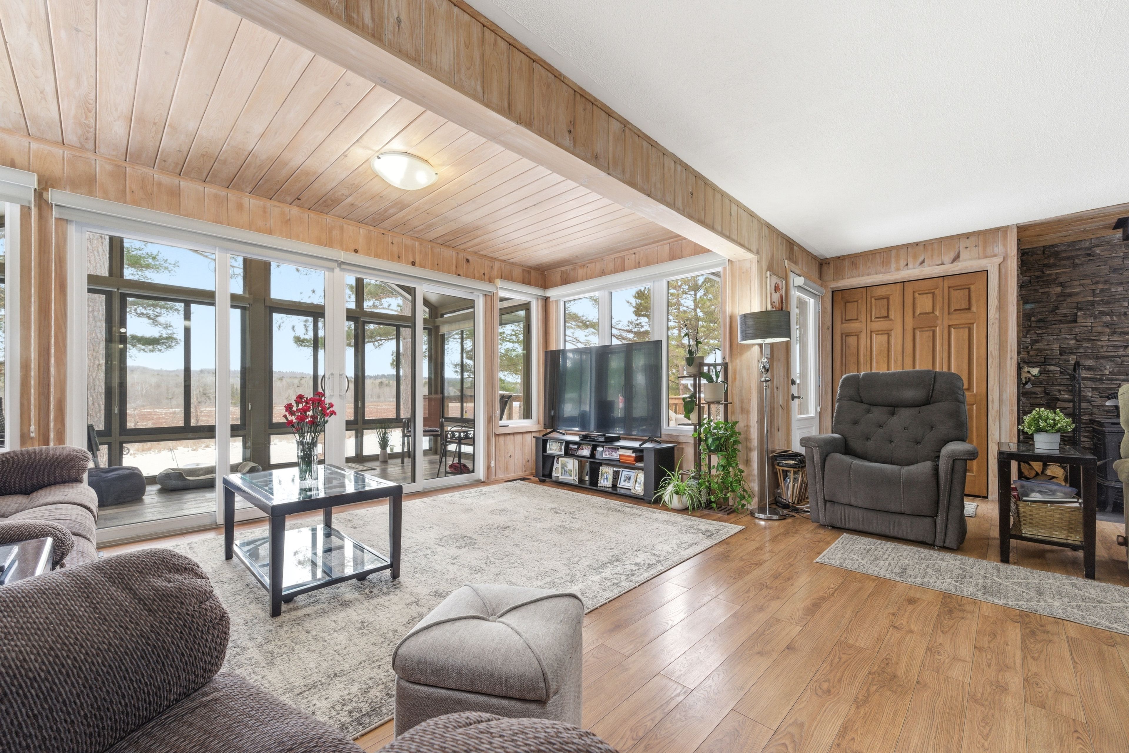 Welcome to 642 pecoskie drive, nestled along 100 feet of pristine shoreline on the bonnechere river, set within a quiet and welcoming community. This inviting property offers the perfect blend of relaxation, natural beauty, and year-round comfort. Positioned on a spacious lot with stunning sunset views, you can unwind by the water's edge or relax in the bright sunroom, where warm afternoon light fills the space and creates the perfect setting to start or end your day. The home features 3 bedrooms and 2 full bathrooms, with a functional layout designed for easy living. The main level offers everything you need, including a cozy open-concept living area highlighted by tongue-and-groove pine walls and a wood stove with a beautiful stacked stone backdrop. The primary bedroom is filled with natural light and showcases peaceful river views along with a charming pine ceiling. A guest bedroom and convenient main-floor laundry complete this level. The lower level expands your living space with an additional bedroom, full bathroom, second wood stove, and a sauna-creating a private retreat to relax and recharge after a day spent enjoying the outdoors. Outside, the property continues to impress with a paved driveway, newly shingled roof (2025), detached garage plus additional storage. A standby generator ensures comfort in all seasons offering peace of mind in the country. The generous yard provides plenty of space to garden, entertain, or simply take in the natural surroundings. Ideally located just a short drive to algonquin park and bonnechere provincial park, this property is a gateway to some of ontario's best outdoor recreation, including hiking, paddling, wildlife viewing, snowmobiling, and atv trails. Experience the beauty, tranquility, and lifestyle this riverfront property has to offer-your escape to nature awaits.