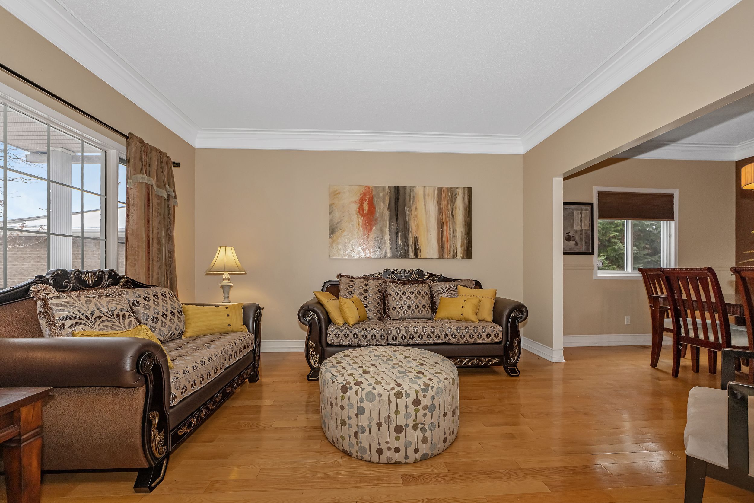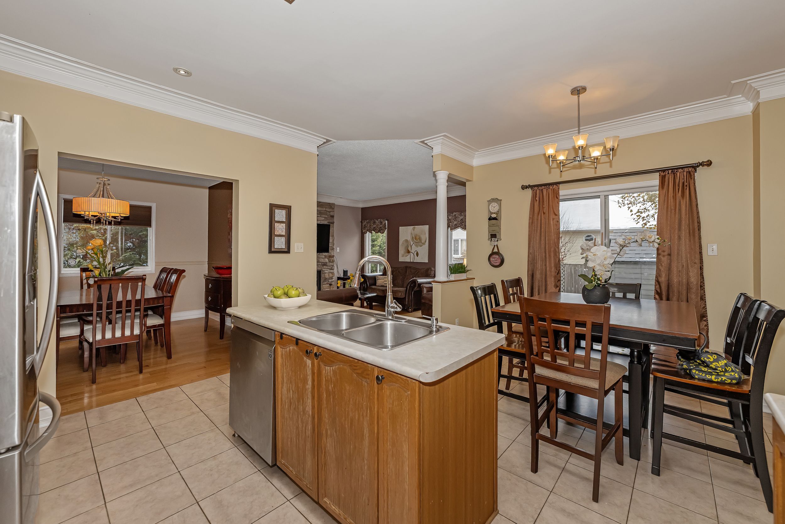Beautiful 4-bedroom, 4-bathroom home ideally located close to schools, shopping, and recreational facilities. This home features hardwood and ceramic tile flooring throughout, 9-foot ceilings, extensive pot lighting, and elegant crown moldings. The spacious kitchen and eating area open seamlessly to the family room, which boasts a stunning natural gas fireplace accented by a striking stone wall. The primary bedroom offers generous space, a large walk-in closet, and a full ensuite featuring a soaker tub and separate shower. The fully finished basement is complete with ceramic tile flooring, a full 4-piece bathroom, a large bedroom, a den, and ample storage space.