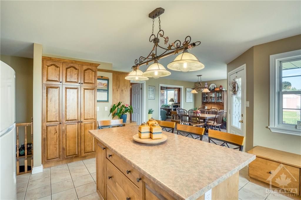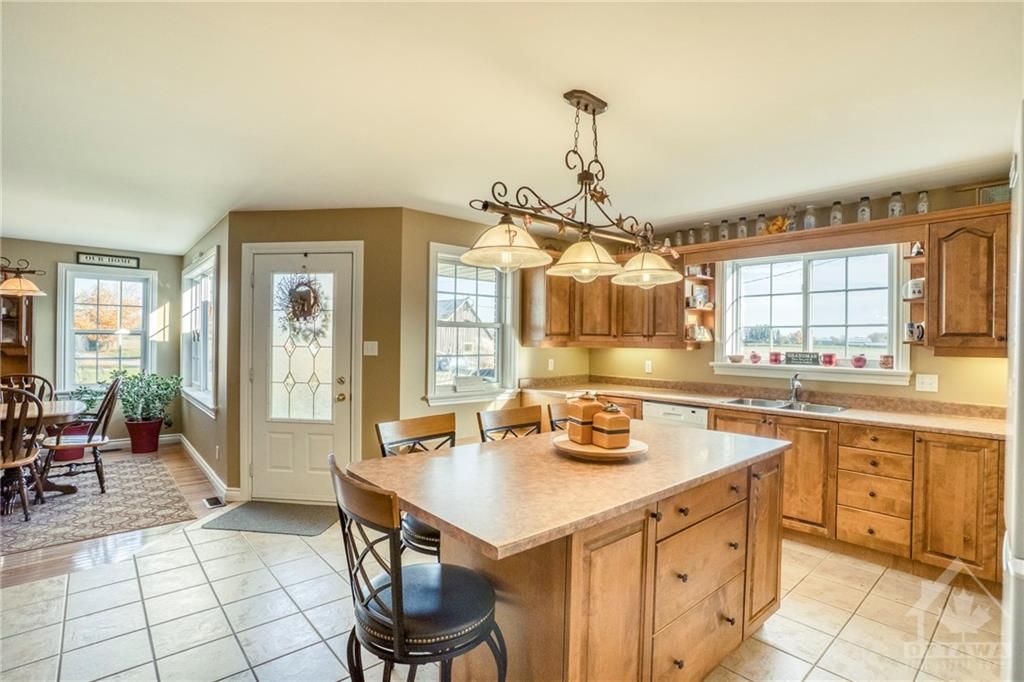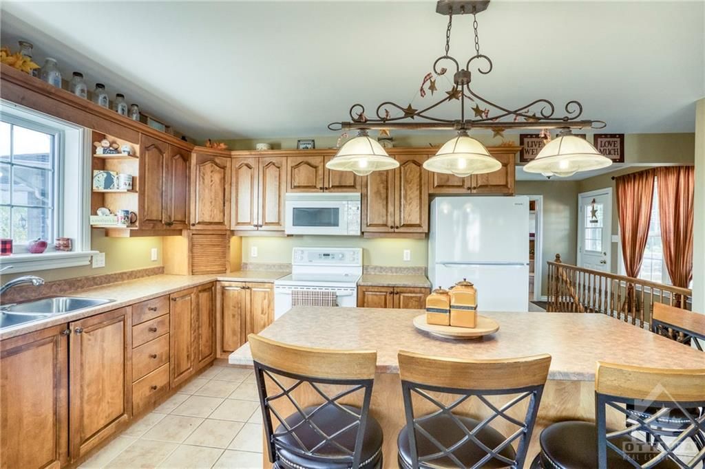 • Sun-filled kitchen with solid maple cupboards and a central island.