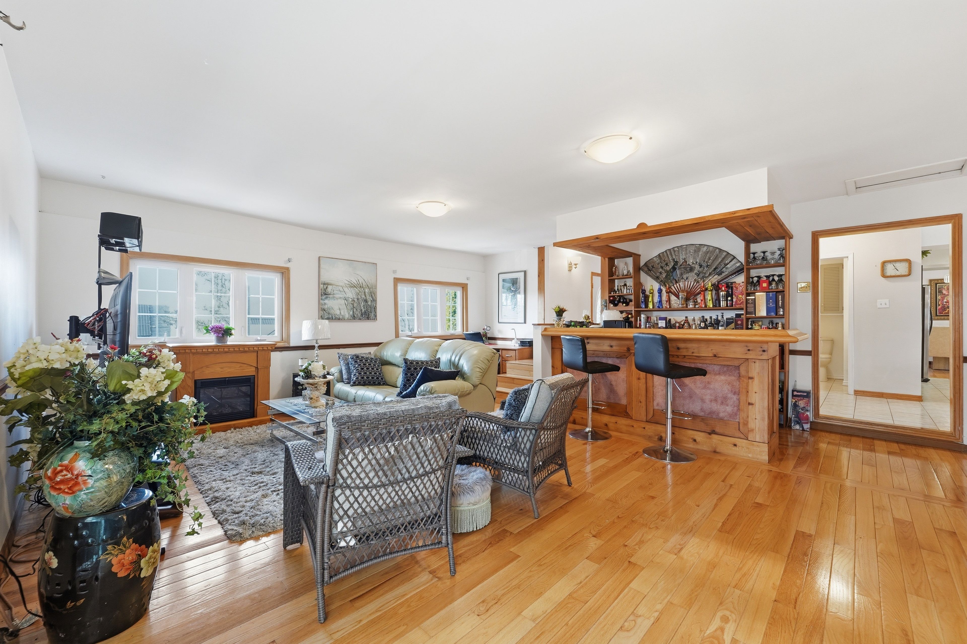 • Main floor features multiple living areas, a bar, and a covered deck.