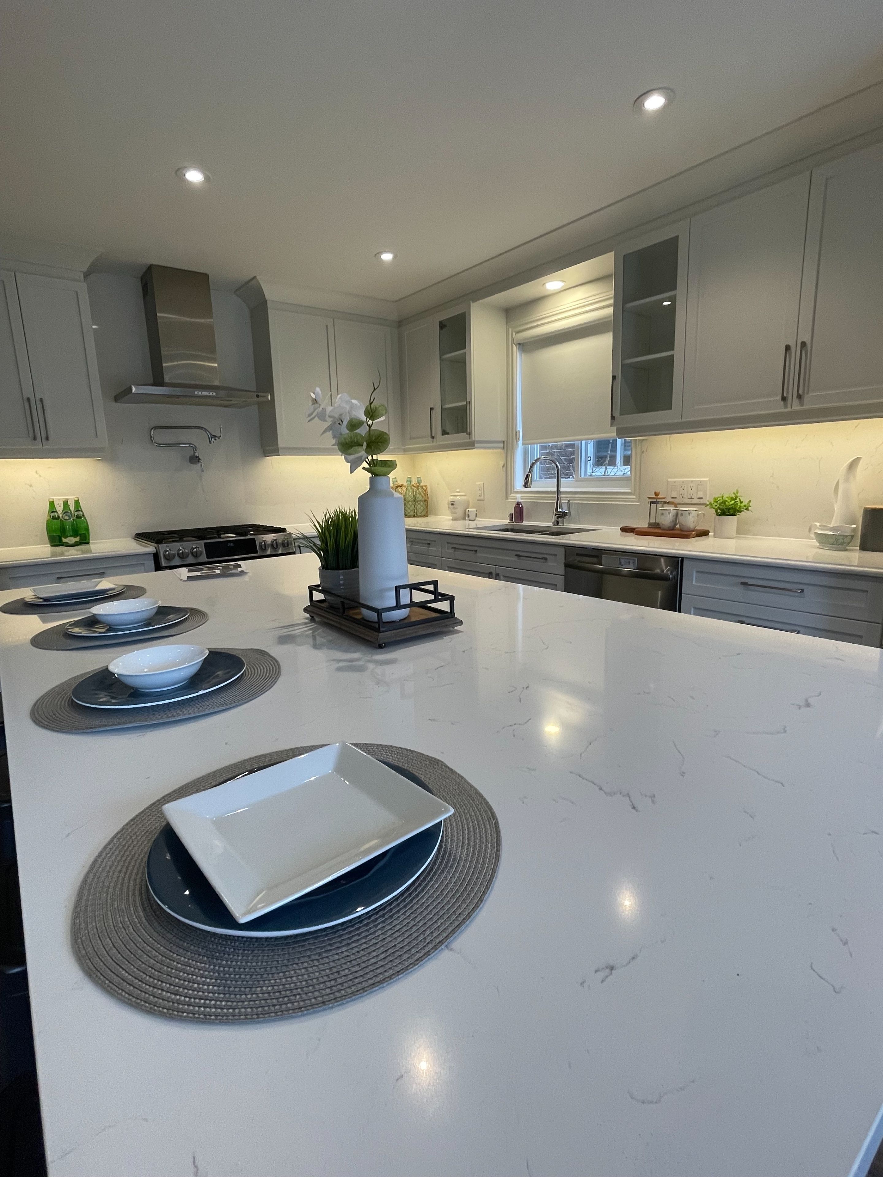 • Stunning kitchen features quartz countertops, stainless steel appliances, and oversized island.