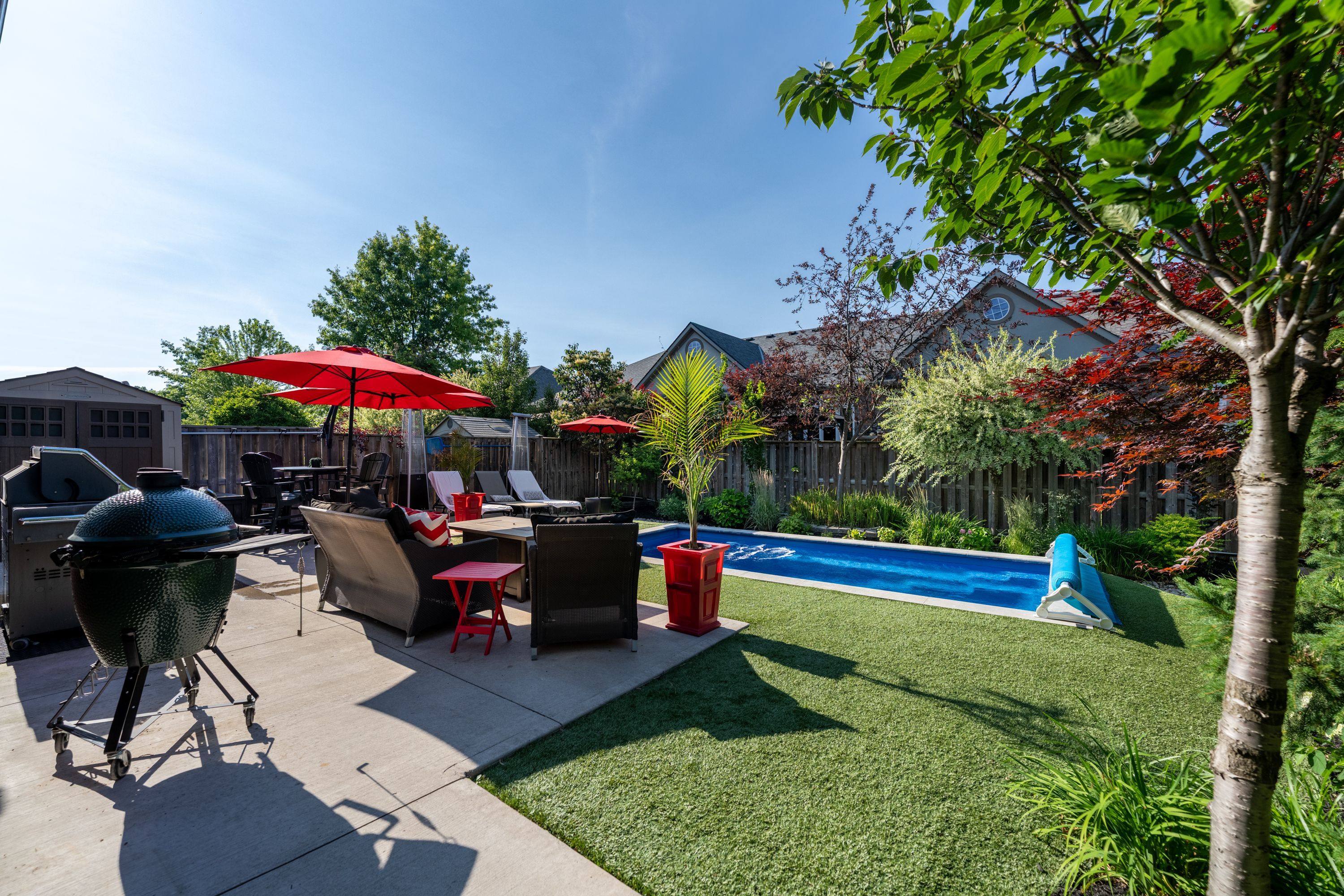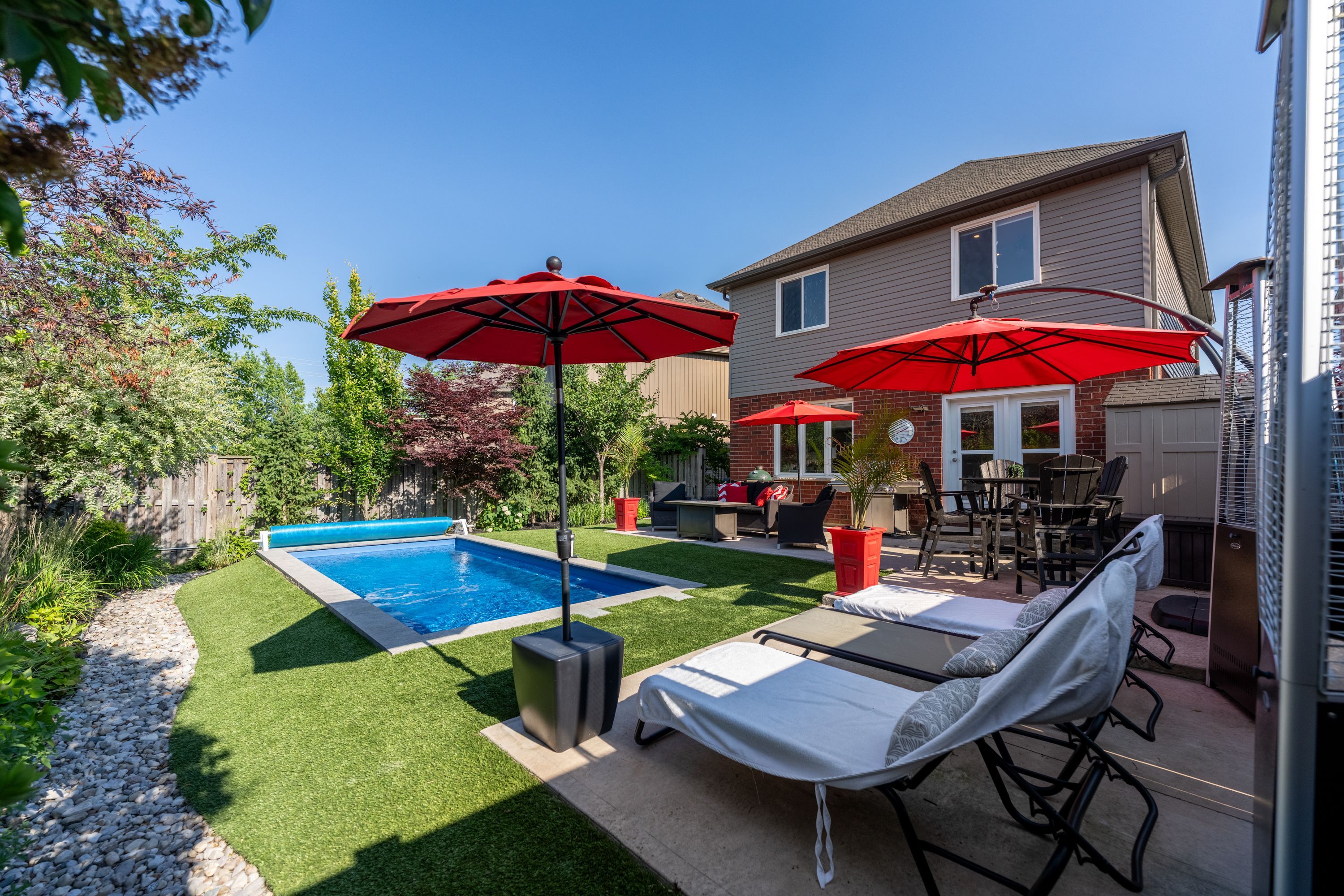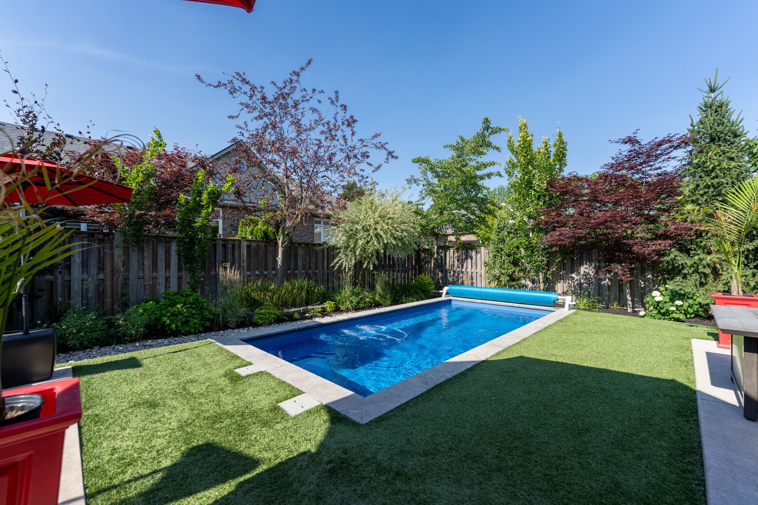 • Low-maintenance backyard with premium turf and a heated saltwater pool.