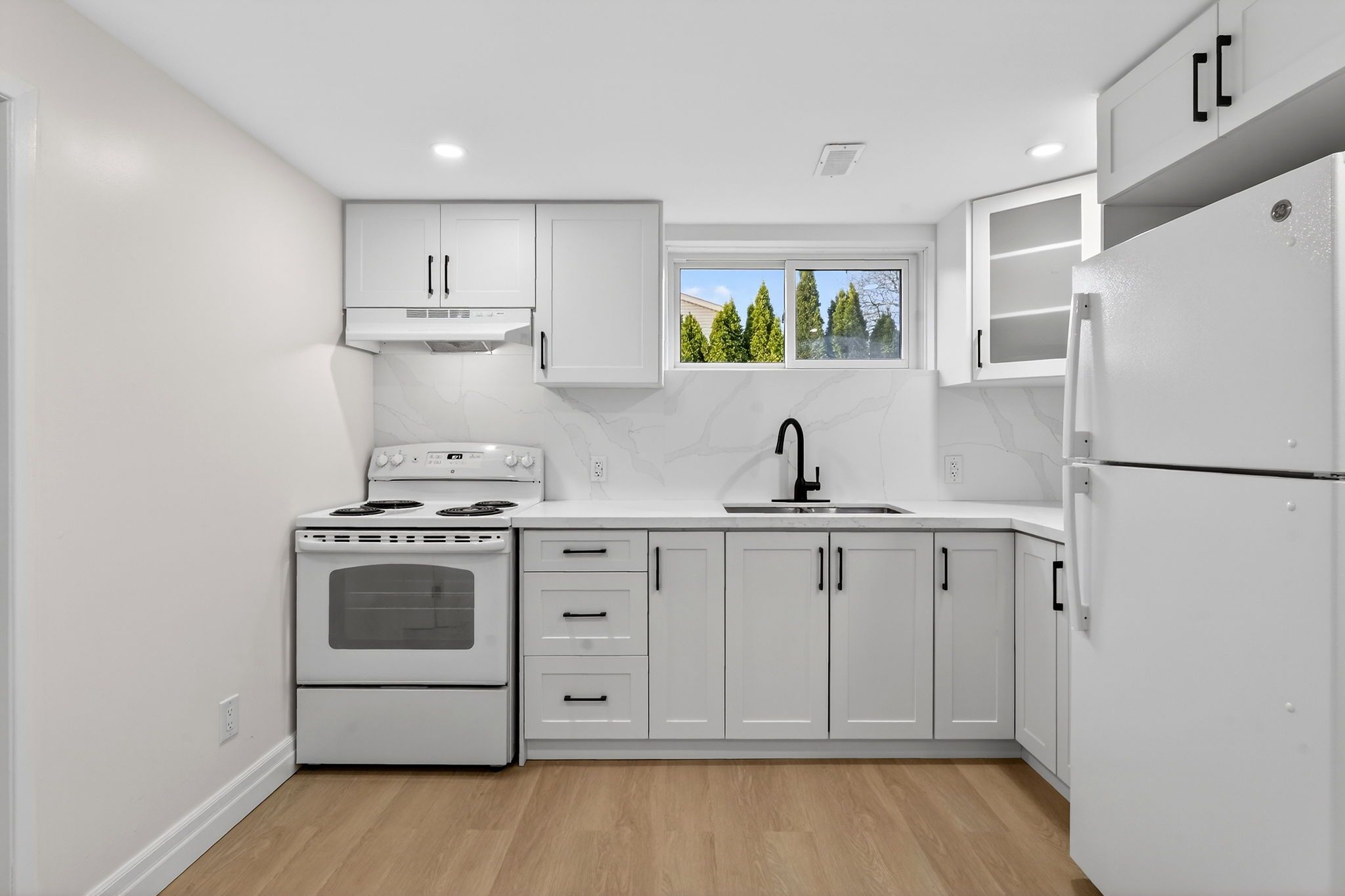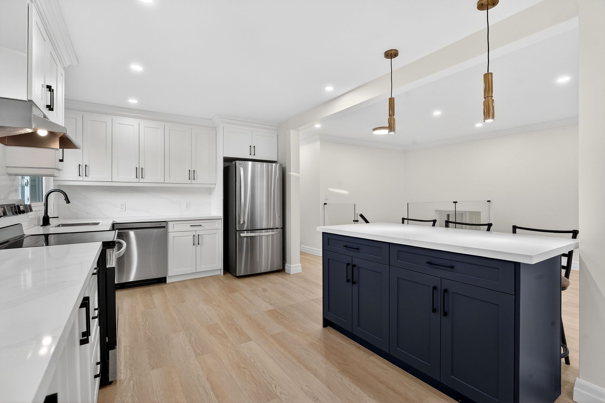 • Stylish kitchen with quartz countertops and a unique blue island.