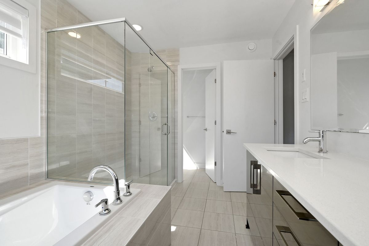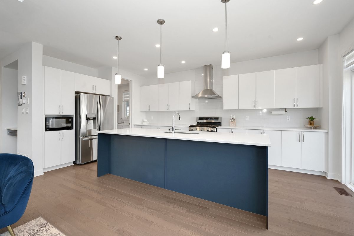 • Modern kitchen features quartz countertops and a walk-in pantry.