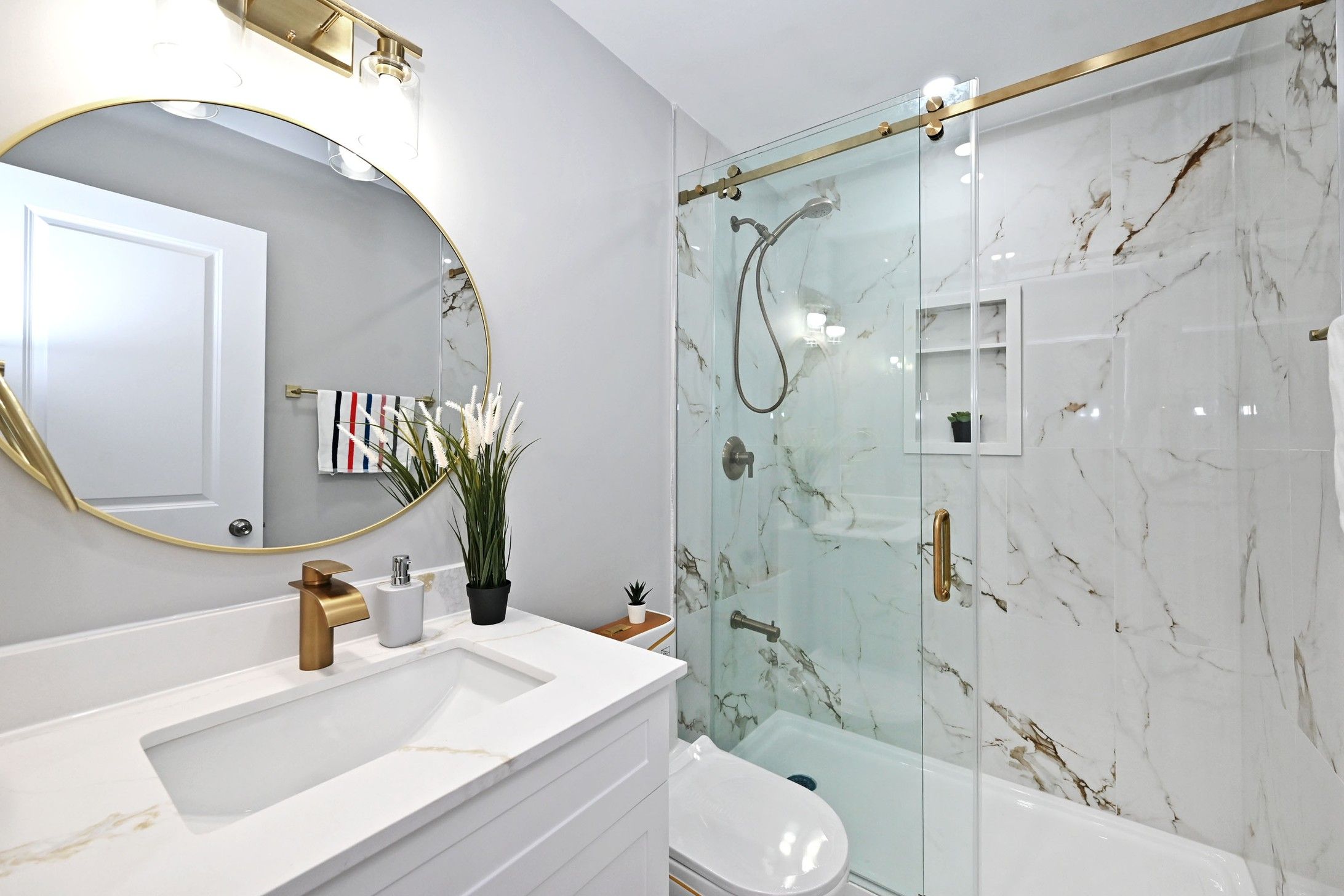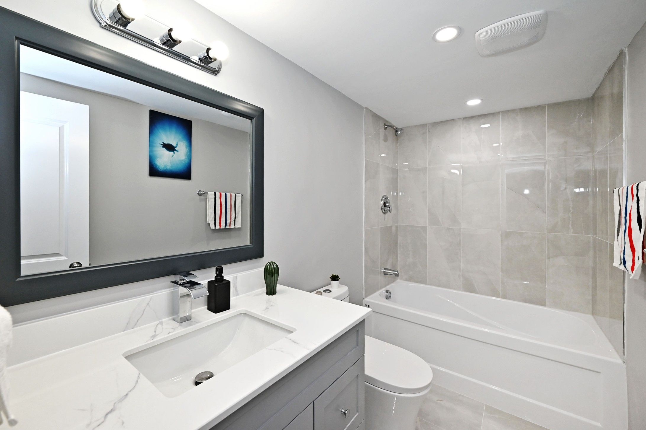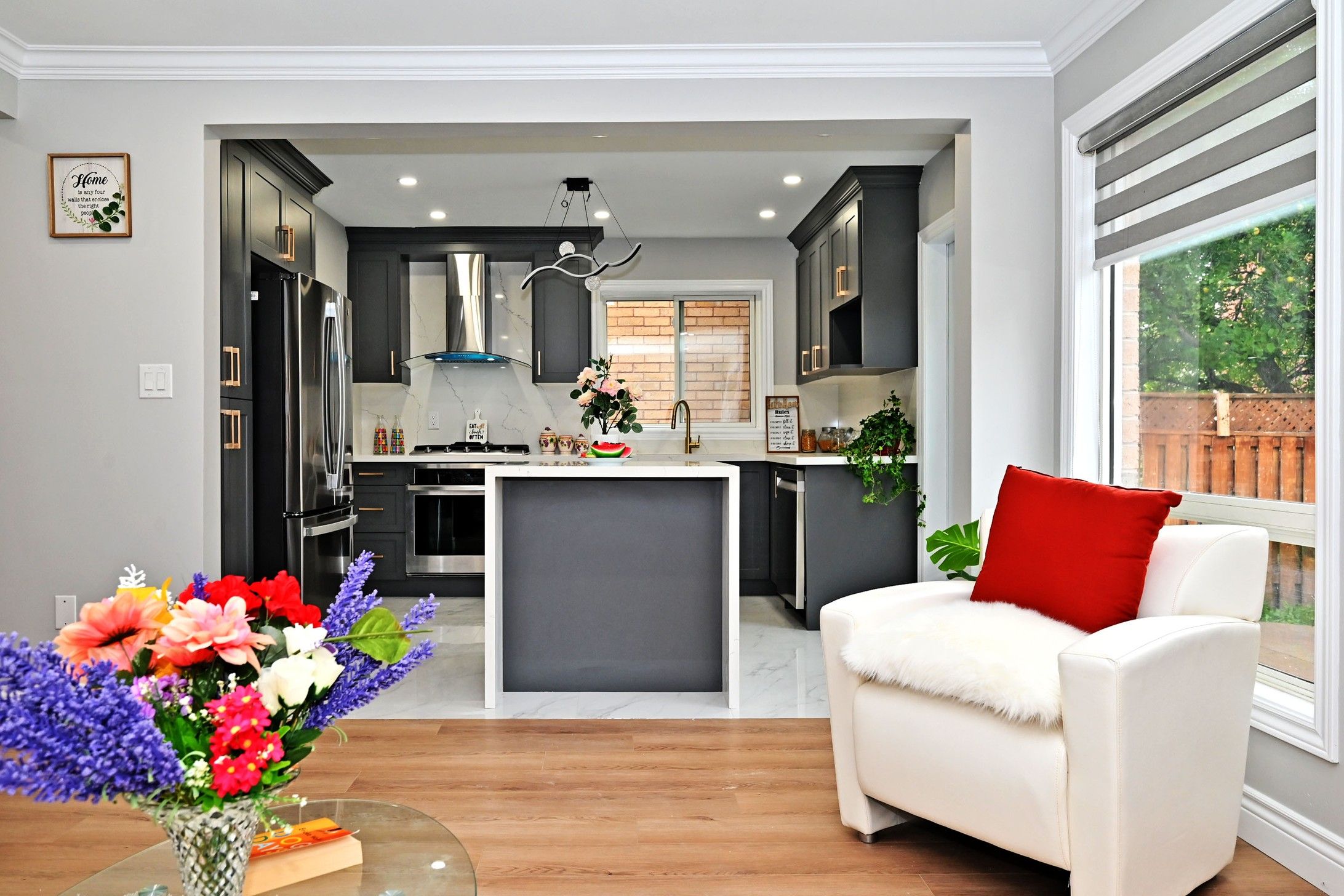 • Fully renovated home with a modern kitchen featuring quartz countertops and stainless steel appliances.