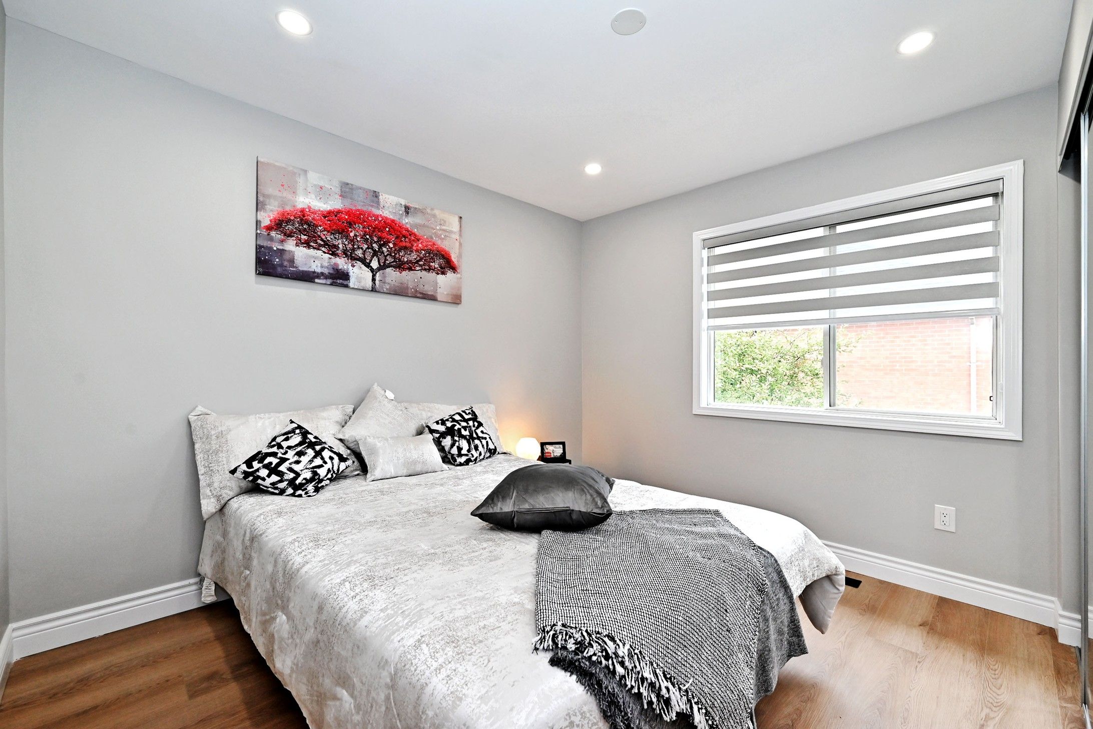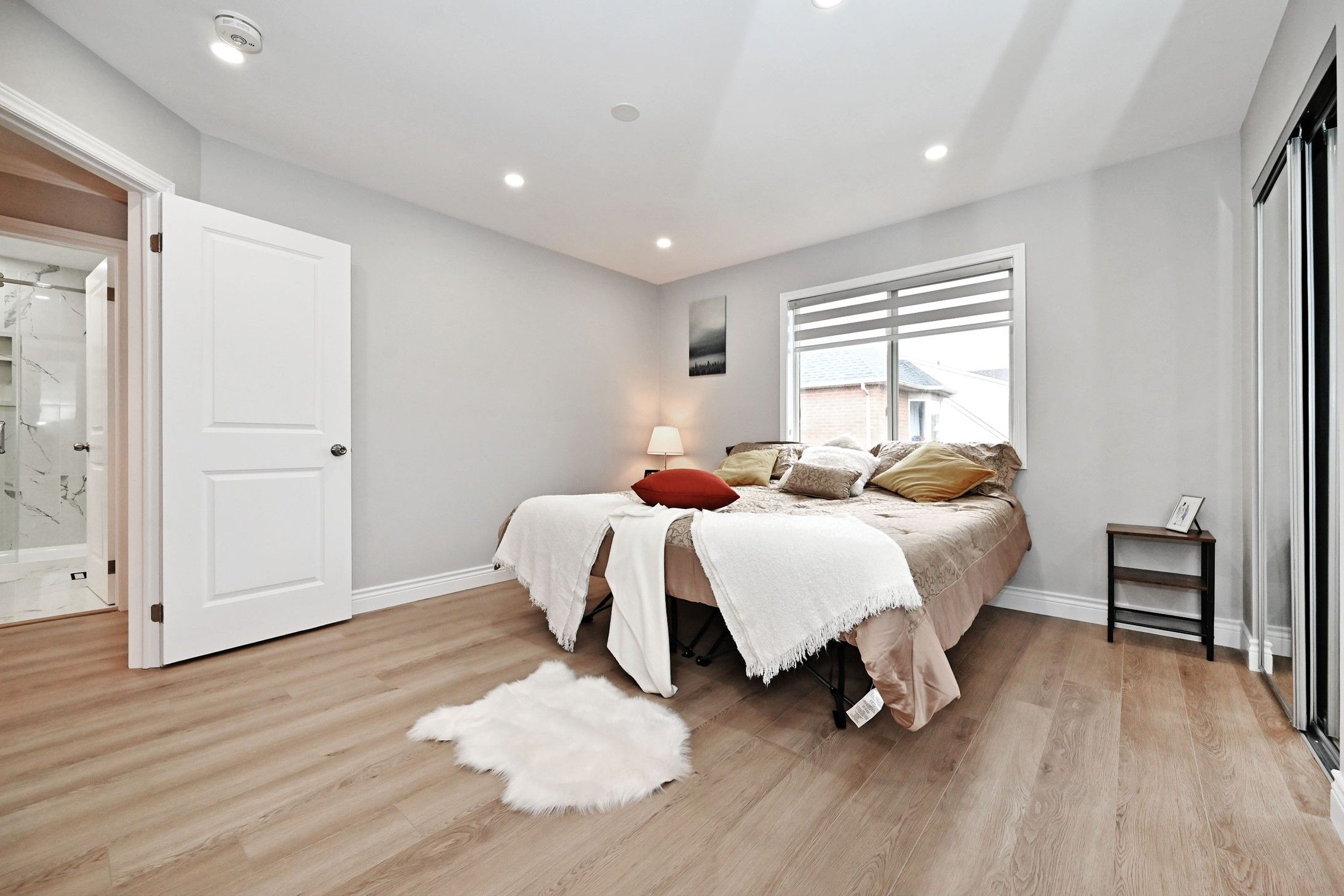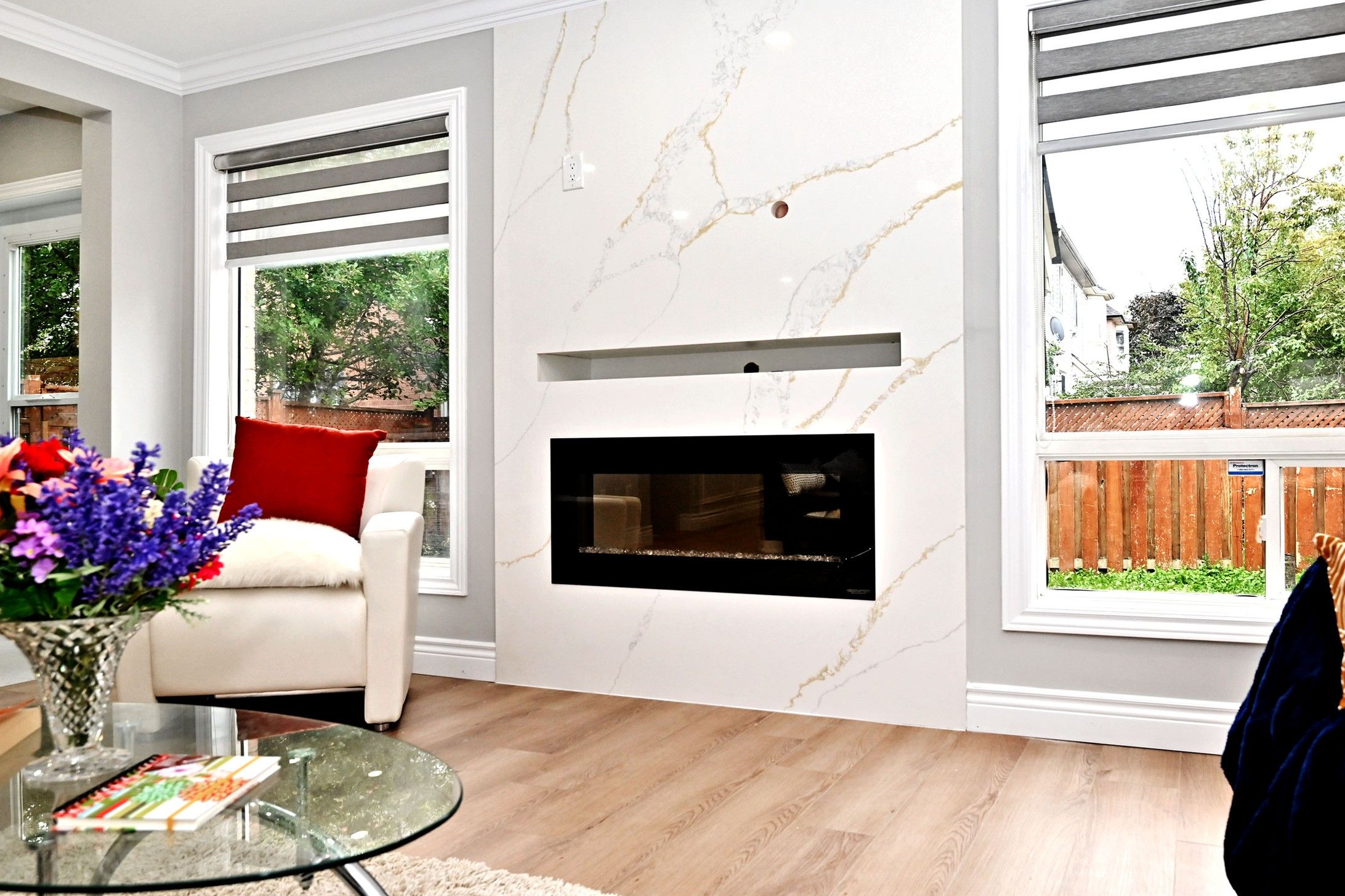 • Bright living spaces with pot lights and a sleek electric fireplace.