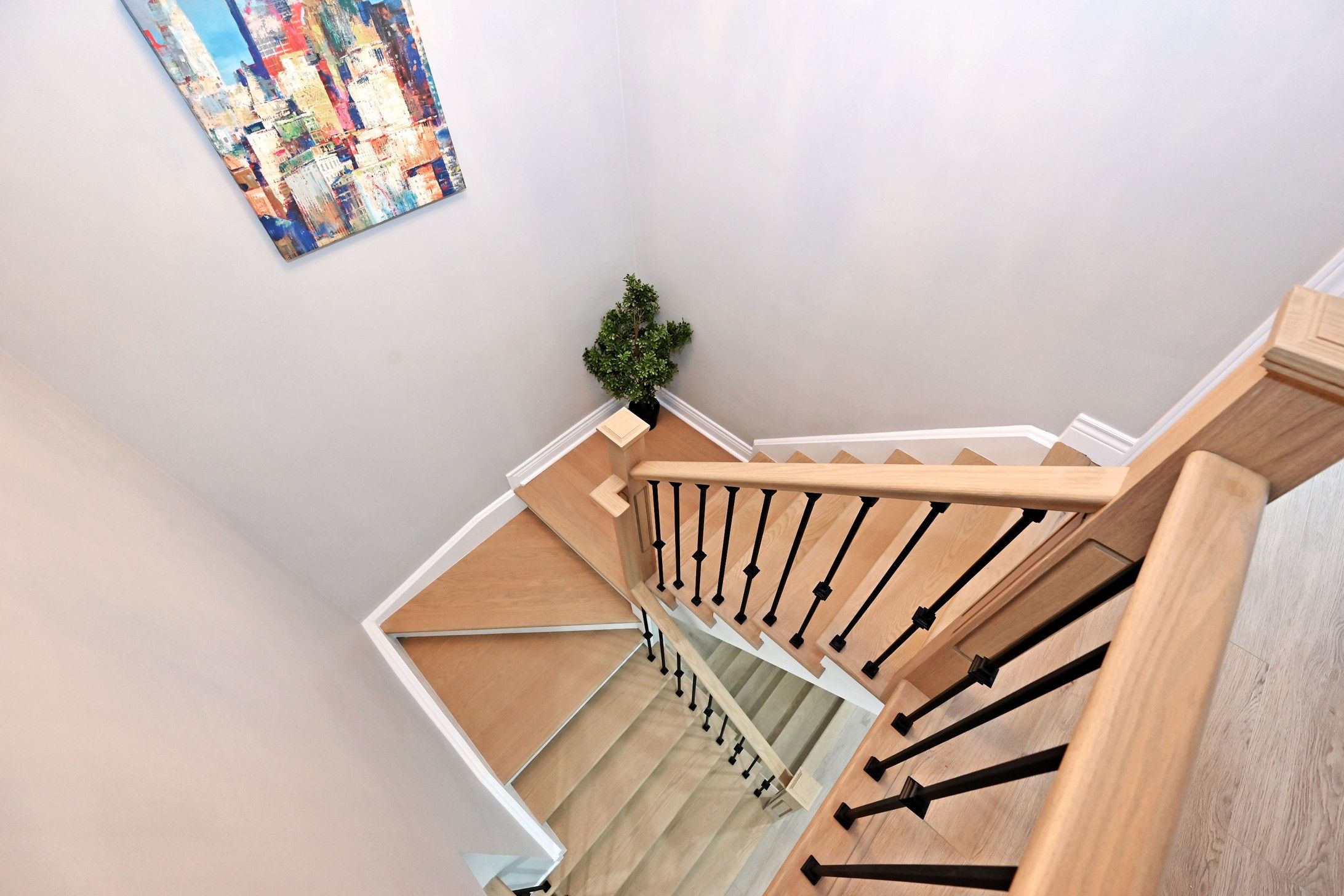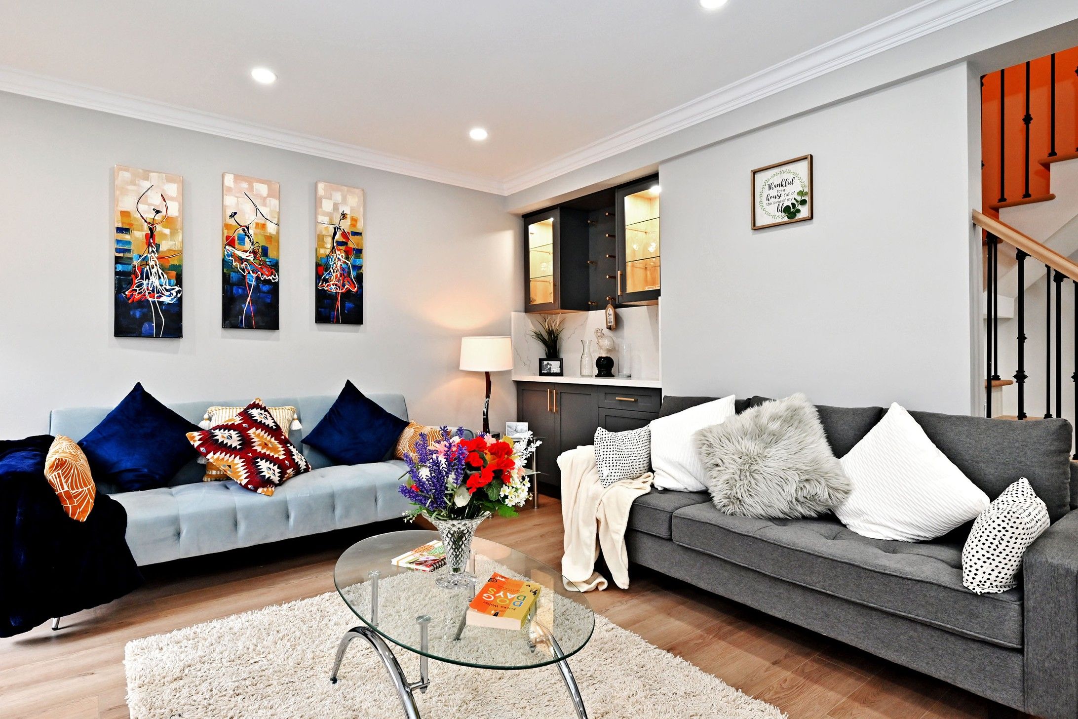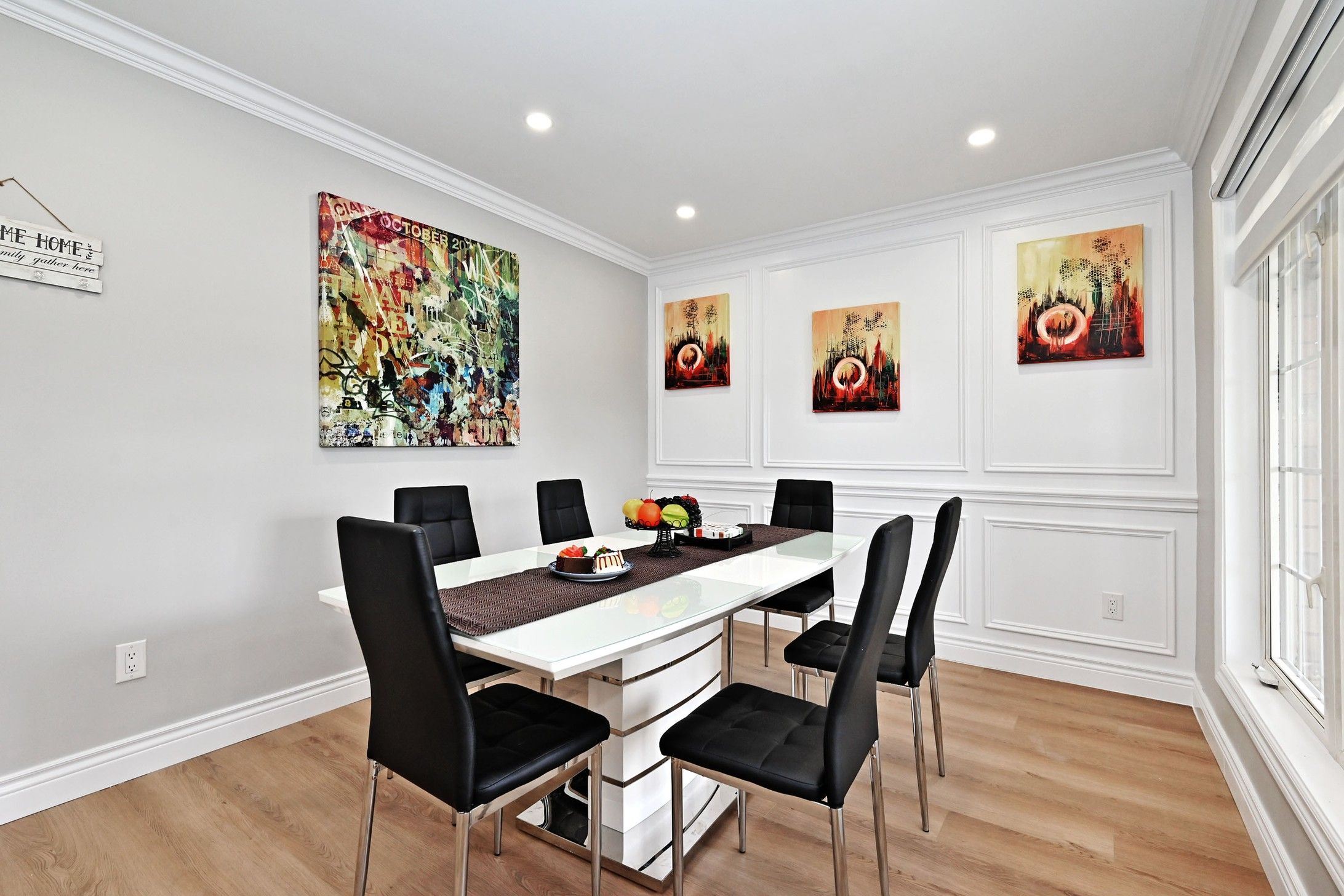 • Bright living spaces with pot lights and a sleek electric fireplace.