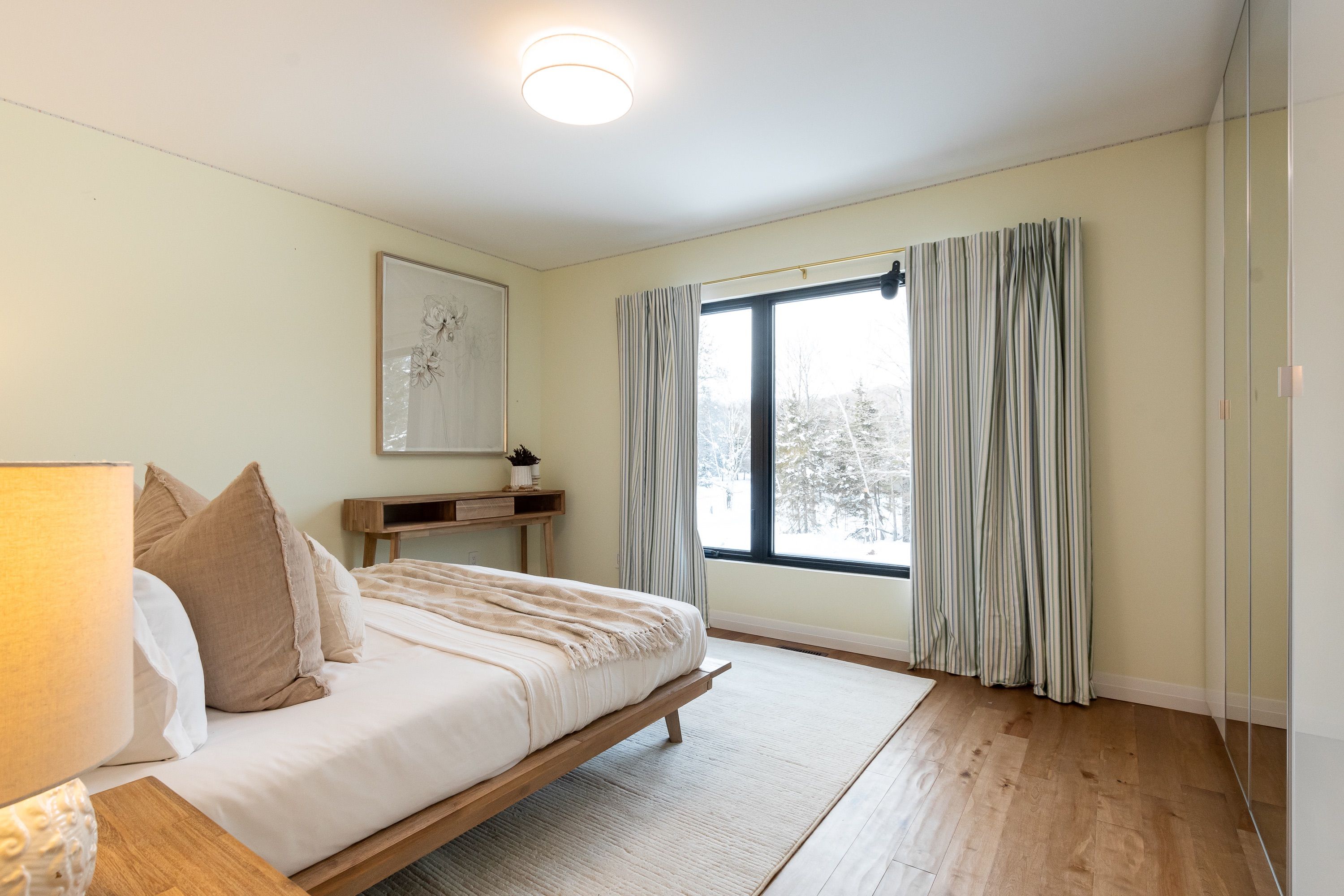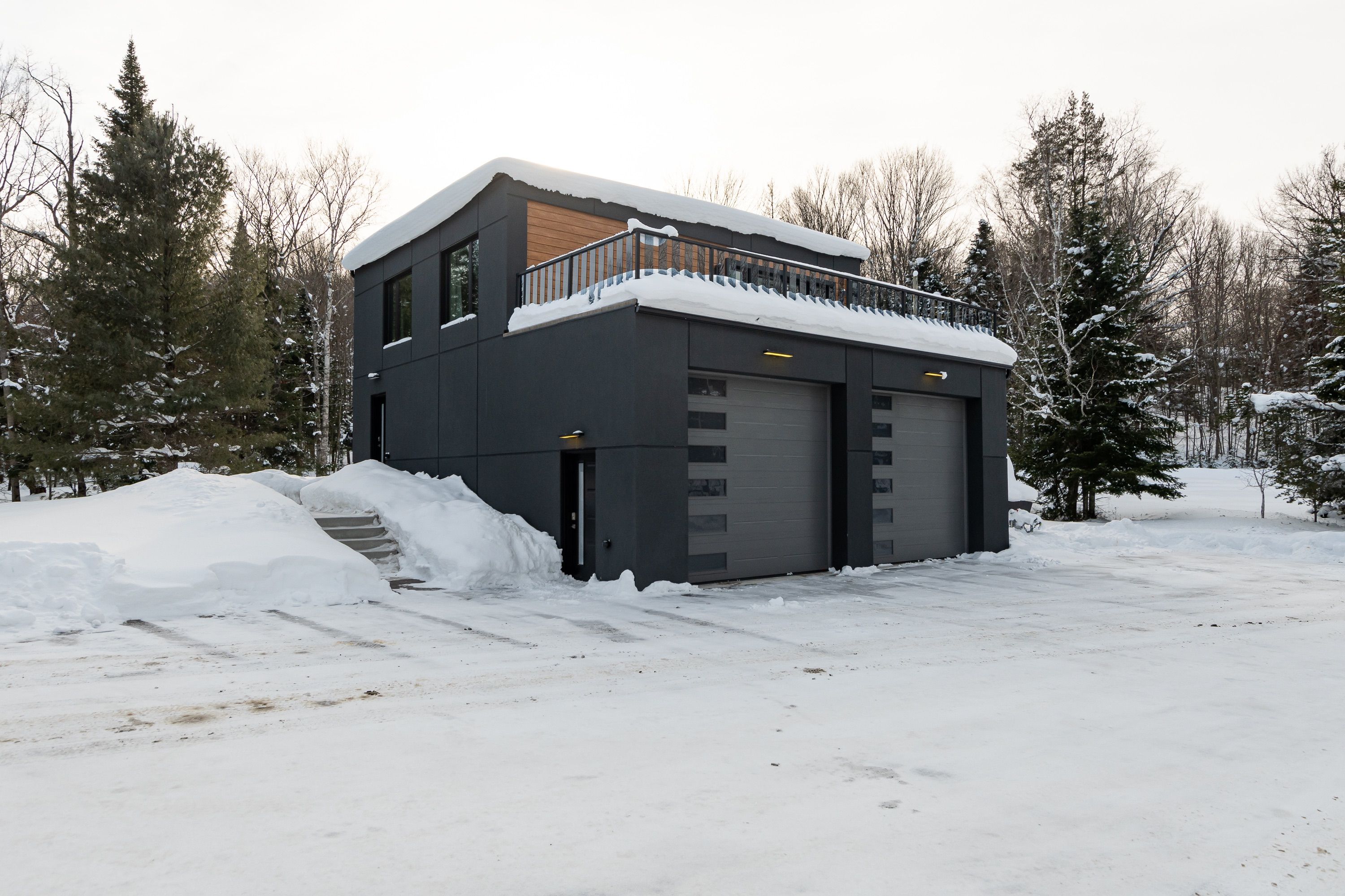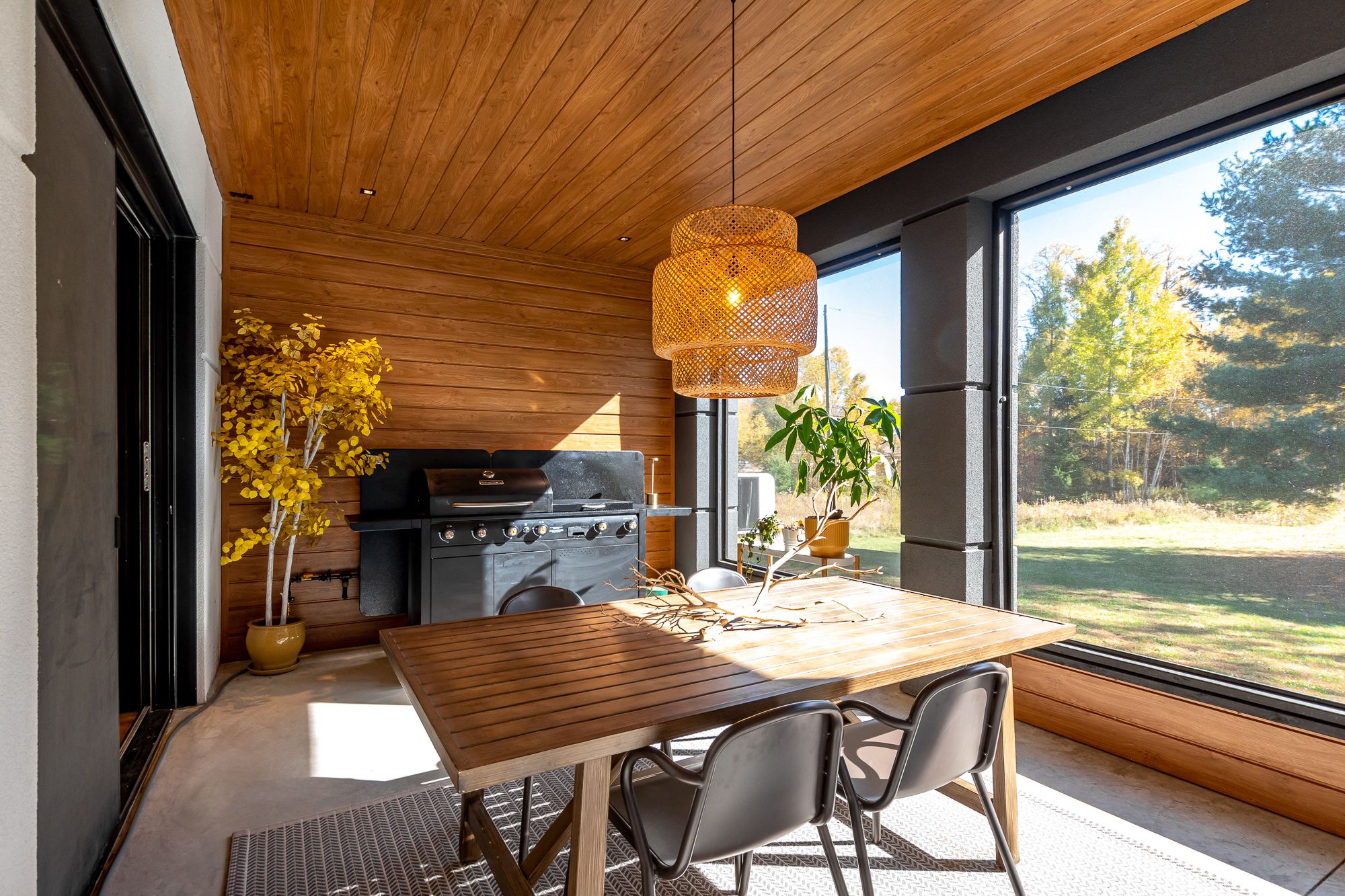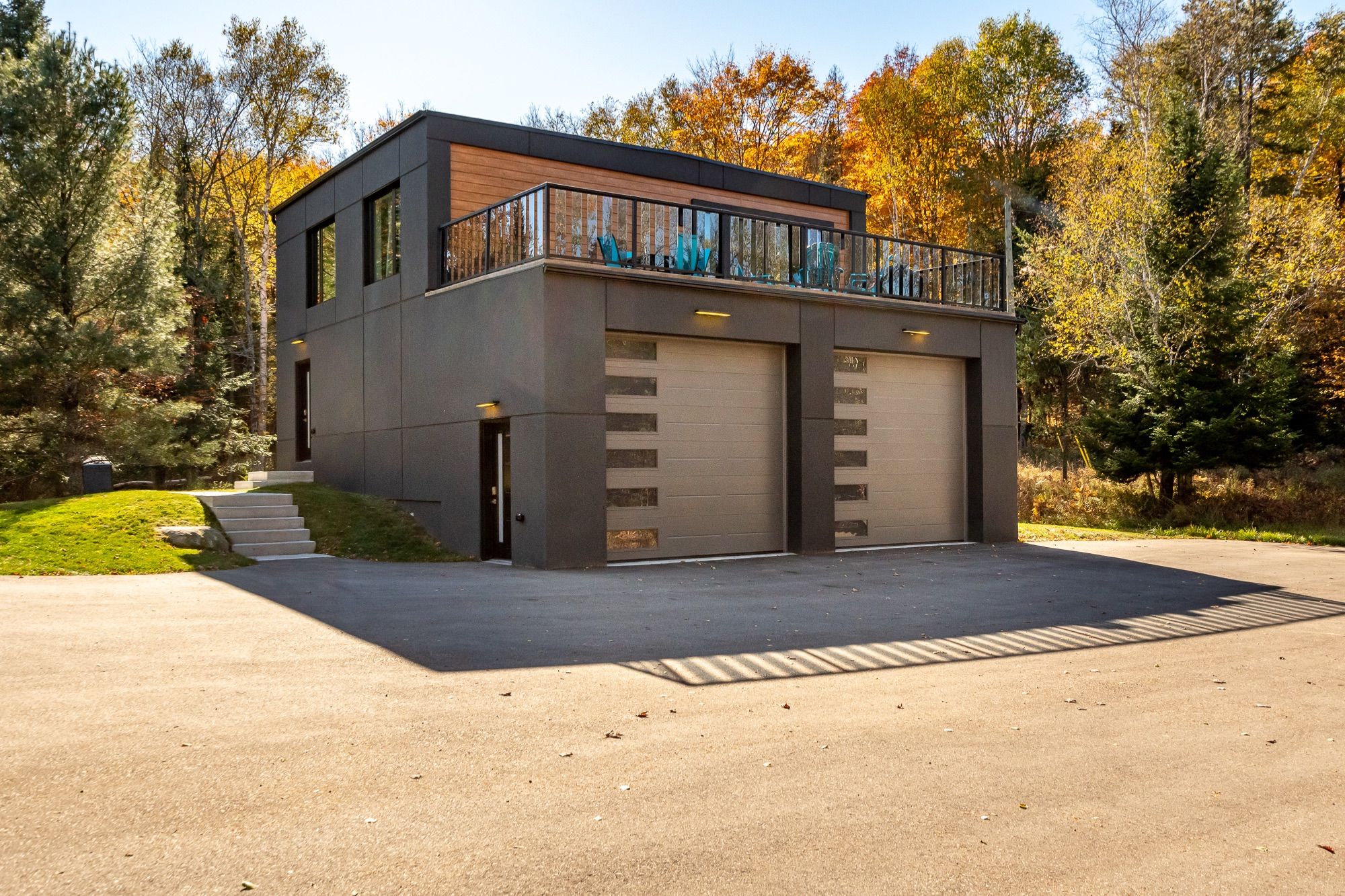 This exceptional 2024-built modern estate sits on over 3 acres of private, beautifully balanced cleared land & woodland, offering architectural distinction alongside flexibility for incoming generation, extended family living, or a private nanny suite. Designed w/ precision & mid-century sophistication, it blends refined modern living w/ thoughtful versatility. A standout feature is the fully self contained 2-bedroom upper level apartment w/ private entrance above the detached garage. Currently rented for $3,200 per month, this beautifully finished suite includes a modern kitchen, bright living area, private deck, 4 piece bath w/ heated floors & in-suite laundry - ideal for rental income, multi generational living, adult children, guests or a live-in nanny. In the main residence, a spacious foyer opens to bright open-concept living, dining & bespoke polynesian-inspired kitchen. A striking staircase features block hardwood treads floating on custom metal mono-stringers encased in plate-glass railings. Oversized sliders from the dining area lead to a screened porch w/ propane hookups for bbq & fire table, blending indoor & outdoor living. Main floor includes powder room, mudroom w/ storage & inside access to attached single-car garage. Upstairs, the primary suite offers a sitting area, sliders to a south-facing balcony, walk-through closet & spa-like 5pc ensuite w/ double sinks, dual shower & heated floors. Two additional bedrooms share a 3pc bath, also w/ heated floors. The finished lower level features a cozy rec room w/ projector & surround sound, a bedroom w/ custom millwork, 4pc bath w/ heated floors & laundry area, perfect for family or guests. Heated & cooled 30'x38' detached shop w/ 200-amp service, 13' ceilings & 11'x12' overhead doors, plus an upper-level 2-bed apartment w/ private entrance. Both the main residence & detached garage are built w/ icf. High-efficiency heat pumps, ev charger & fibre-optic internet complete this meticulously crafted modern estate.