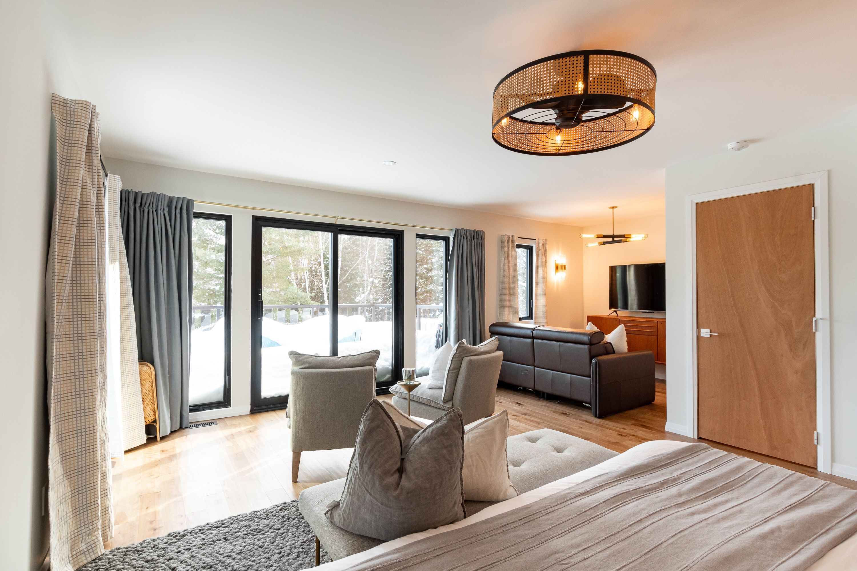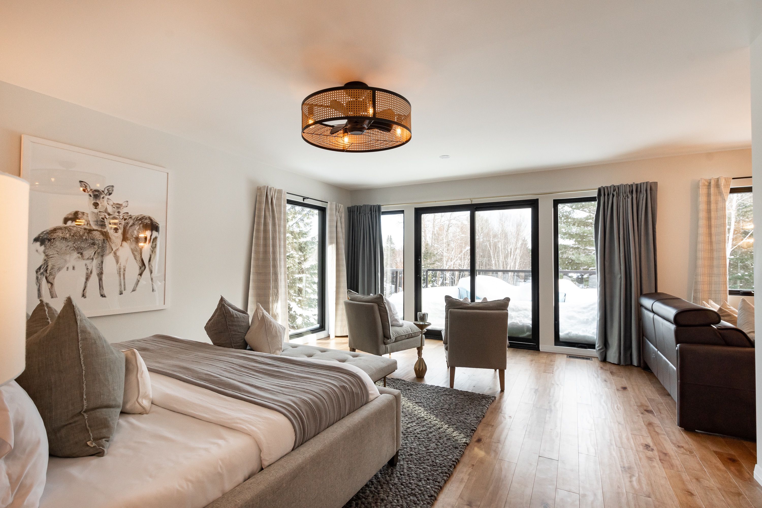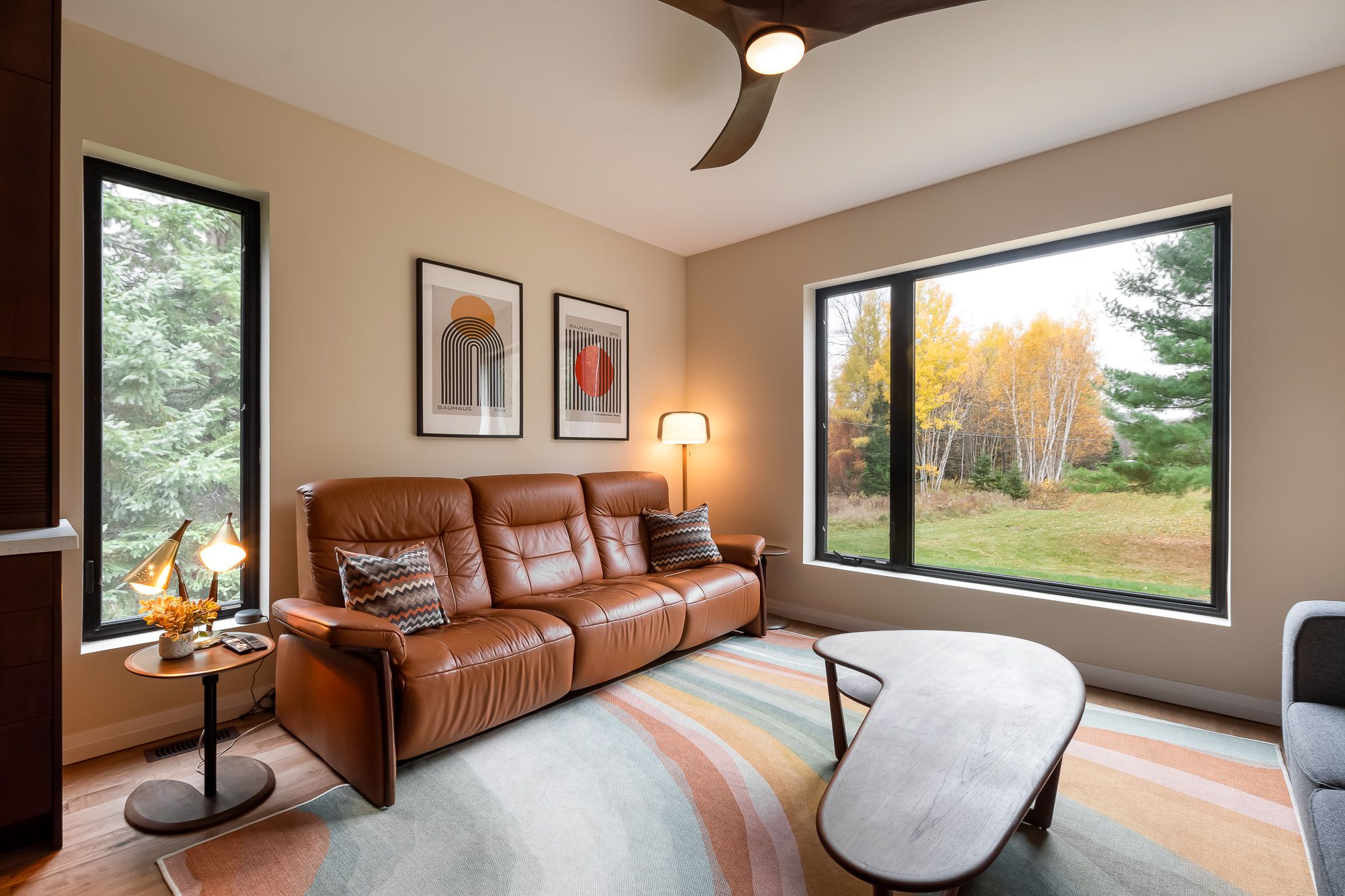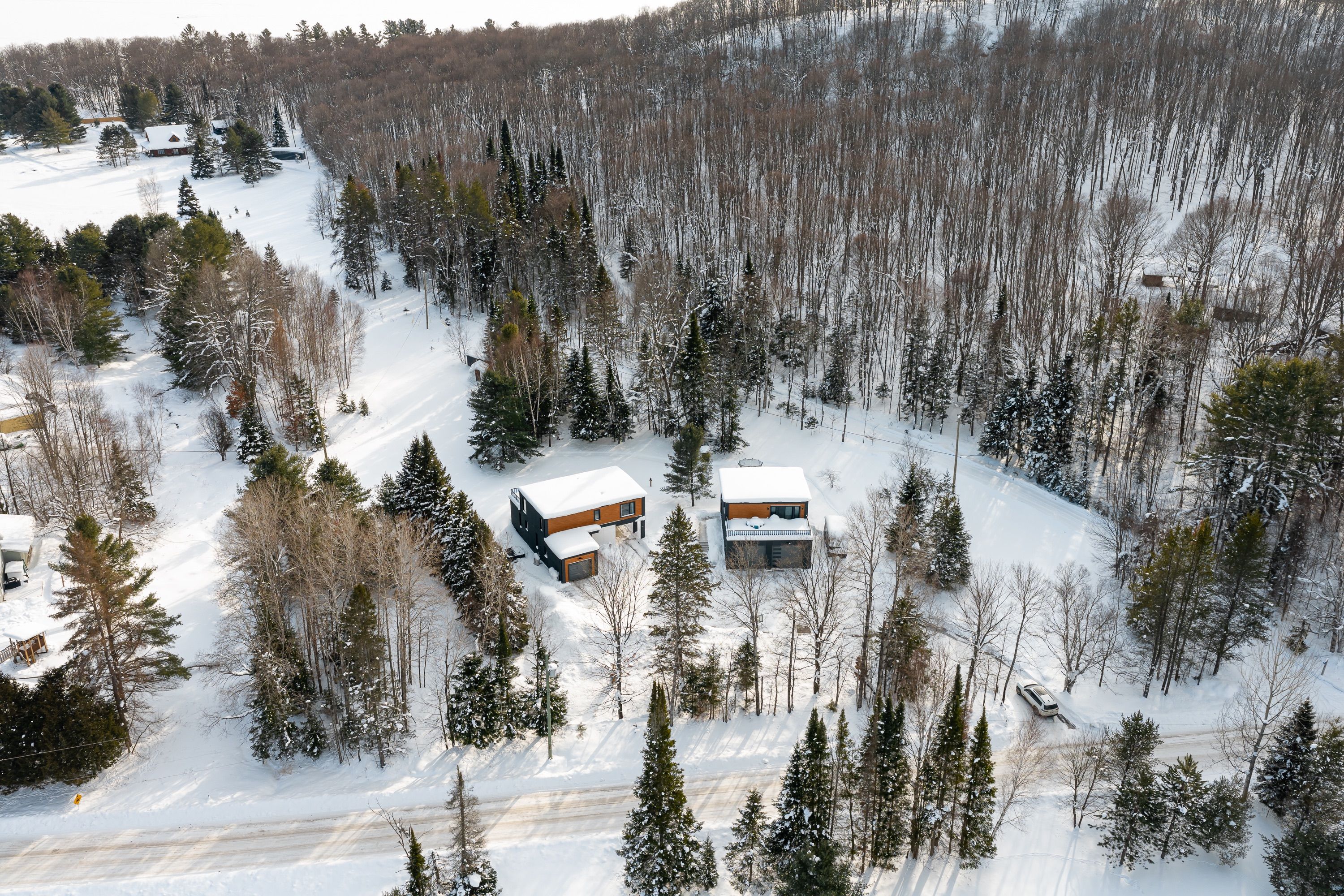 This exceptional 2024-built modern estate sits on over 3 acres of private, beautifully balanced cleared land & woodland, offering architectural distinction alongside flexibility for incoming generation, extended family living, or a private nanny suite. Designed w/ precision & mid-century sophistication, it blends refined modern living w/ thoughtful versatility. A standout feature is the fully self contained 2-bedroom upper level apartment w/ private entrance above the detached garage. Currently rented for $3,200 per month, this beautifully finished suite includes a modern kitchen, bright living area, private deck, 4 piece bath w/ heated floors & in-suite laundry - ideal for rental income, multi generational living, adult children, guests or a live-in nanny. In the main residence, a spacious foyer opens to bright open-concept living, dining & bespoke polynesian-inspired kitchen. A striking staircase features block hardwood treads floating on custom metal mono-stringers encased in plate-glass railings. Oversized sliders from the dining area lead to a screened porch w/ propane hookups for bbq & fire table, blending indoor & outdoor living. Main floor includes powder room, mudroom w/ storage & inside access to attached single-car garage. Upstairs, the primary suite offers a sitting area, sliders to a south-facing balcony, walk-through closet & spa-like 5pc ensuite w/ double sinks, dual shower & heated floors. Two additional bedrooms share a 3pc bath, also w/ heated floors. The finished lower level features a cozy rec room w/ projector & surround sound, a bedroom w/ custom millwork, 4pc bath w/ heated floors & laundry area, perfect for family or guests. Heated & cooled 30'x38' detached shop w/ 200-amp service, 13' ceilings & 11'x12' overhead doors, plus an upper-level 2-bed apartment w/ private entrance. Both the main residence & detached garage are built w/ icf. High-efficiency heat pumps, ev charger & fibre-optic internet complete this meticulously crafted modern estate.