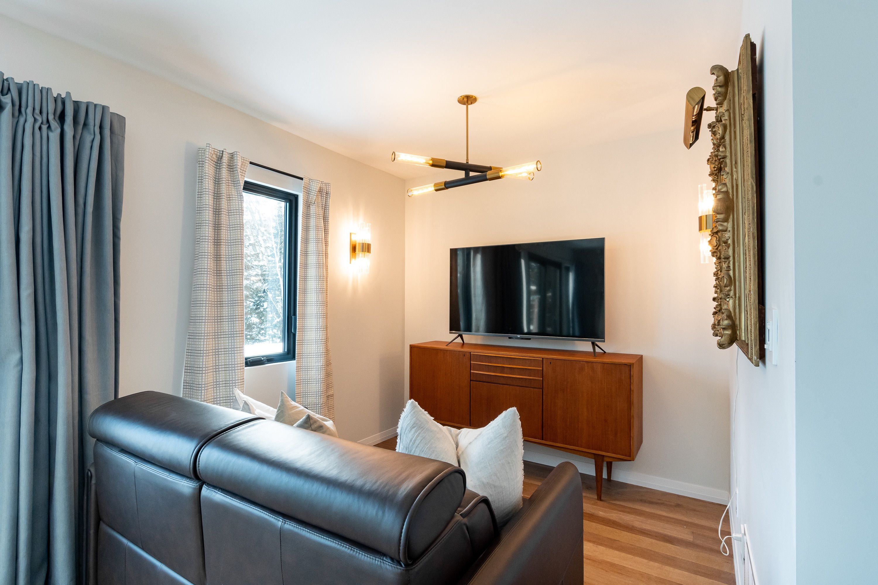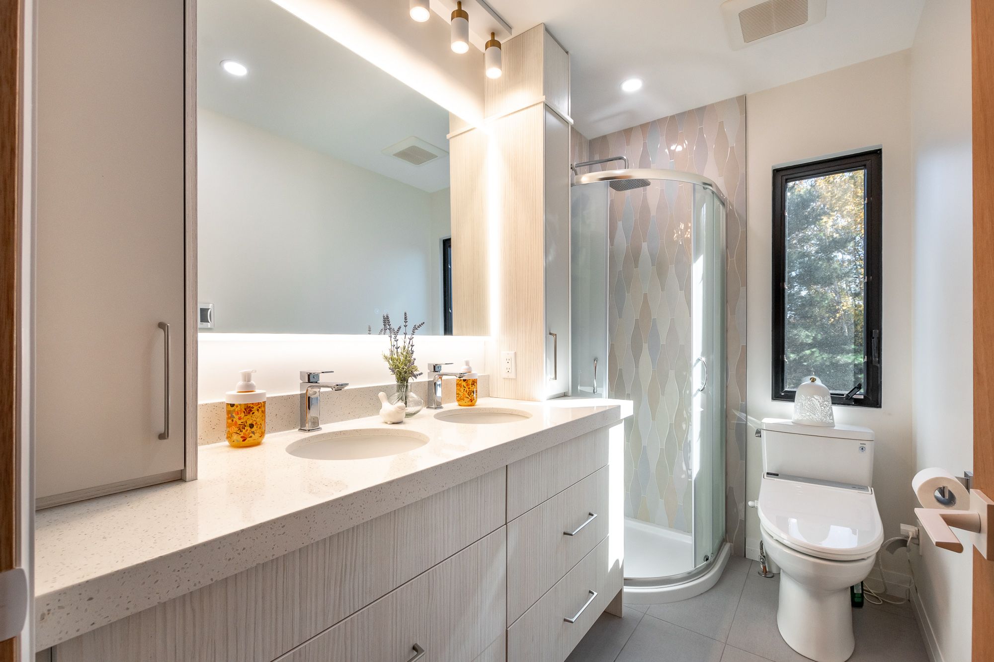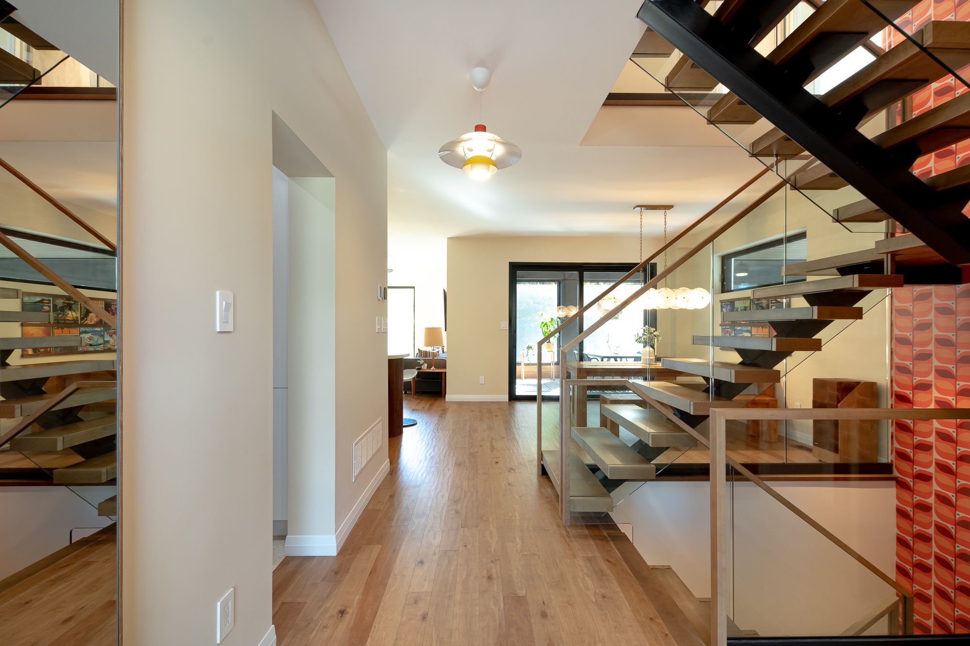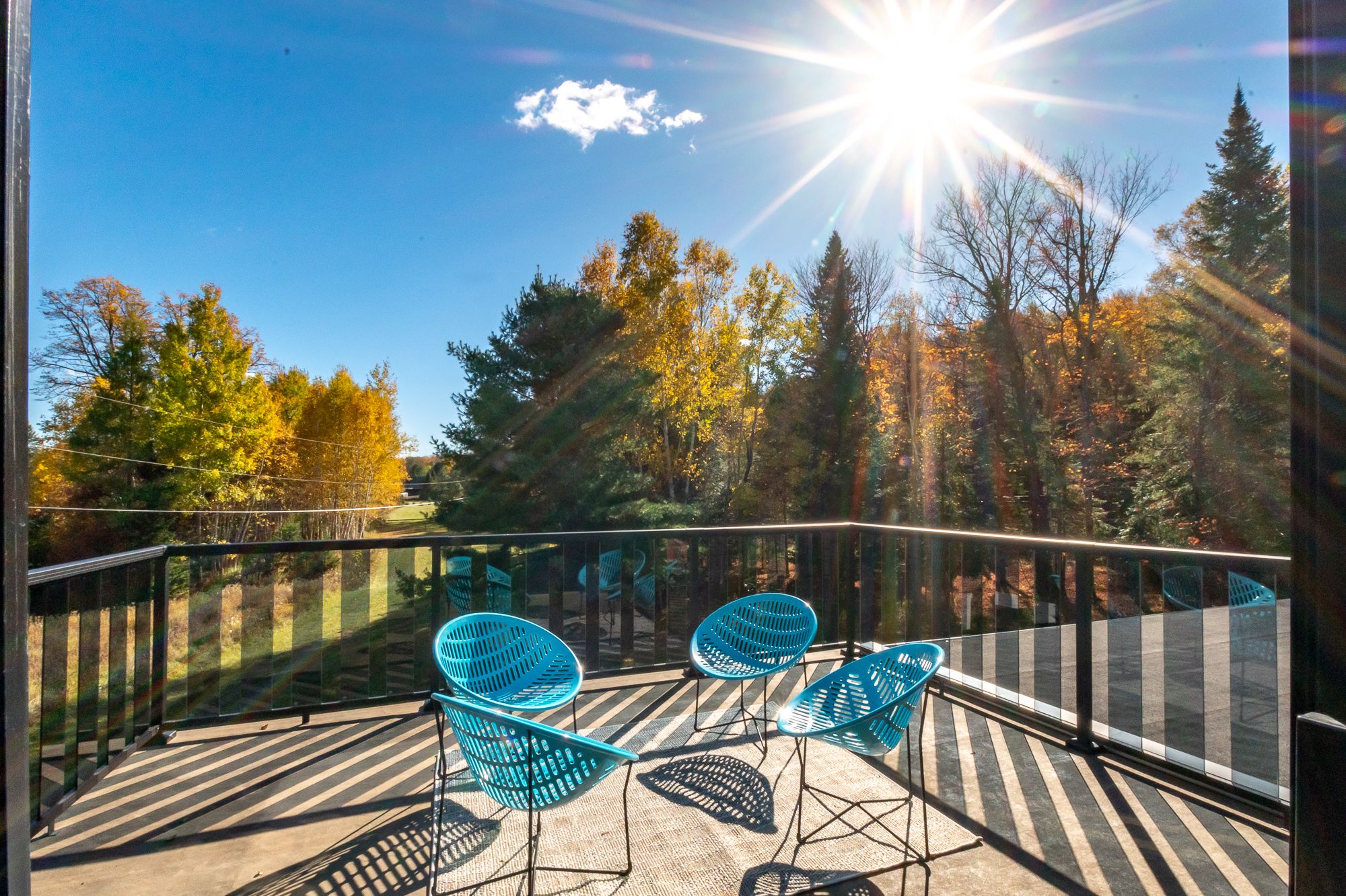 This exceptional 2024-built modern estate sits on over 3 acres of private, beautifully balanced cleared land & woodland, offering architectural distinction alongside flexibility for incoming generation, extended family living, or a private nanny suite. Designed w/ precision & mid-century sophistication, it blends refined modern living w/ thoughtful versatility. A standout feature is the fully self contained 2-bedroom upper level apartment w/ private entrance above the detached garage. Currently rented for $3,200 per month, this beautifully finished suite includes a modern kitchen, bright living area, private deck, 4 piece bath w/ heated floors & in-suite laundry - ideal for rental income, multi generational living, adult children, guests or a live-in nanny. In the main residence, a spacious foyer opens to bright open-concept living, dining & bespoke polynesian-inspired kitchen. A striking staircase features block hardwood treads floating on custom metal mono-stringers encased in plate-glass railings. Oversized sliders from the dining area lead to a screened porch w/ propane hookups for bbq & fire table, blending indoor & outdoor living. Main floor includes powder room, mudroom w/ storage & inside access to attached single-car garage. Upstairs, the primary suite offers a sitting area, sliders to a south-facing balcony, walk-through closet & spa-like 5pc ensuite w/ double sinks, dual shower & heated floors. Two additional bedrooms share a 3pc bath, also w/ heated floors. The finished lower level features a cozy rec room w/ projector & surround sound, a bedroom w/ custom millwork, 4pc bath w/ heated floors & laundry area, perfect for family or guests. Heated & cooled 30'x38' detached shop w/ 200-amp service, 13' ceilings & 11'x12' overhead doors, plus an upper-level 2-bed apartment w/ private entrance. Both the main residence & detached garage are built w/ icf. High-efficiency heat pumps, ev charger & fibre-optic internet complete this meticulously crafted modern estate.