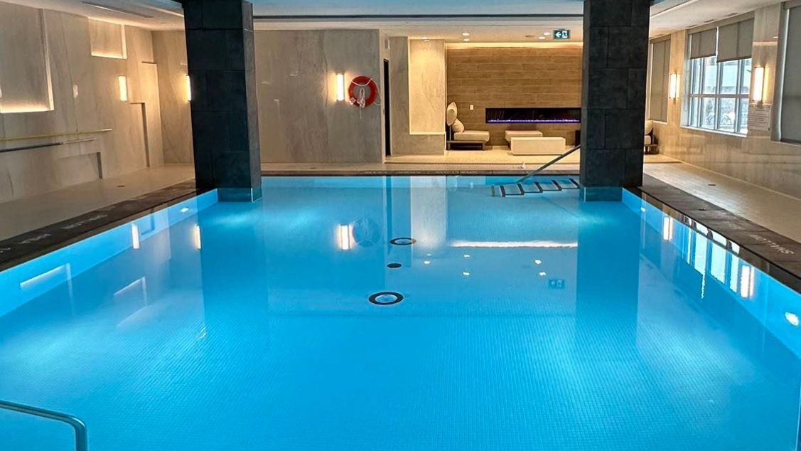 • Exclusive amenities include fitness room, sauna, and outdoor pool.