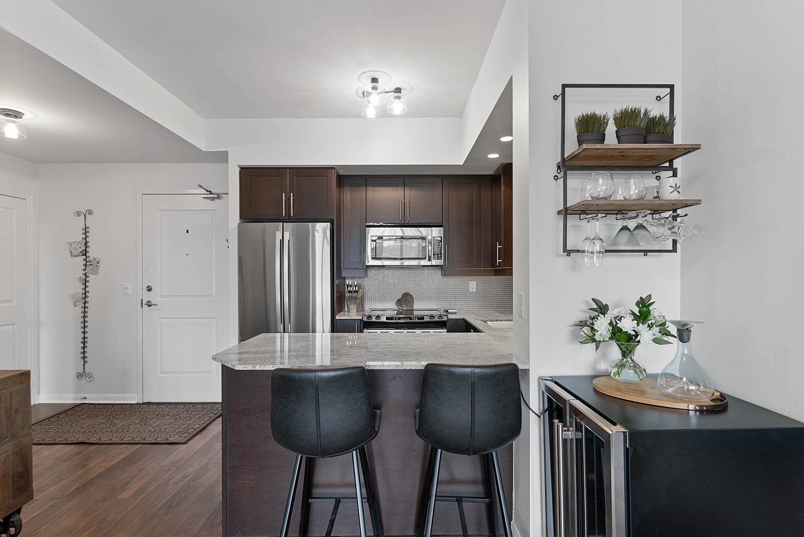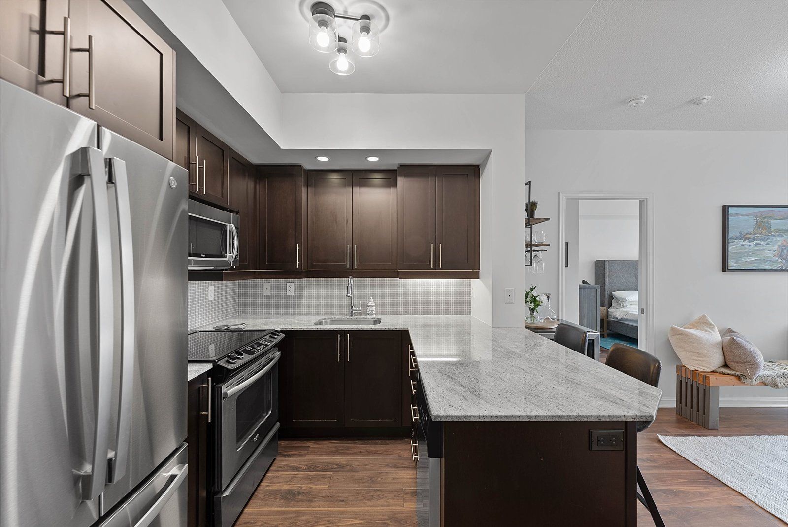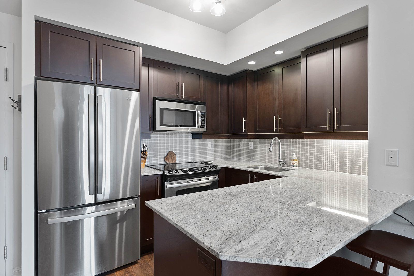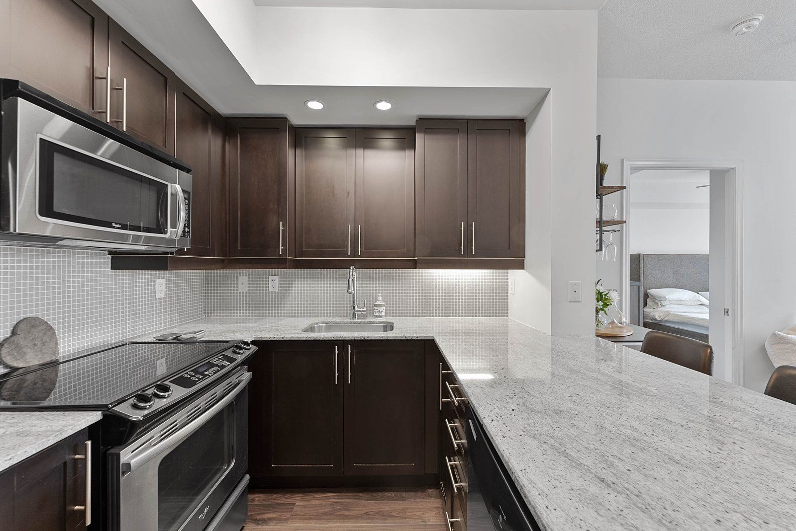 • Stylish kitchen featuring granite countertops and full-size stainless steel appliances.