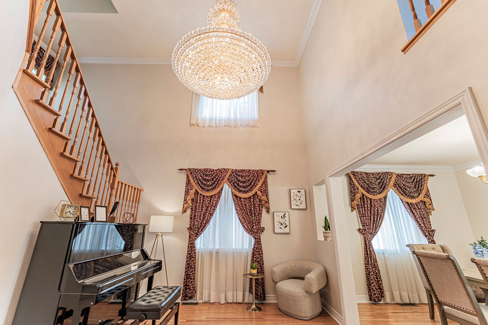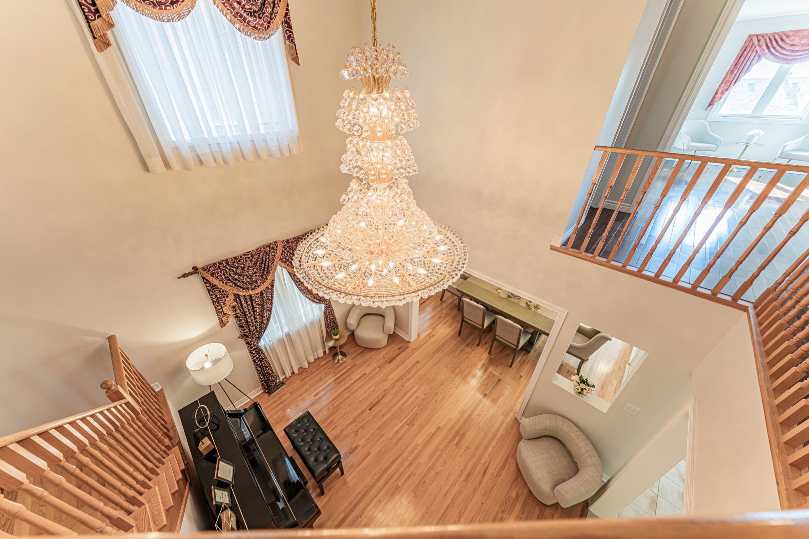 • Open layout featuring a designer chandelier and hardwood floors.