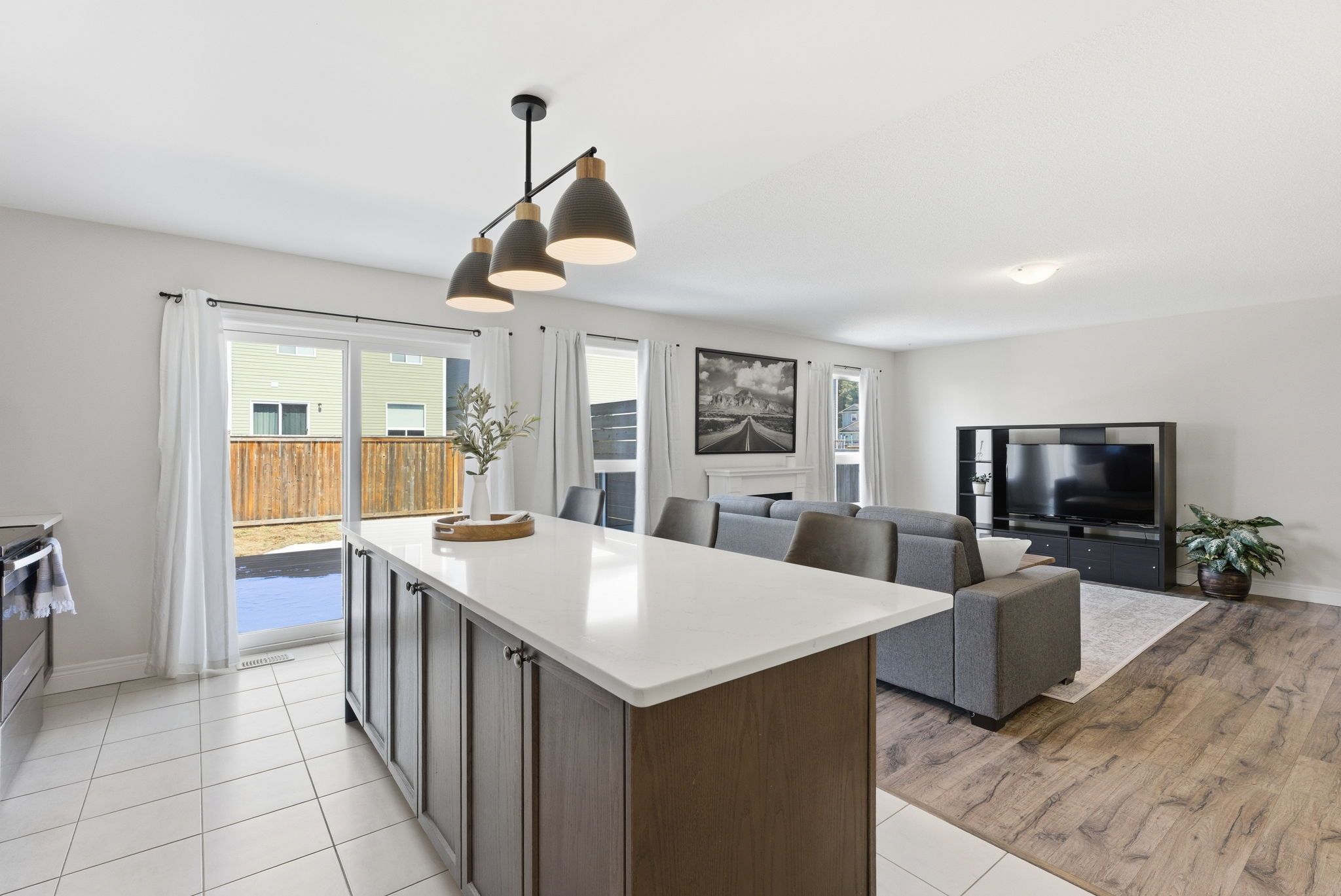 • Bright kitchen with large island, quartz countertops, and ample storage.