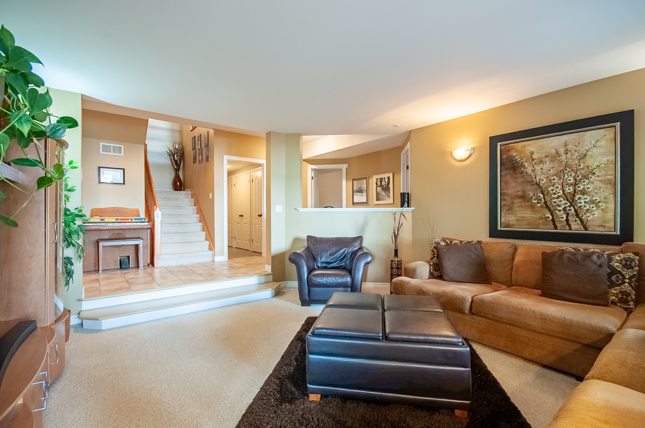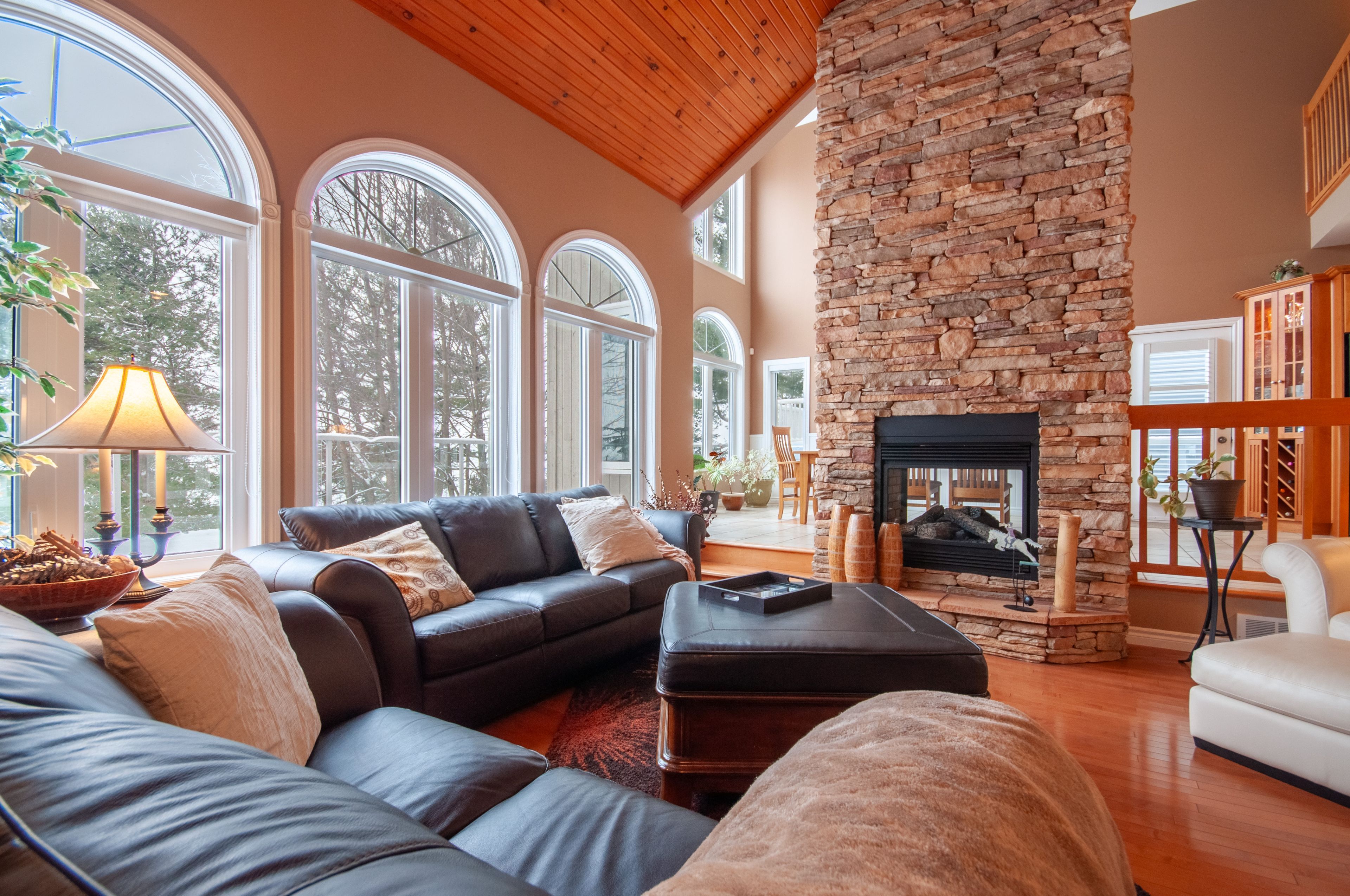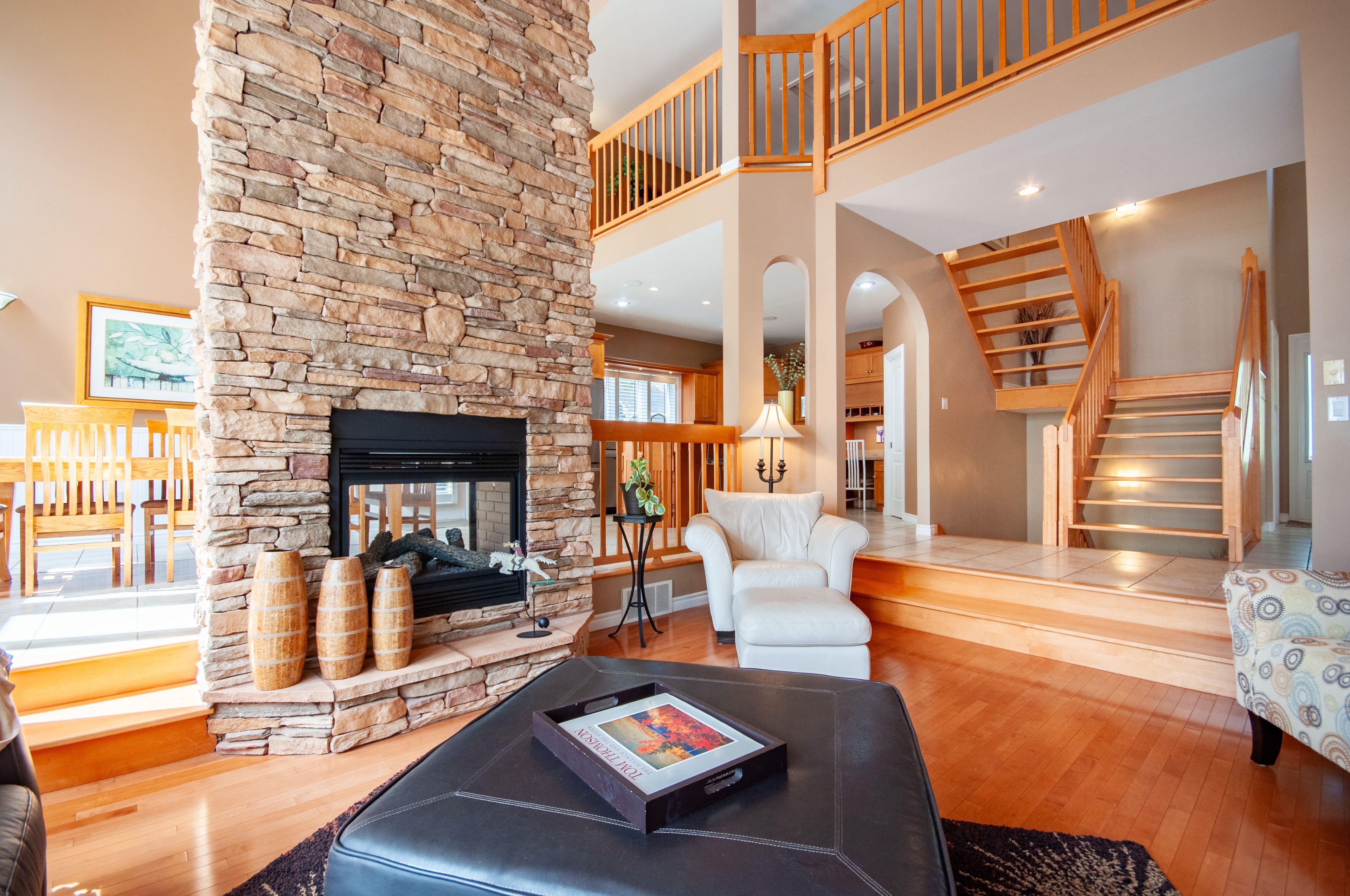 • Spacious main floor with vaulted ceilings and double-sided gas fireplace.