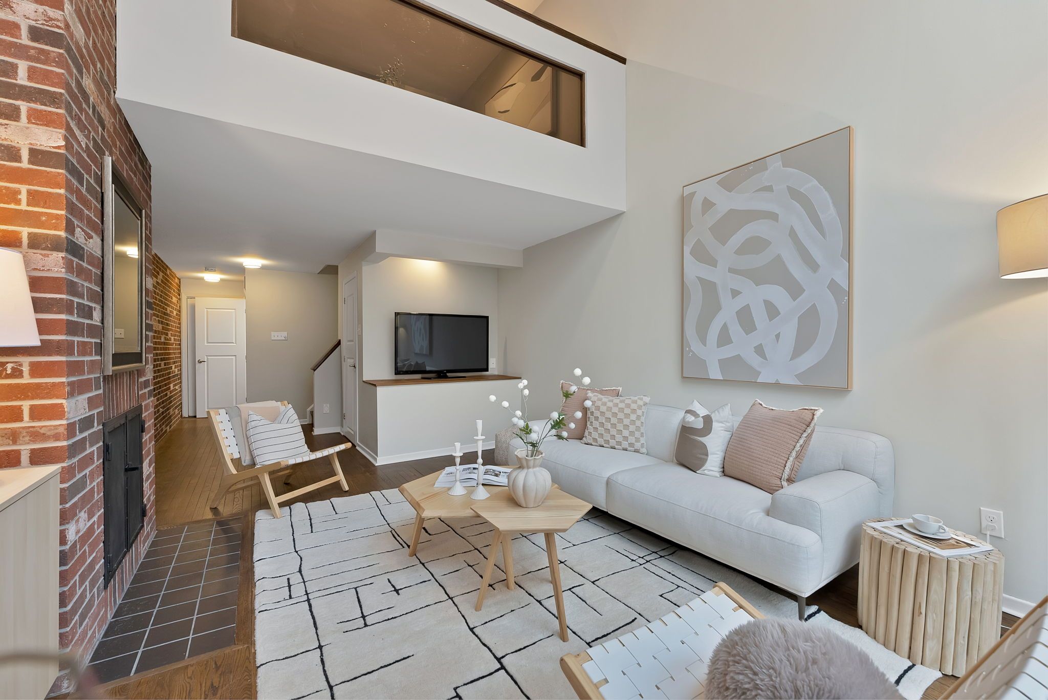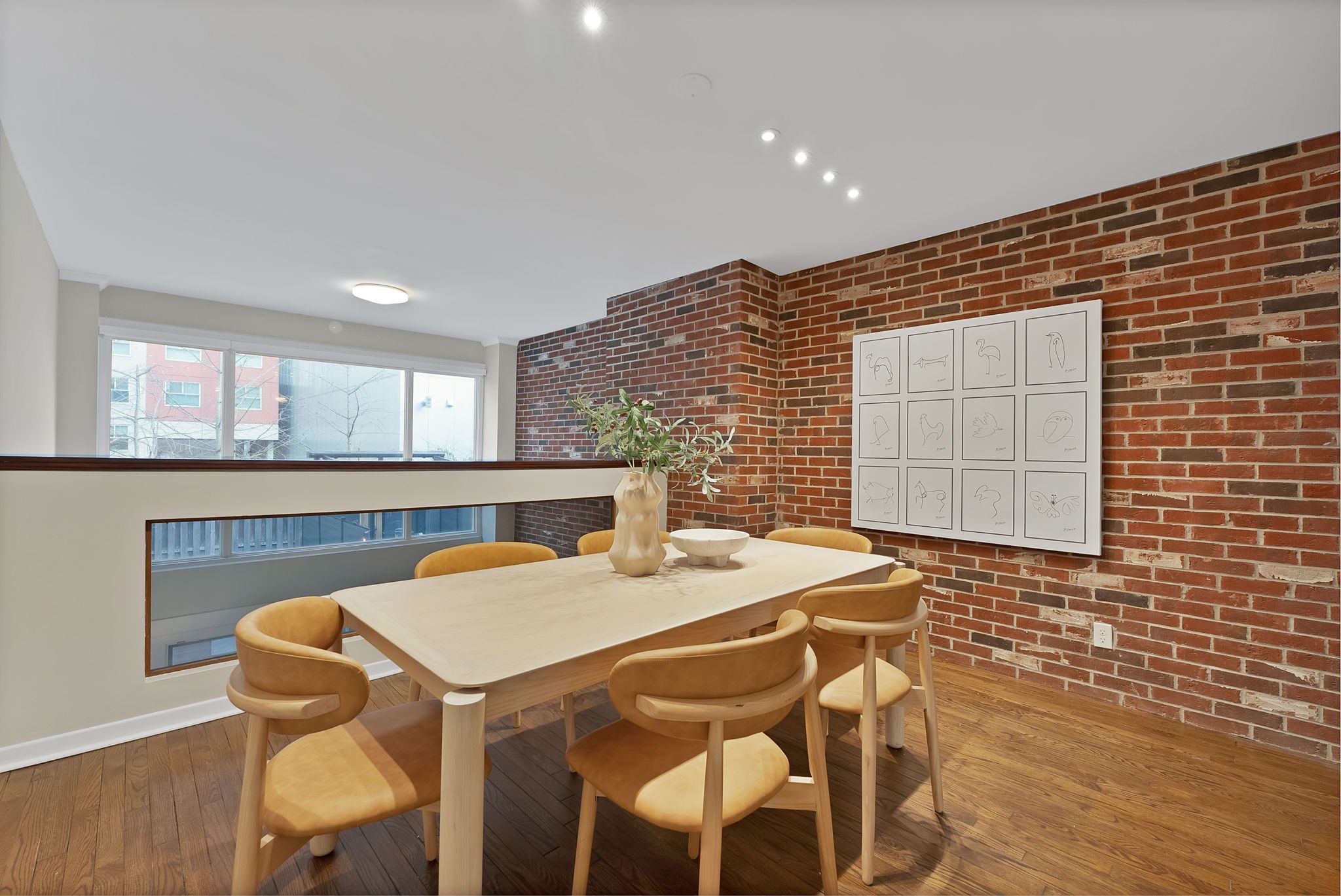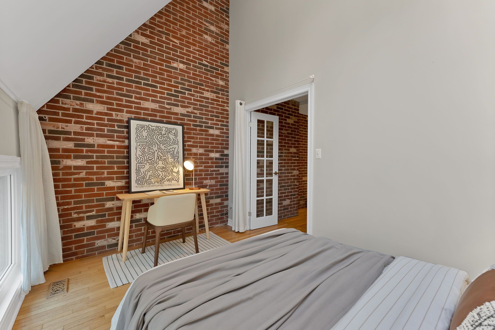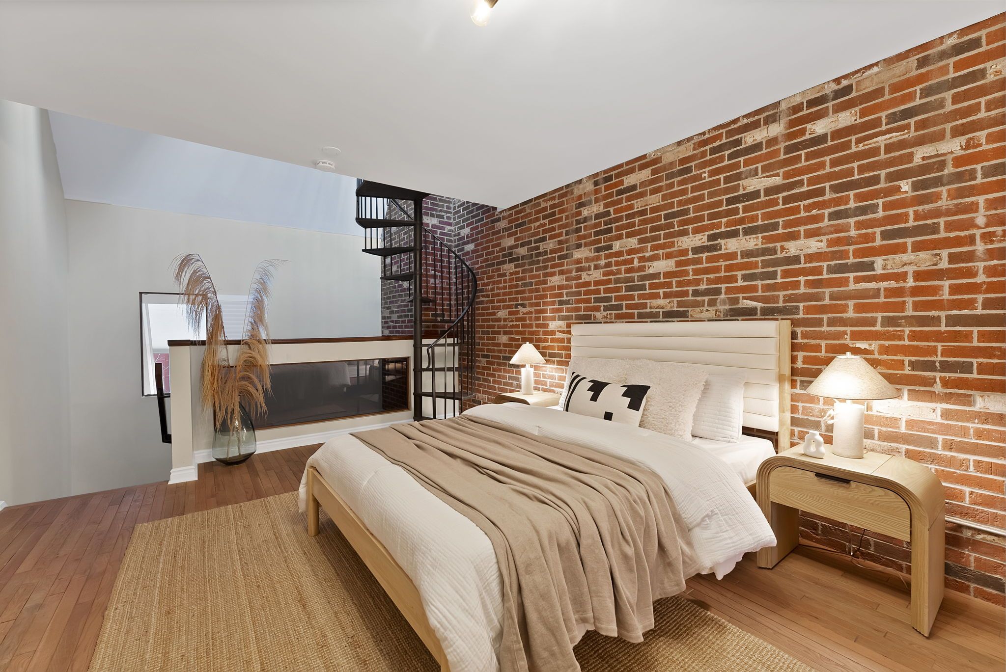 • Bright open-concept living with 16.5-foot ceilings and original exposed brick.