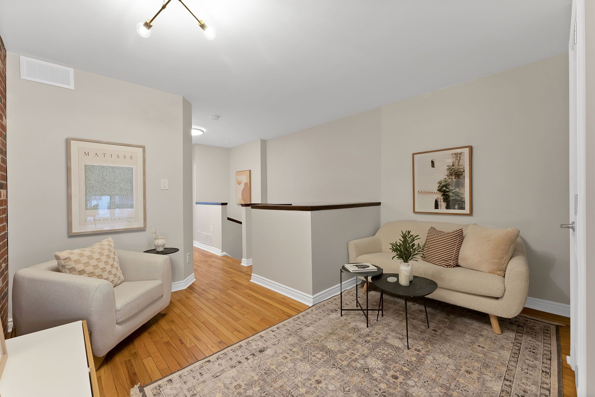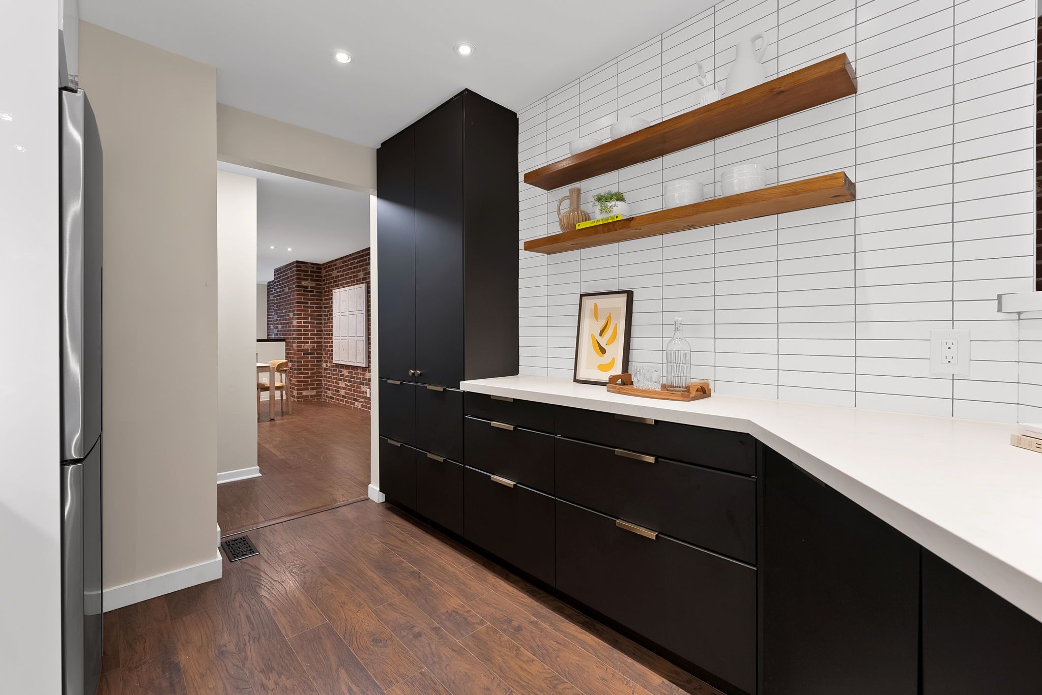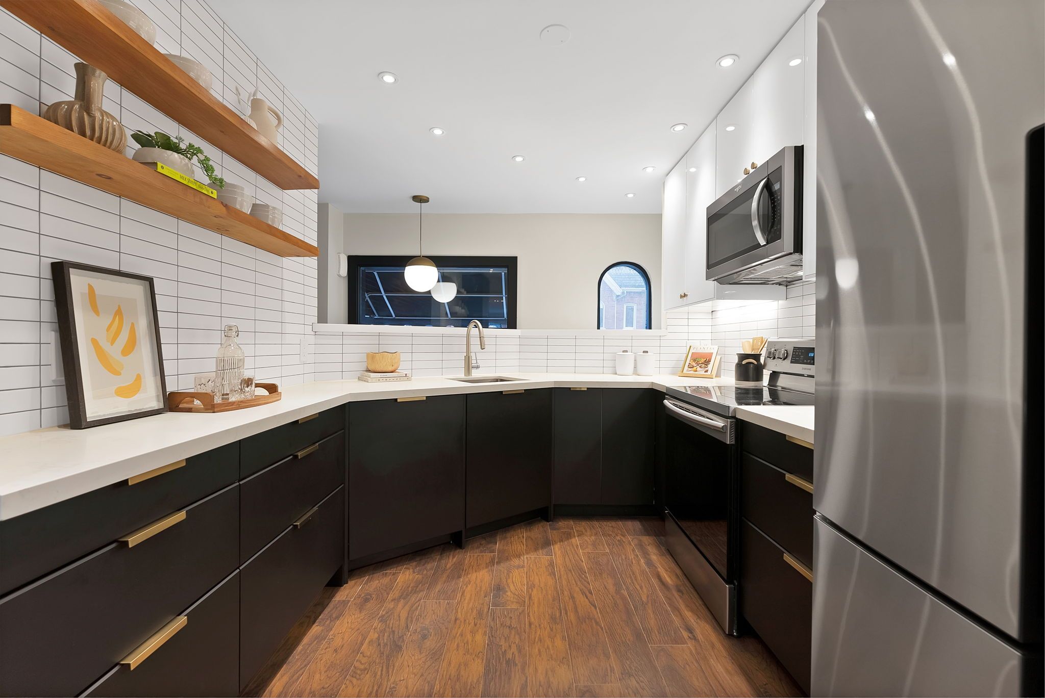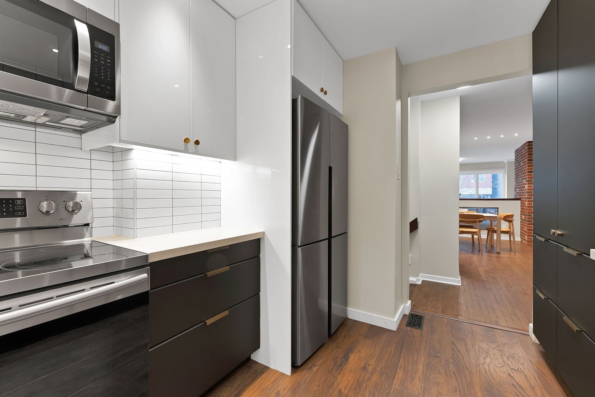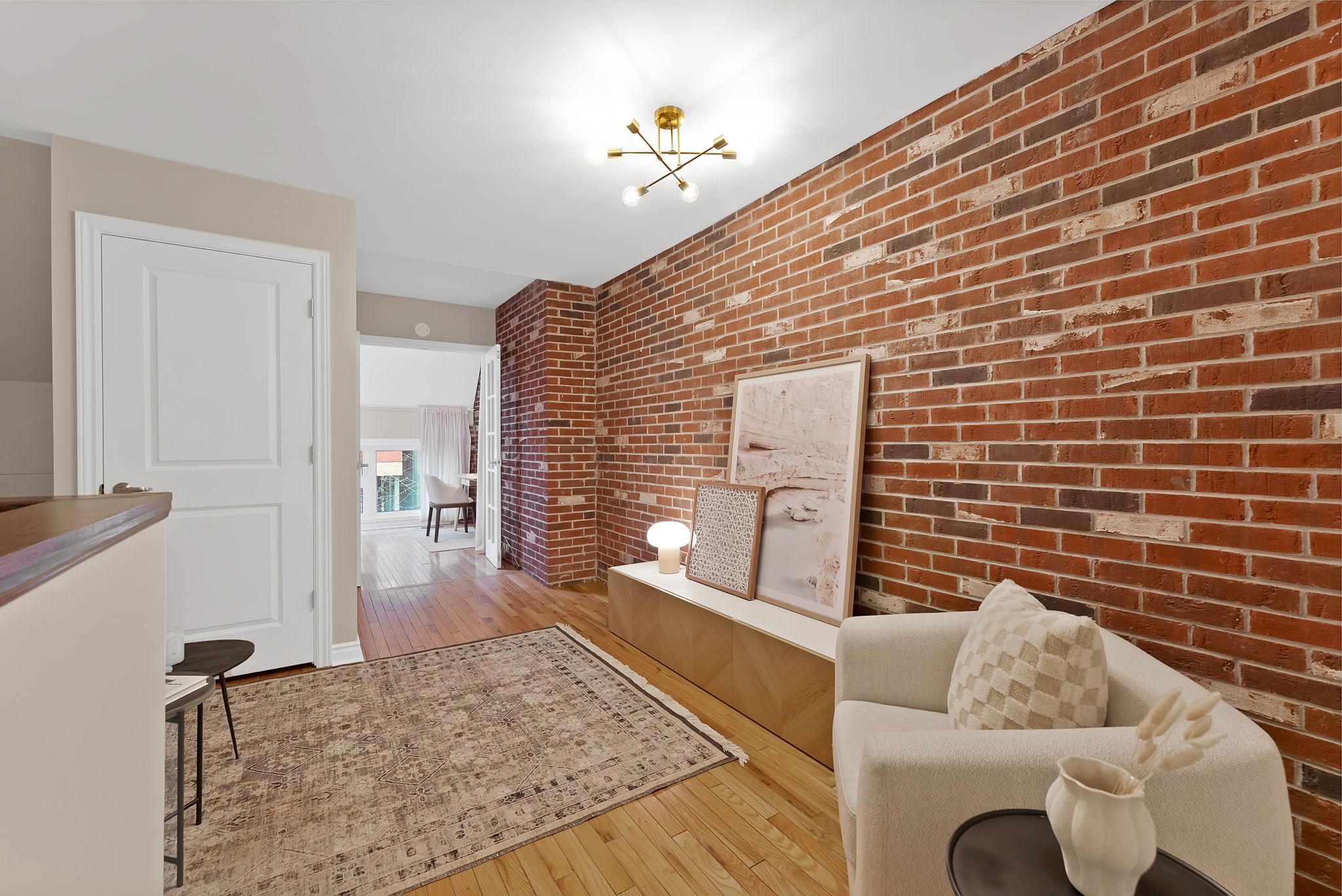 • Bright open-concept living with 16.5-foot ceilings and original exposed brick.