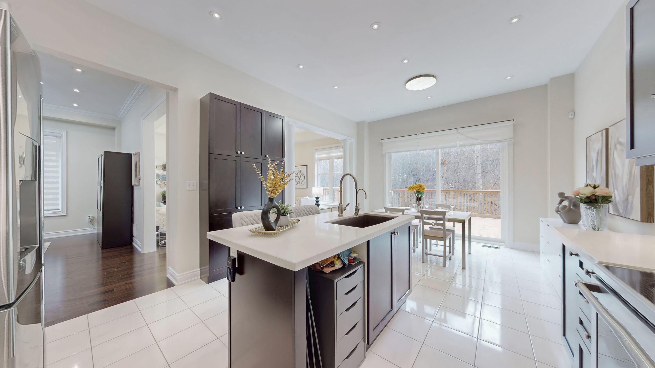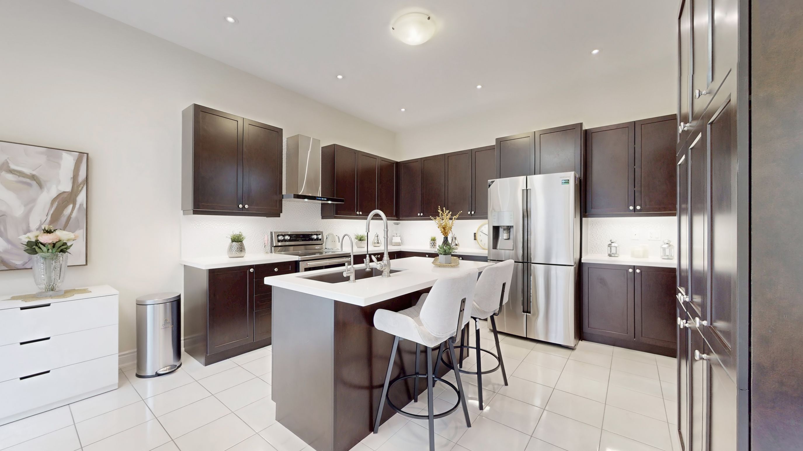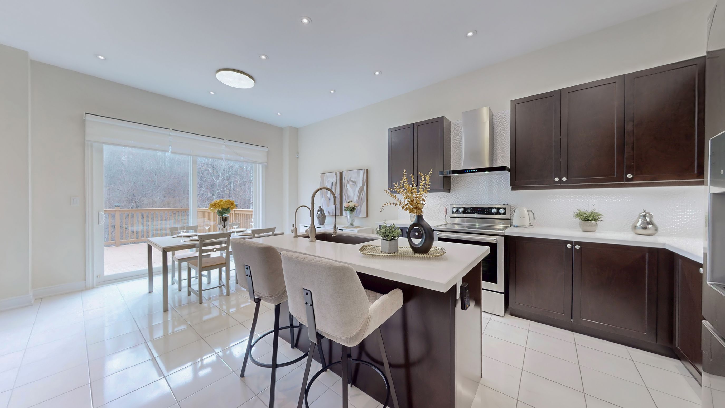 • Modern eat-in kitchen featuring quartz countertops and stainless steel appliances.