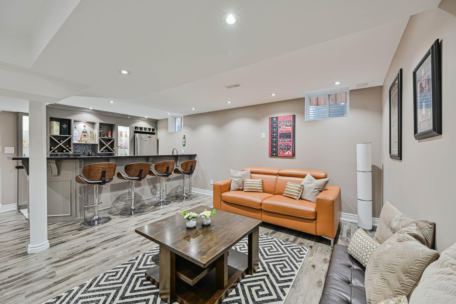 • Finished basement includes a bar and potential rental space.