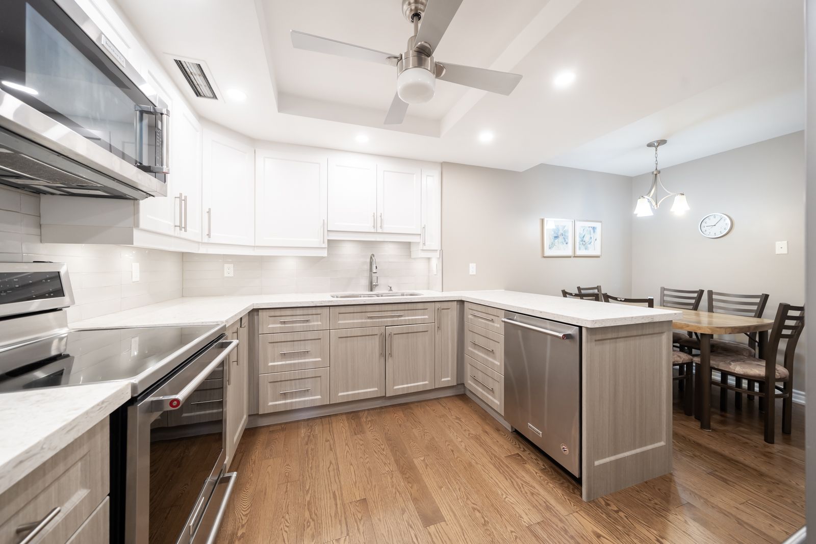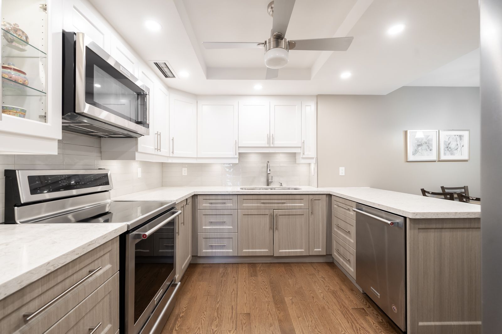 • Custom chef's kitchen with top-of-the-line appliances and cozy eat-in area.