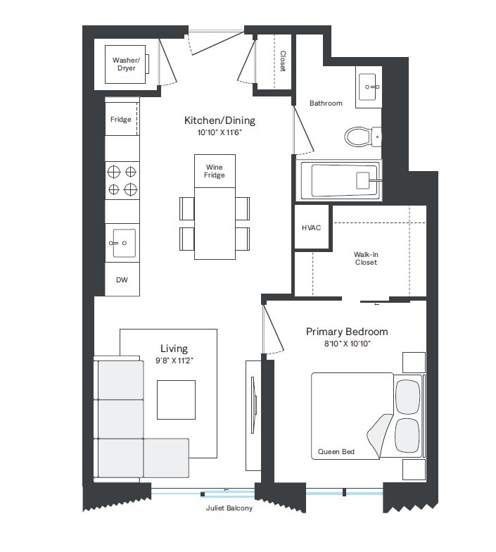 • In-suite washer and dryer plus built-in kitchen island and wine fridge.