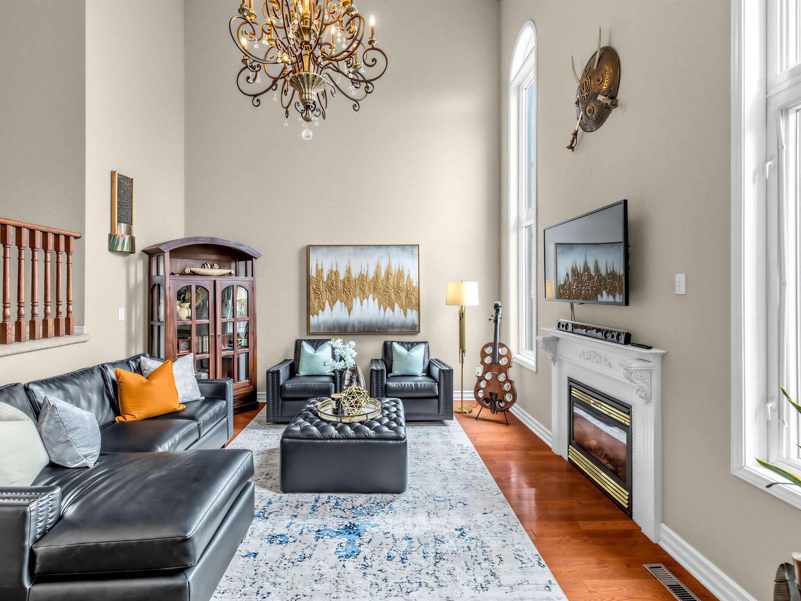 • Impressive 18-ft foyer and family room with a fireplace and large windows.