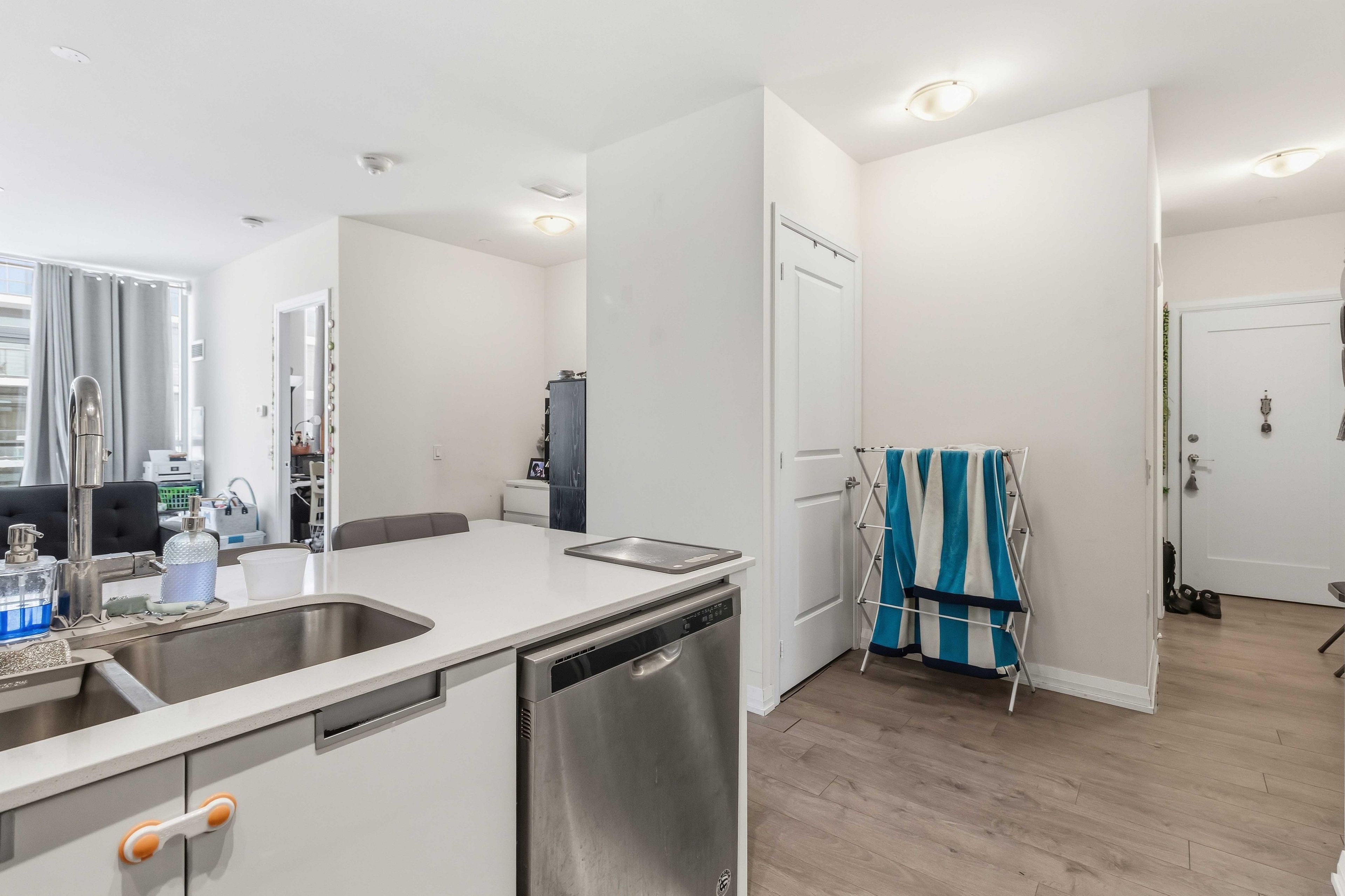 • Modern kitchen with quartz countertops and stainless-steel appliances.