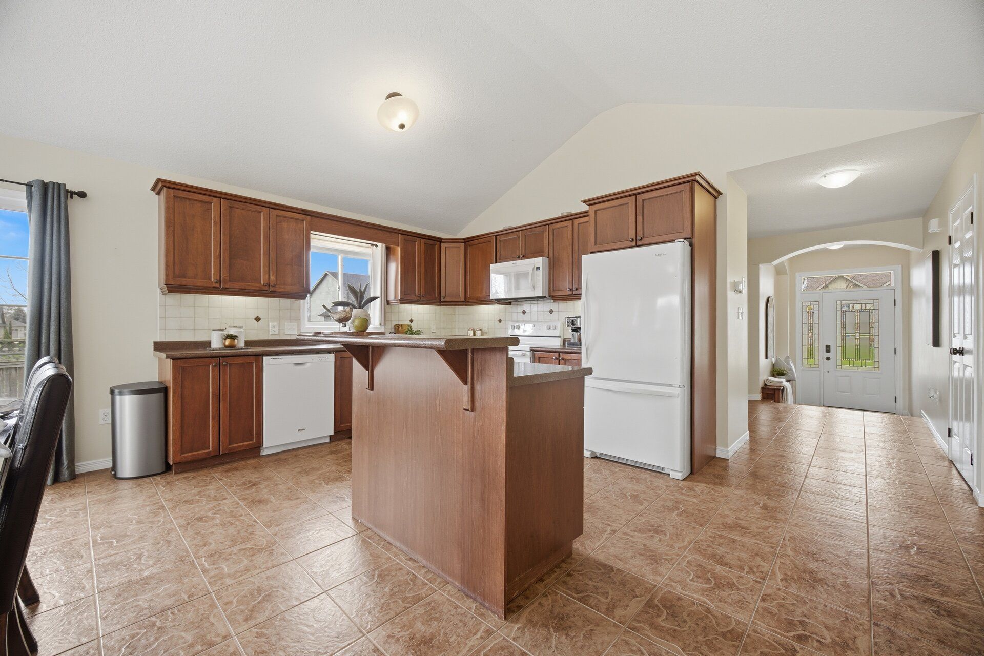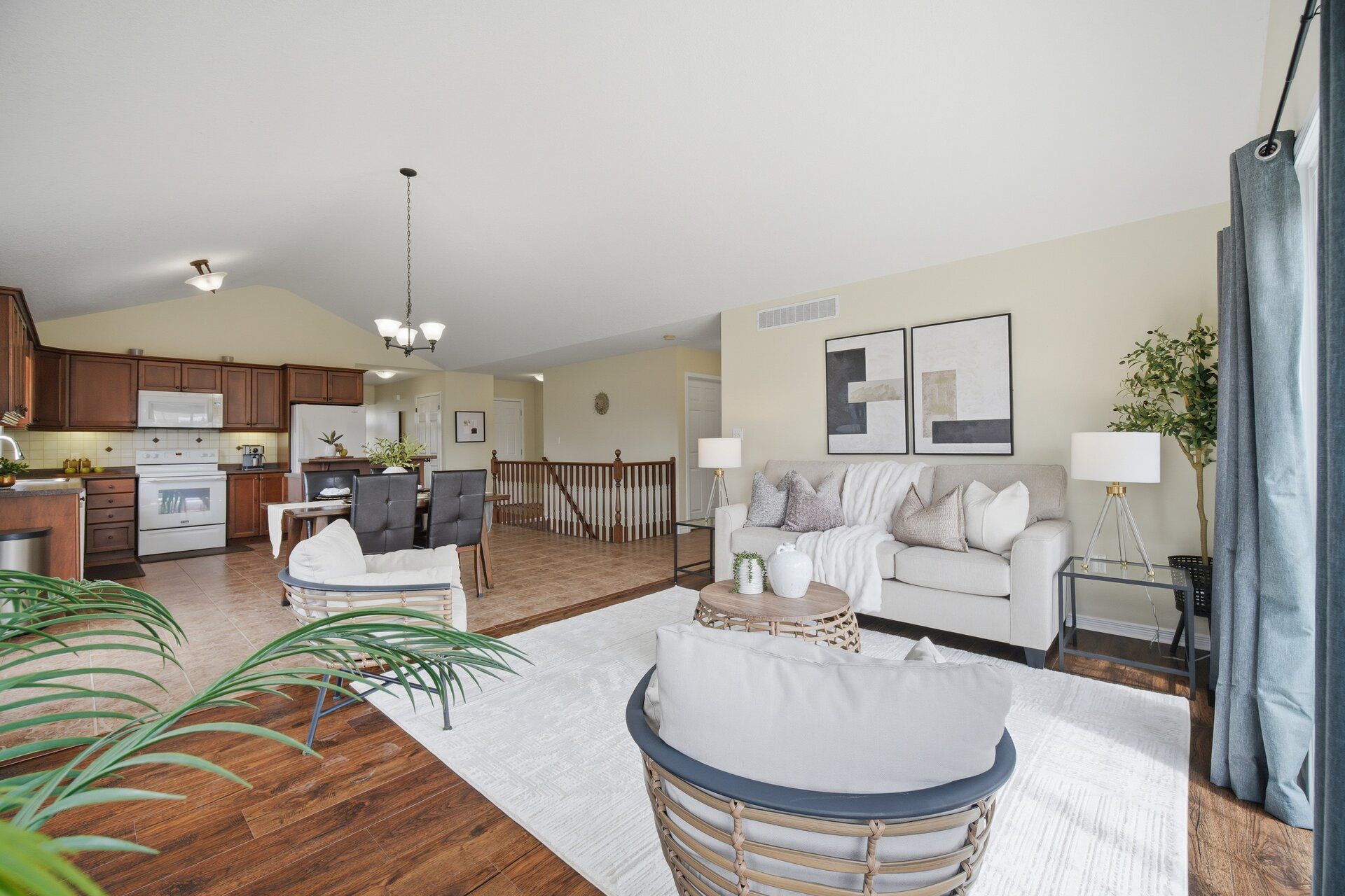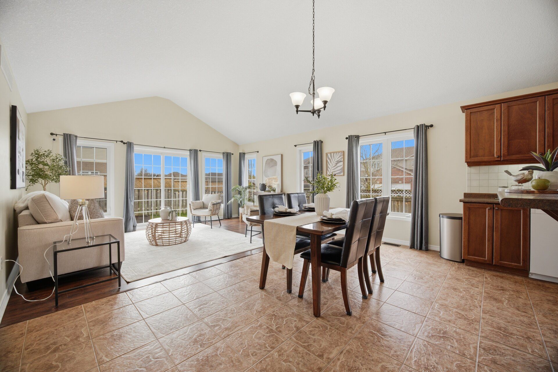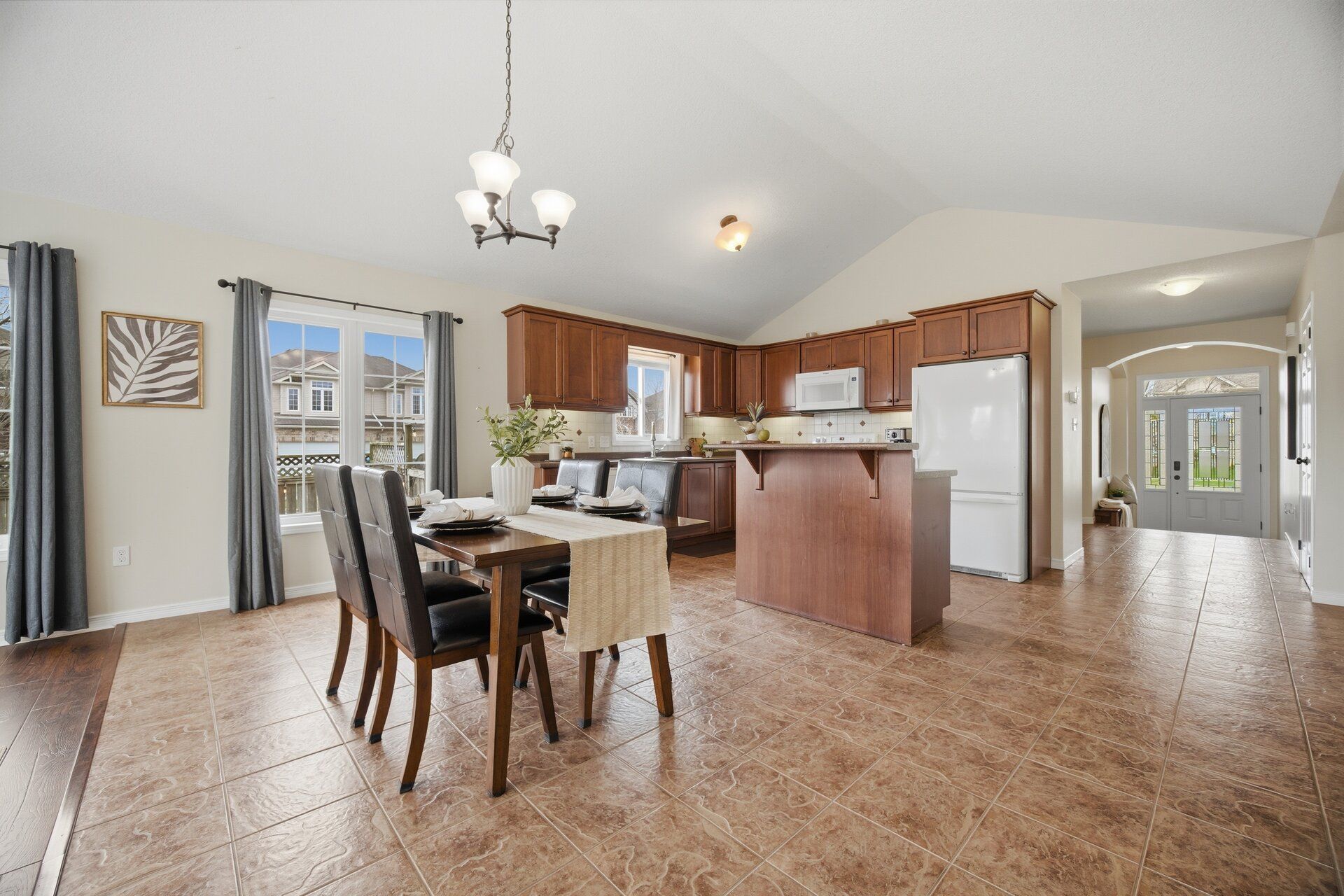 • Bright open-concept layout with high cathedral ceilings for a spacious feel.
