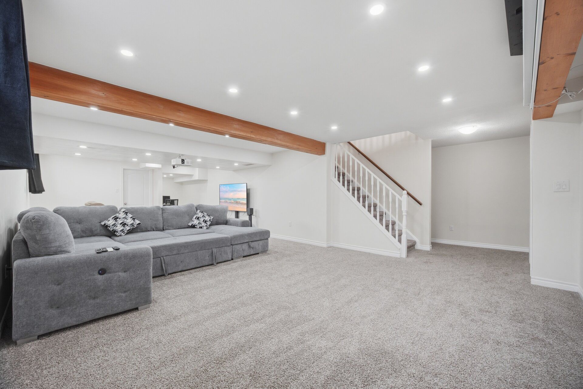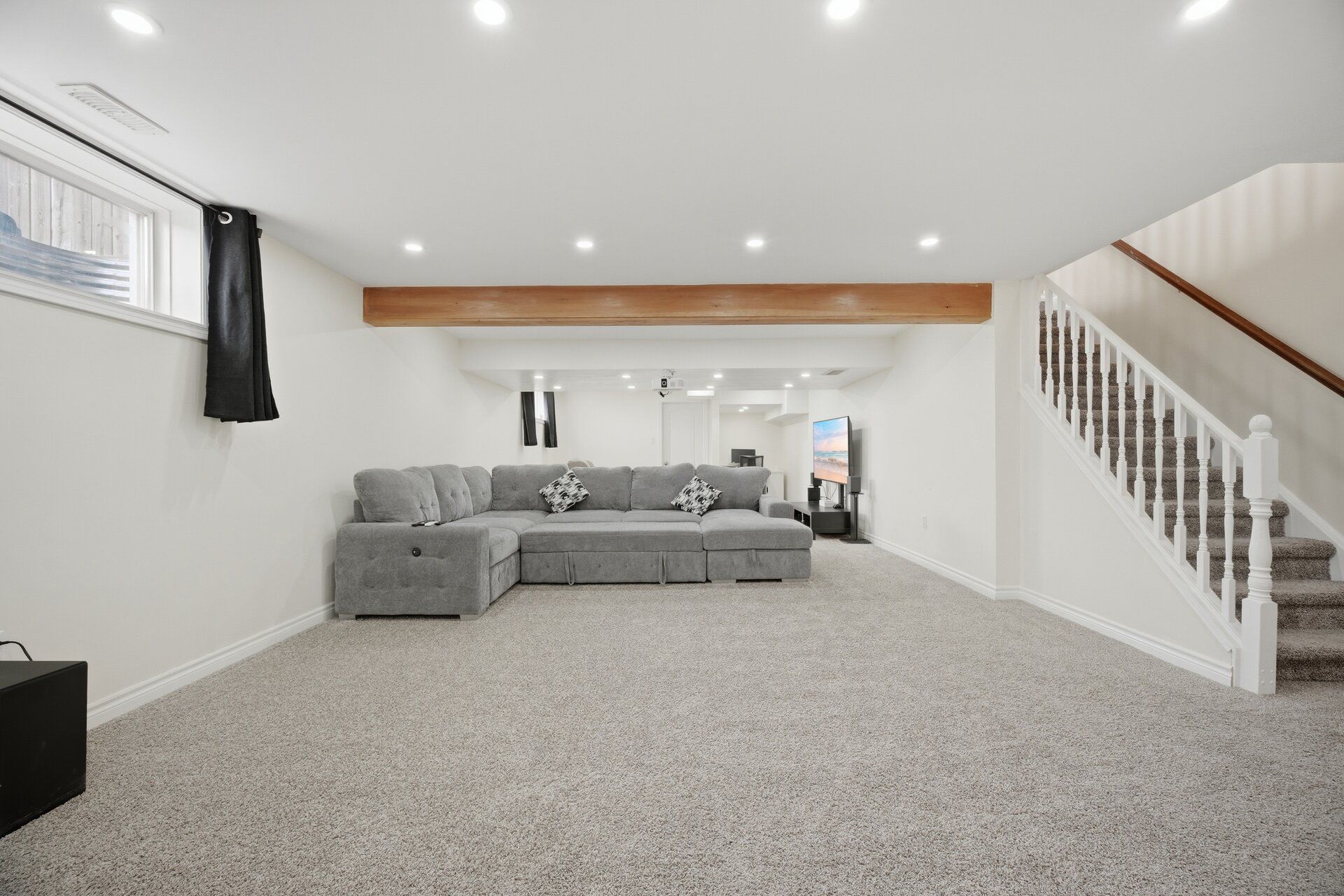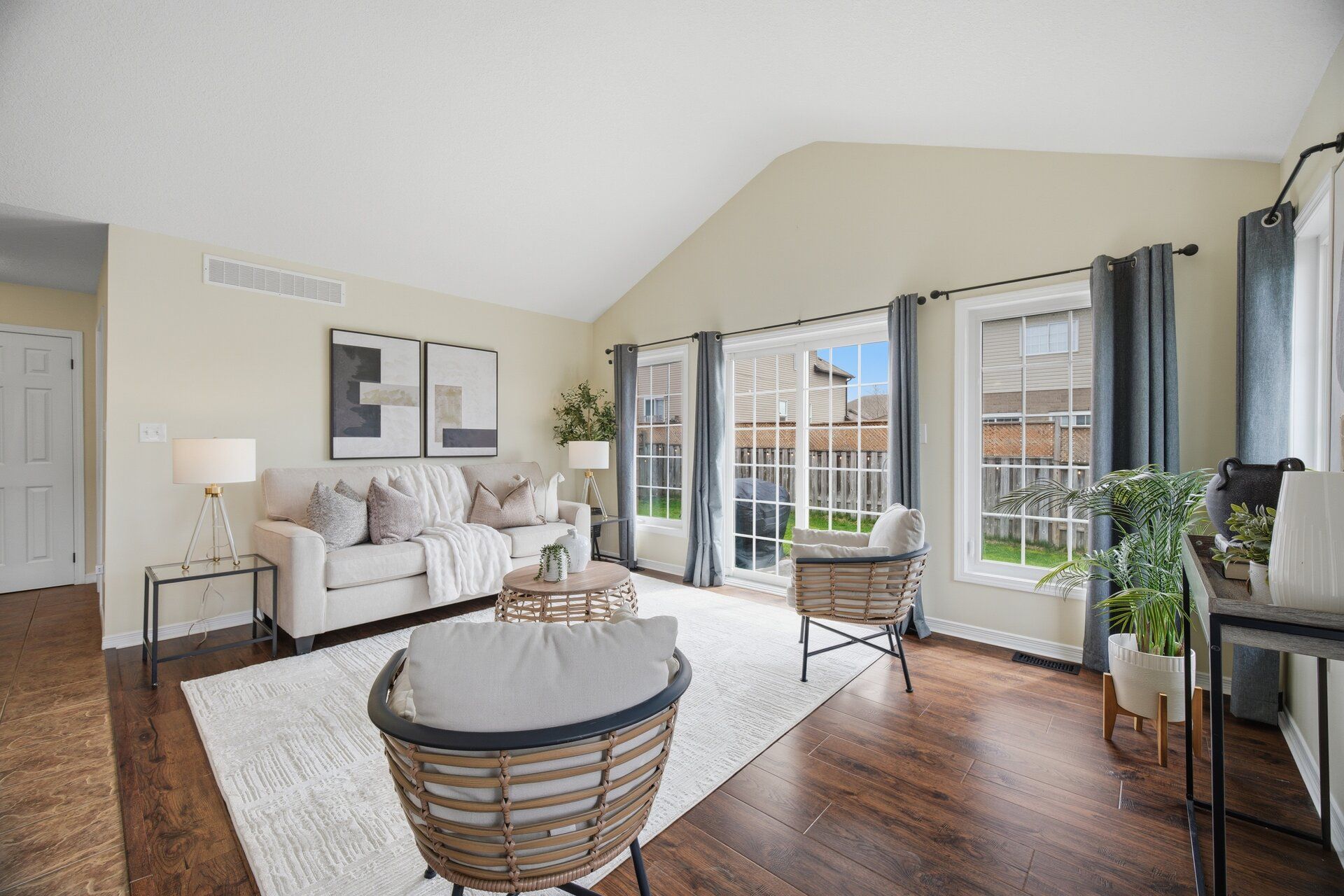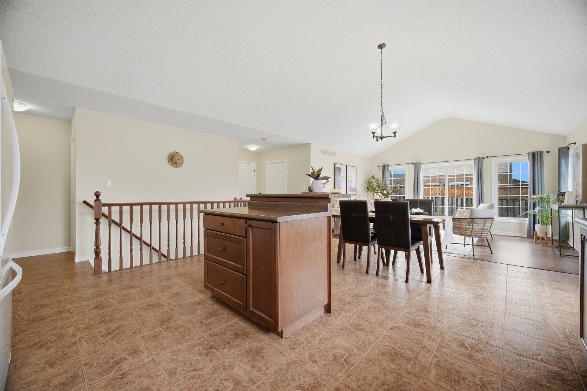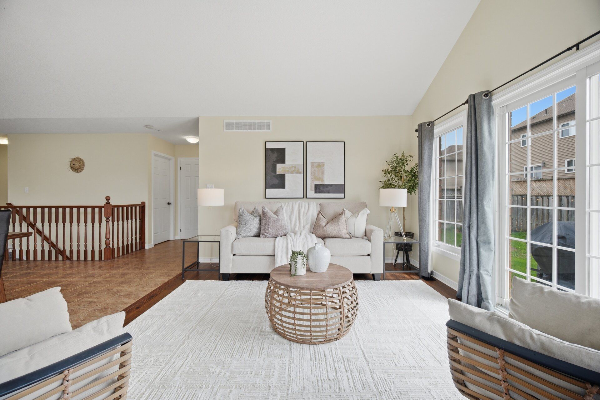 • Bright open-concept layout with high cathedral ceilings for a spacious feel.
