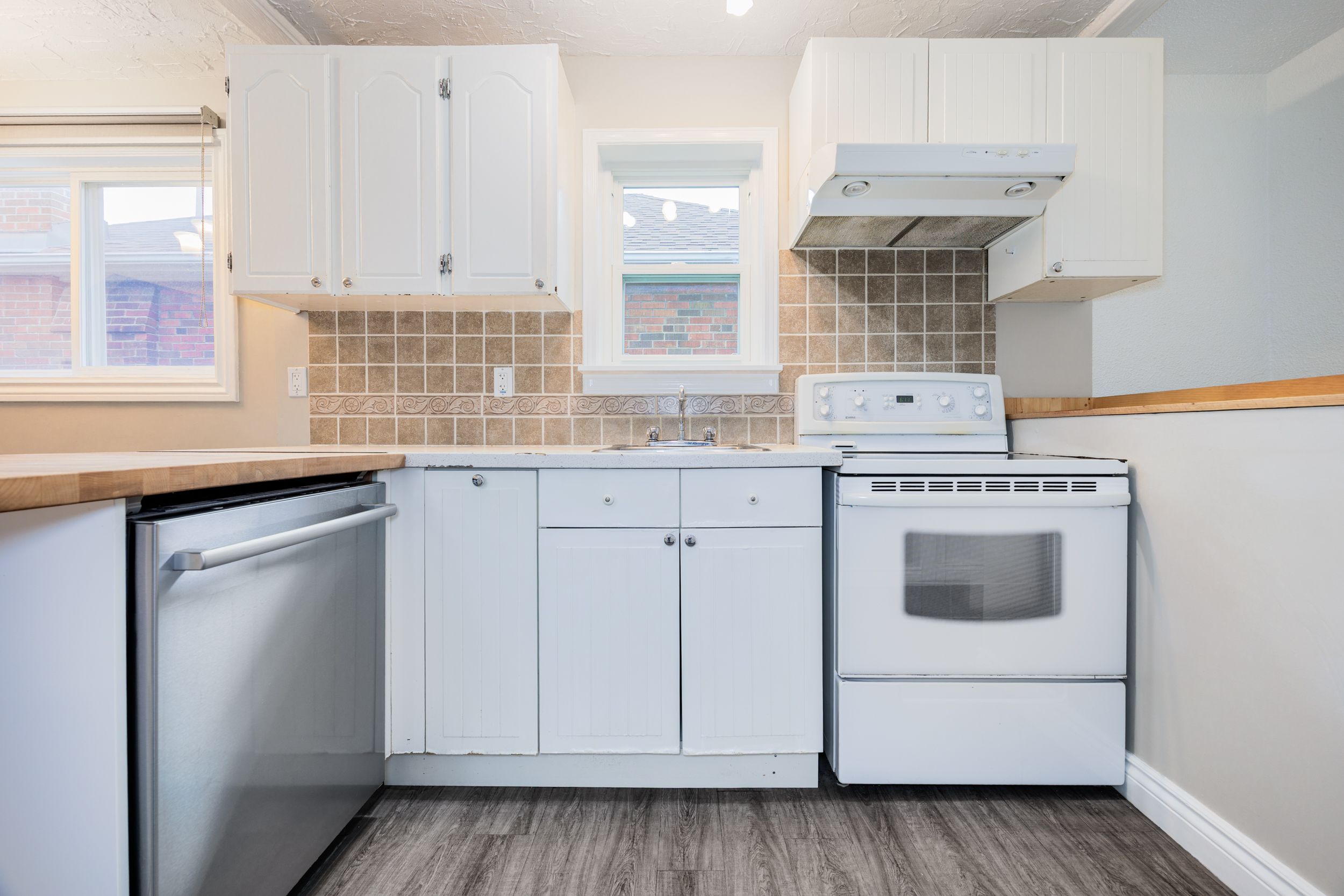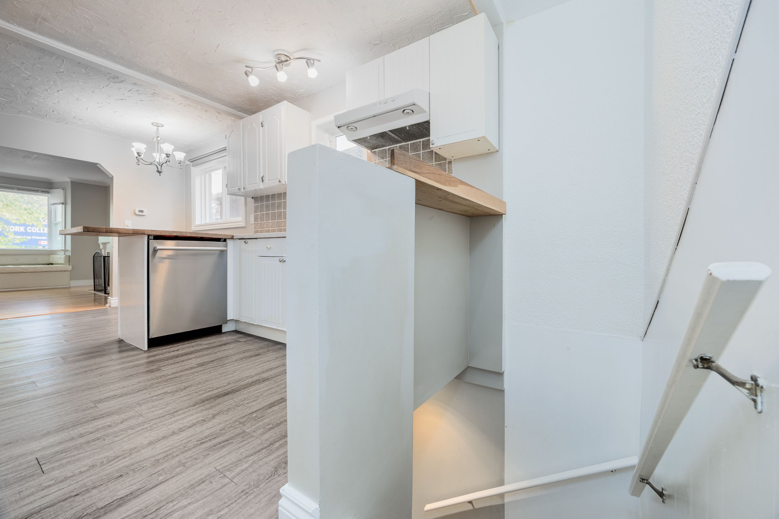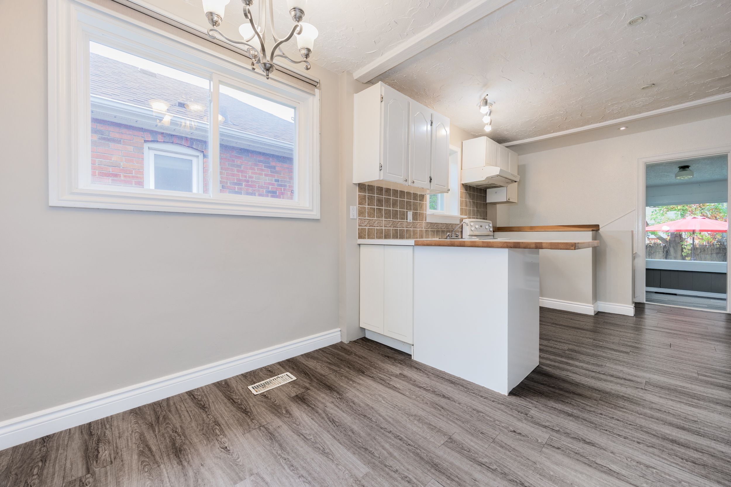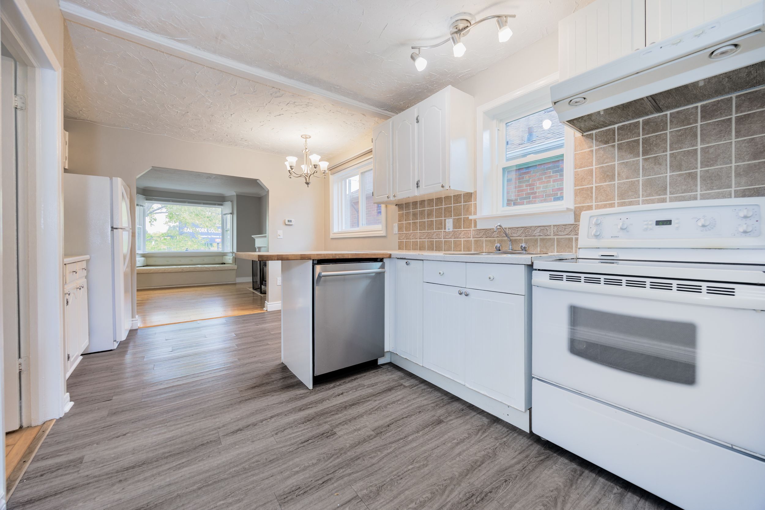 • Modern eat-in kitchen featuring a butcher block breakfast bar and natural light.