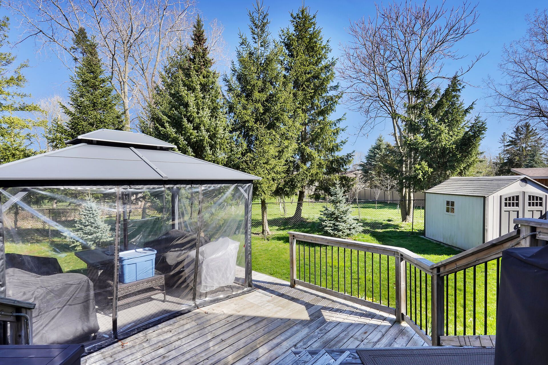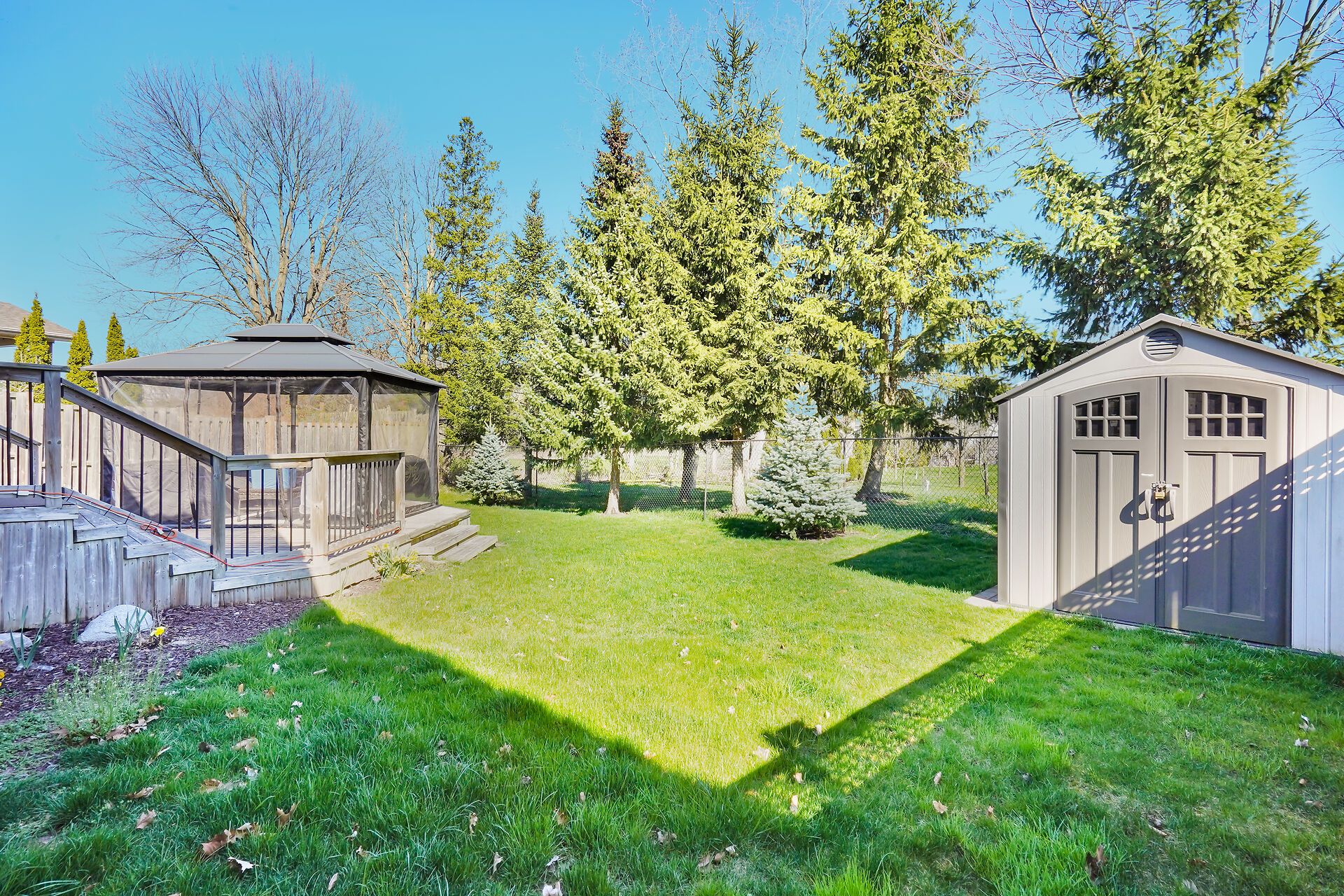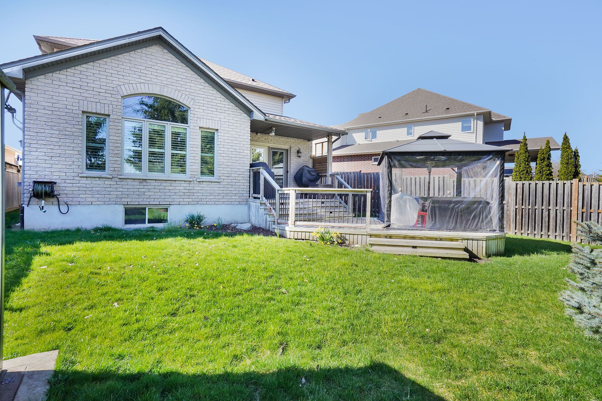Spectacular lambeth court location with pie lot. Stunning curb appeal. This former artisan model home comes fully finished. Gracious open foyer welcomes you inside, enjoy the 9ft ceilings throughout main, main floor laundry, custom kitchen with granite counters overlooking family room with gas fireplace, dining room, and eating area with terrace doors to 2-tiered deck with gazebo. Fully fenced yard, very private. 3 large bedrooms upstairs with primary bedroom with walk-in closet and private 5-piece ensuite bath, also jack & jill 4-piece bath between the 2 other bedrooms. Lower-level games room and rec-room, plus bedroom and 4-piece bath, wired for 5. 1 surround sound. All standing cabinets included in basement hallway. Wrought iron railings, transom windows.
