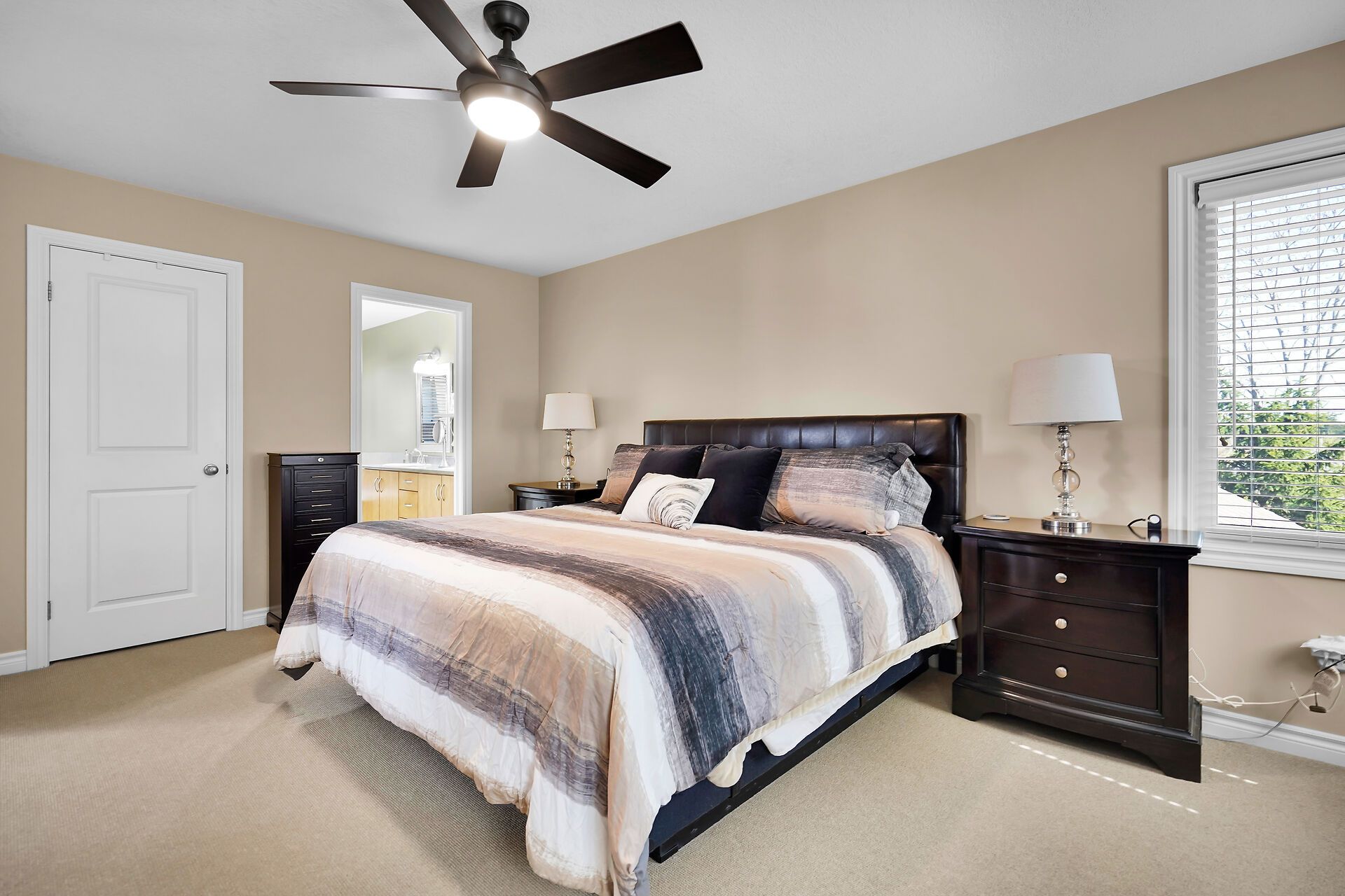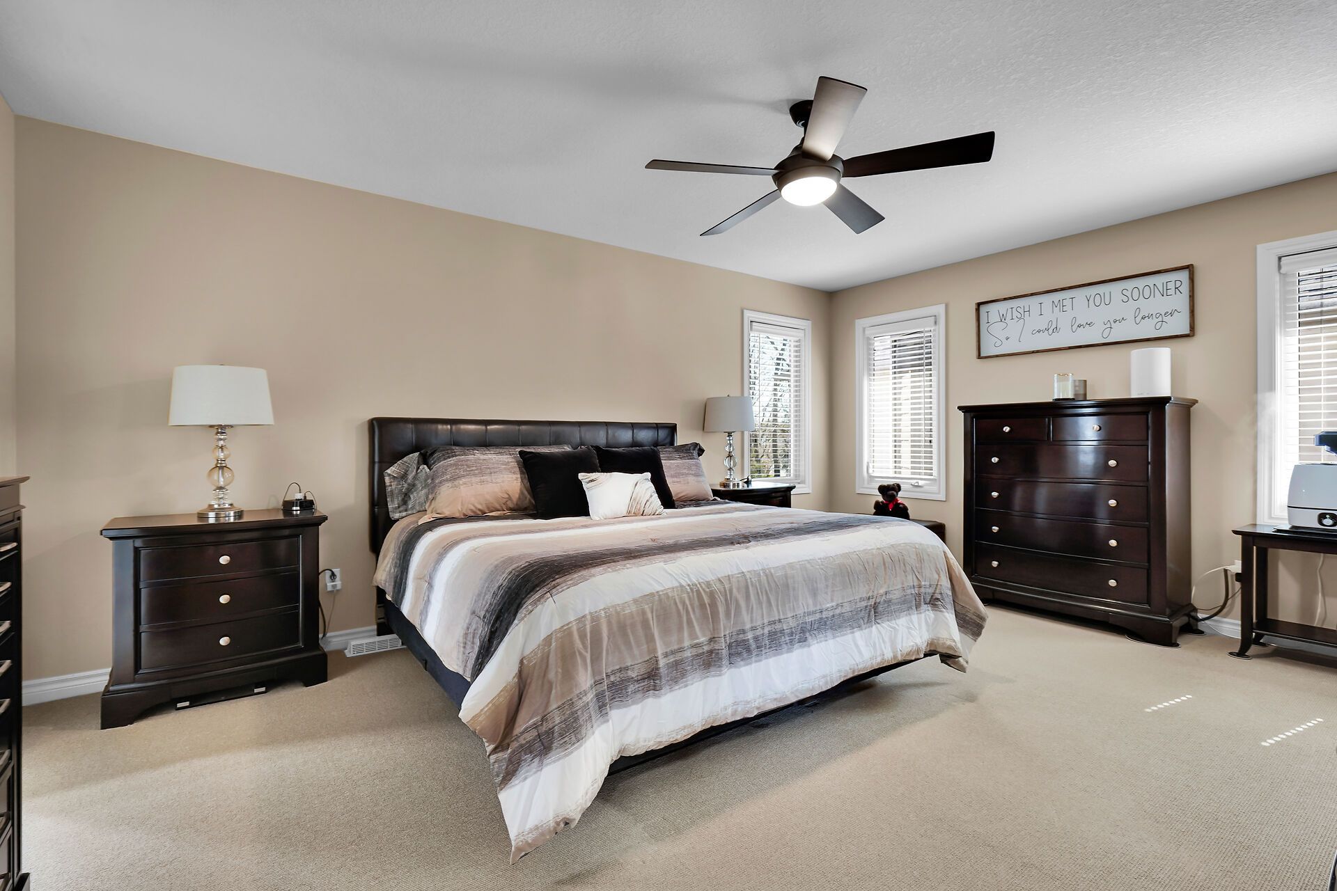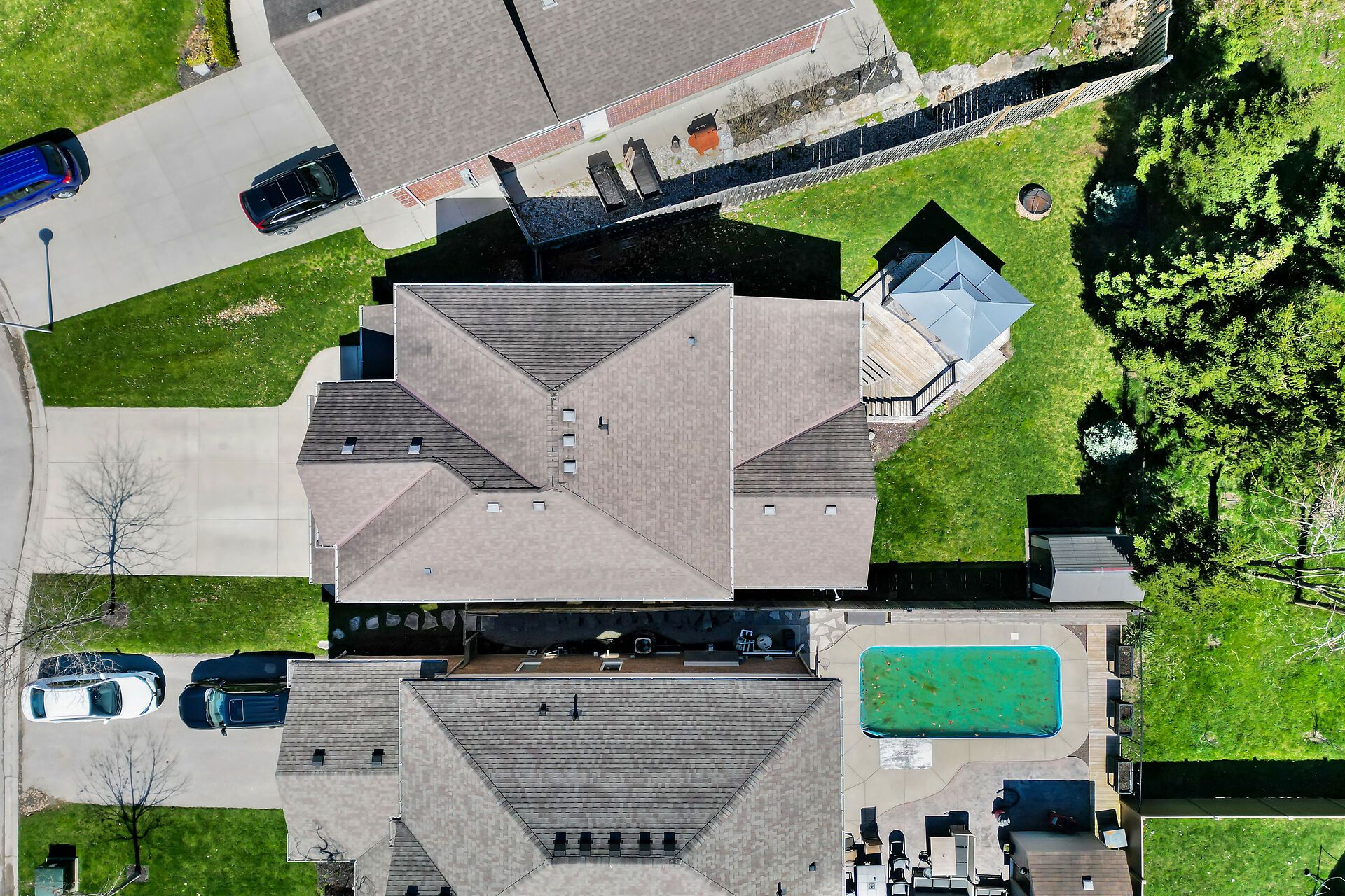Spectacular lambeth court location with pie lot. Stunning curb appeal. This former artisan model home comes fully finished. Gracious open foyer welcomes you inside, enjoy the 9ft ceilings throughout main, main floor laundry, custom kitchen with granite counters overlooking family room with gas fireplace, dining room, and eating area with terrace doors to 2-tiered deck with gazebo. Fully fenced yard, very private. 3 large bedrooms upstairs with primary bedroom with walk-in closet and private 5-piece ensuite bath, also jack & jill 4-piece bath between the 2 other bedrooms. Lower-level games room and rec-room, plus bedroom and 4-piece bath, wired for 5. 1 surround sound. All standing cabinets included in basement hallway. Wrought iron railings, transom windows.